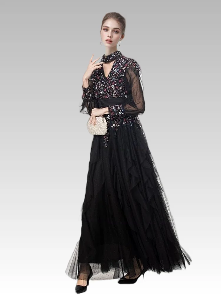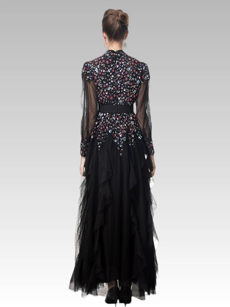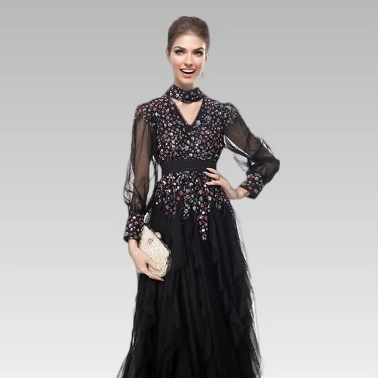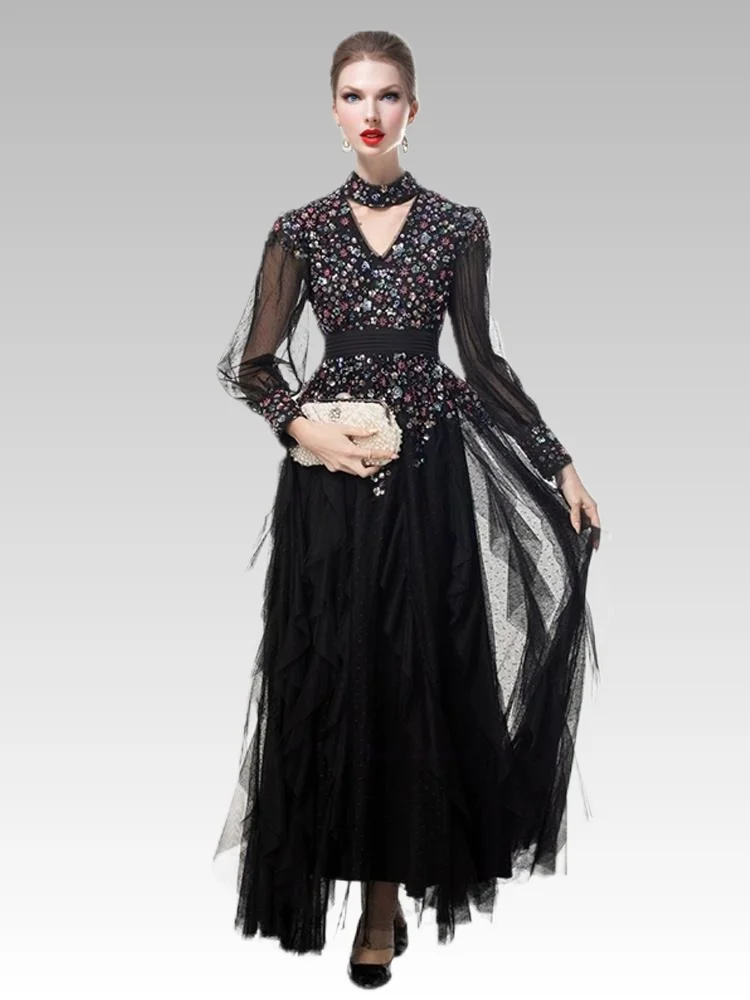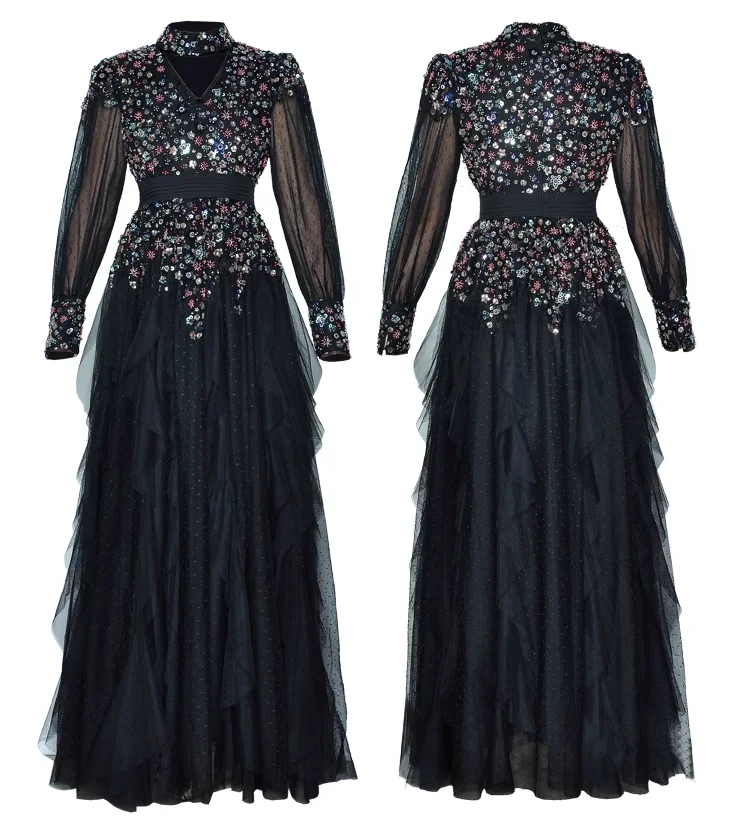 2026S Luxury Women's Casual Elegant Swing Dress V-Neck Halter Long Sleeve Heavy Beaded Sequins Sexy Hollow Waisted Party Empire