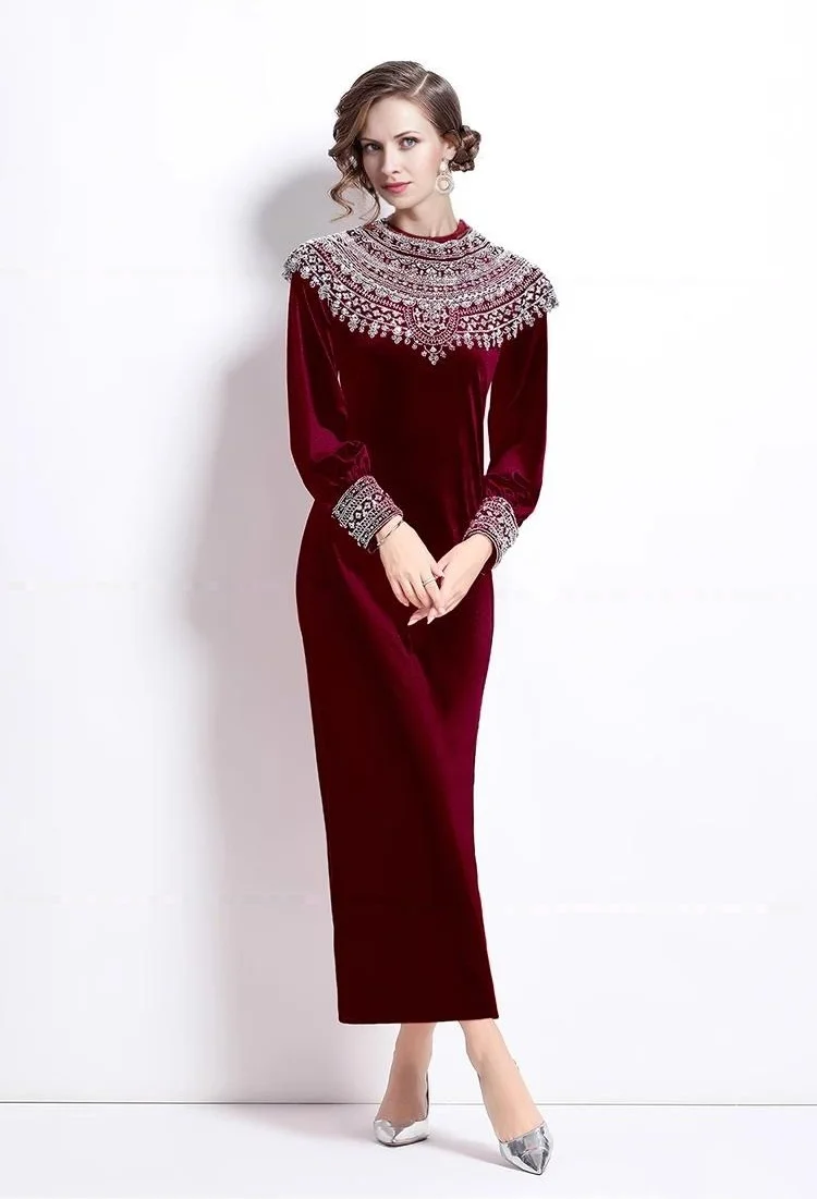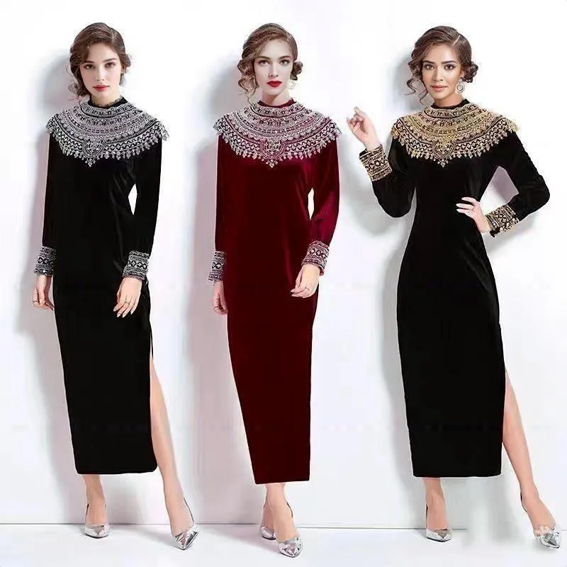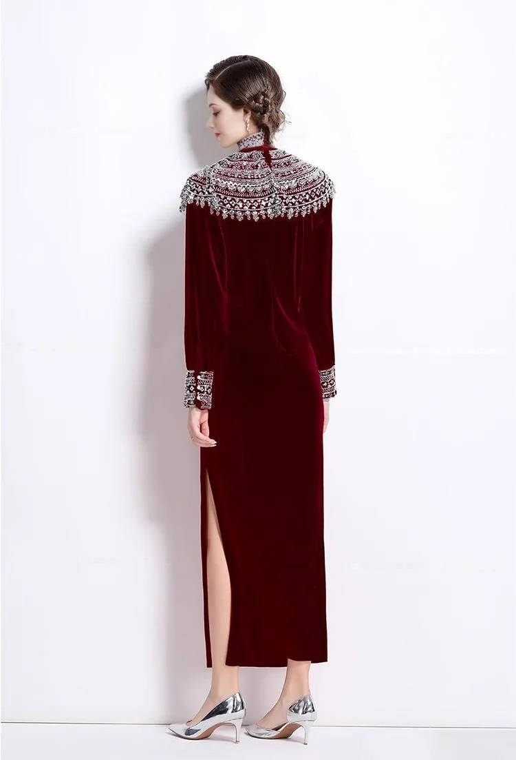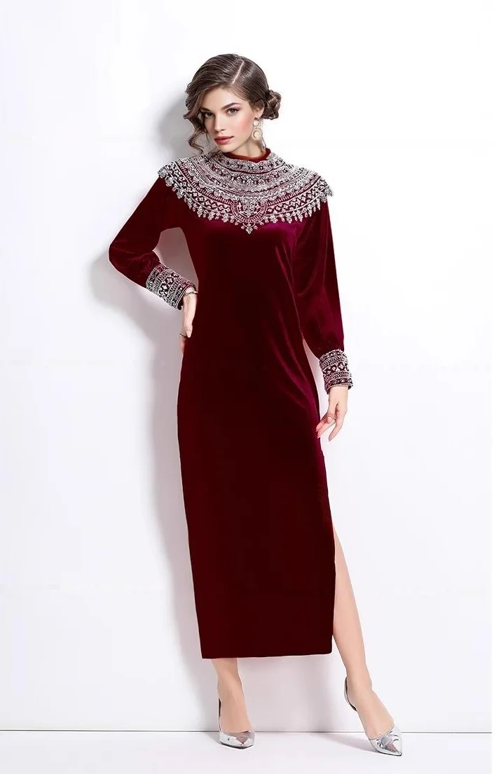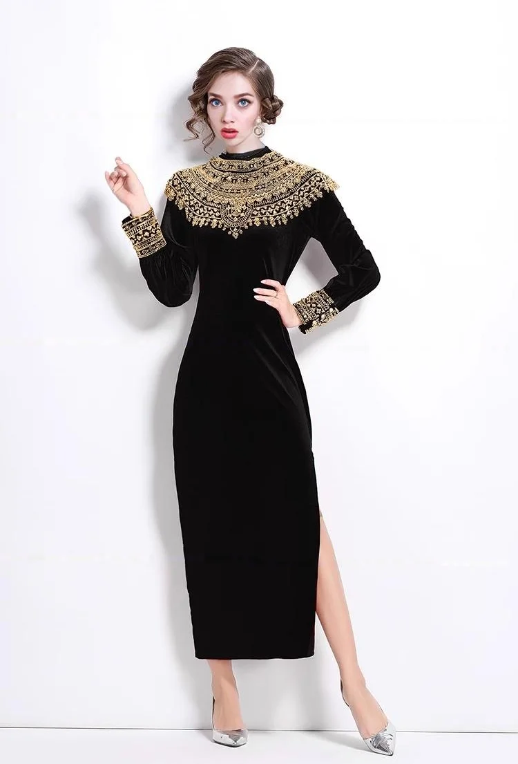 2026F/W Luxury Women's Floor-Length A-Line Dress Top Trend Fashionable Heavy Sequin Embroidery Long Sleeves Velvet Slimming Slit