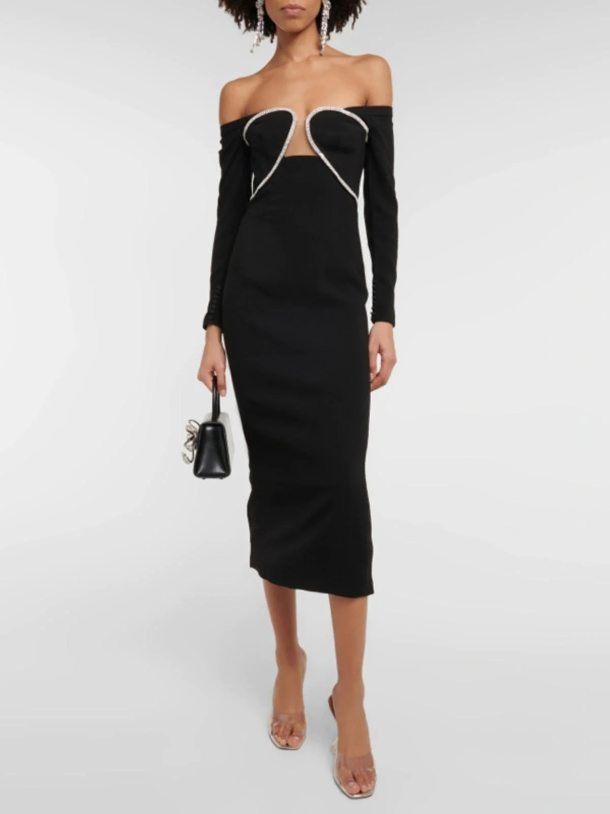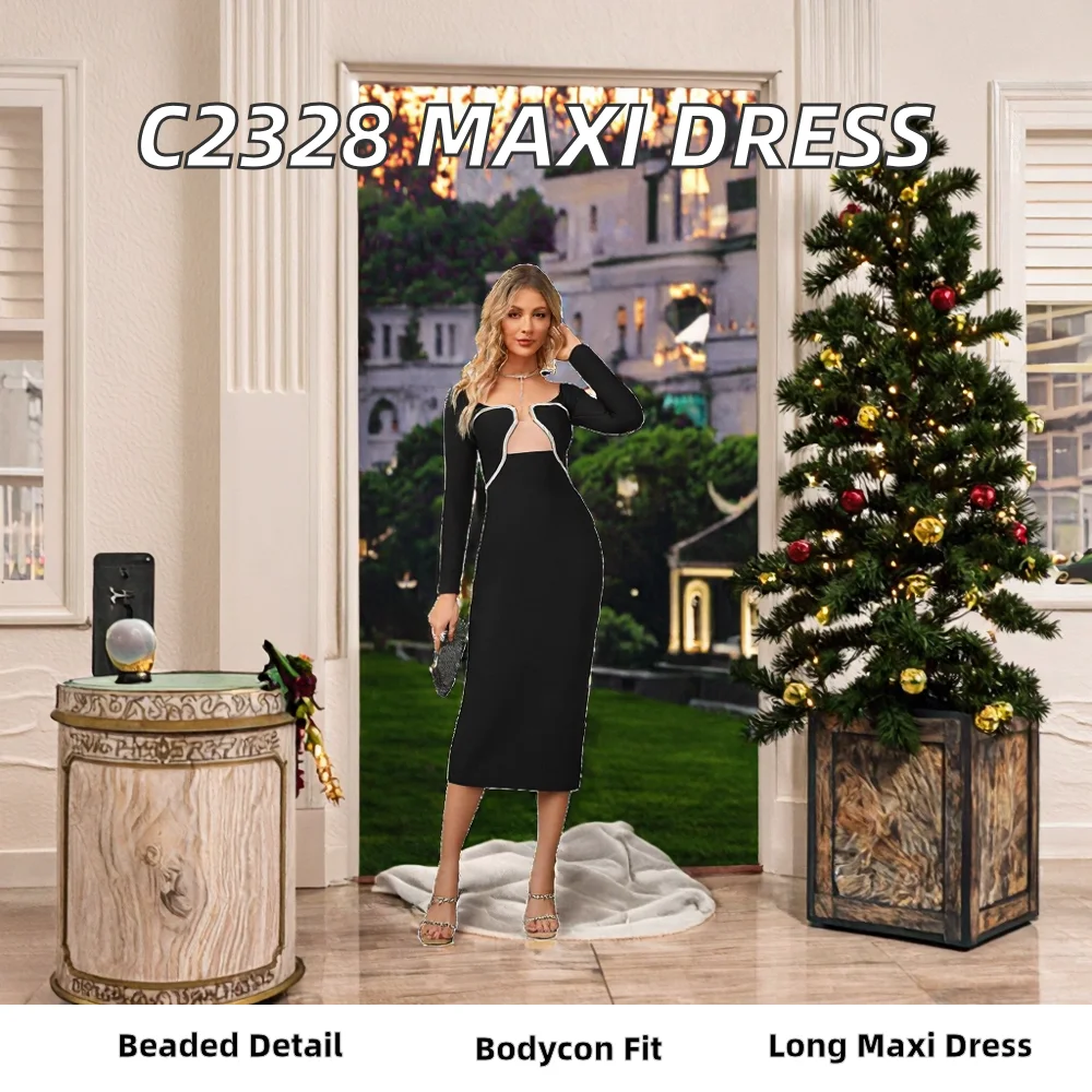 C2328 Black Square Neck Maxi for Bandage Dress Elegant Soft Maxi Bodycon Crystal Beading Empire Long Sleeve Party for Spring