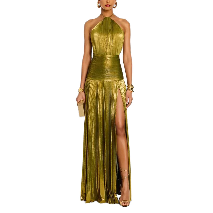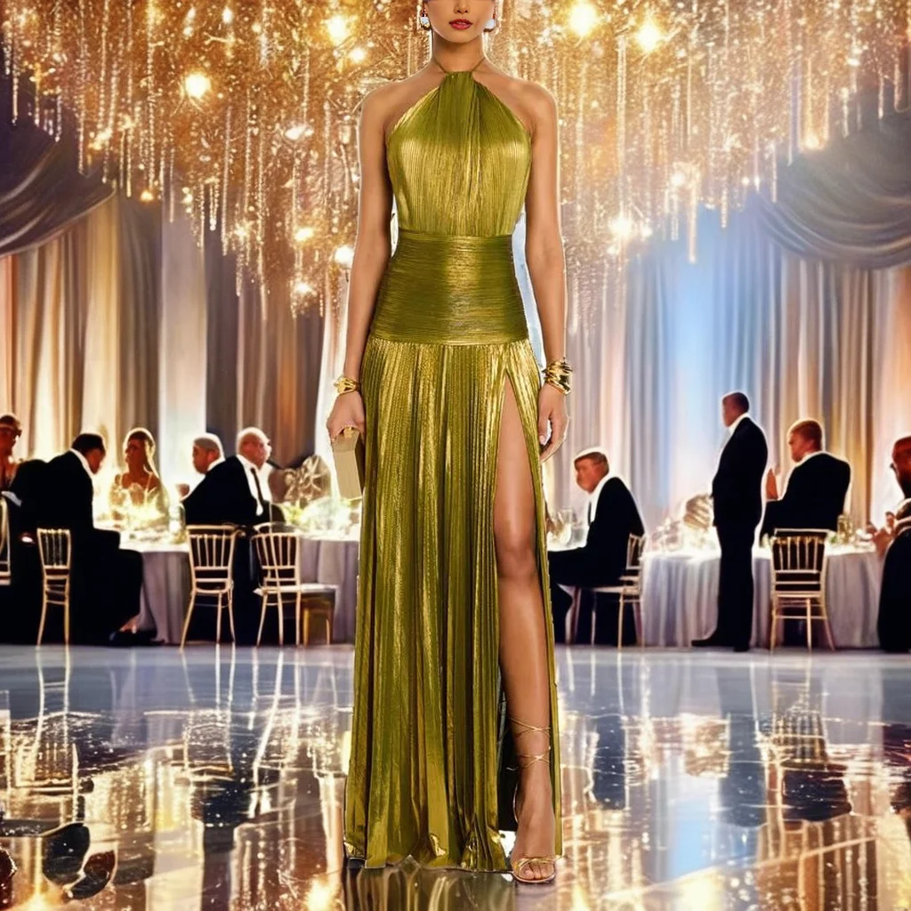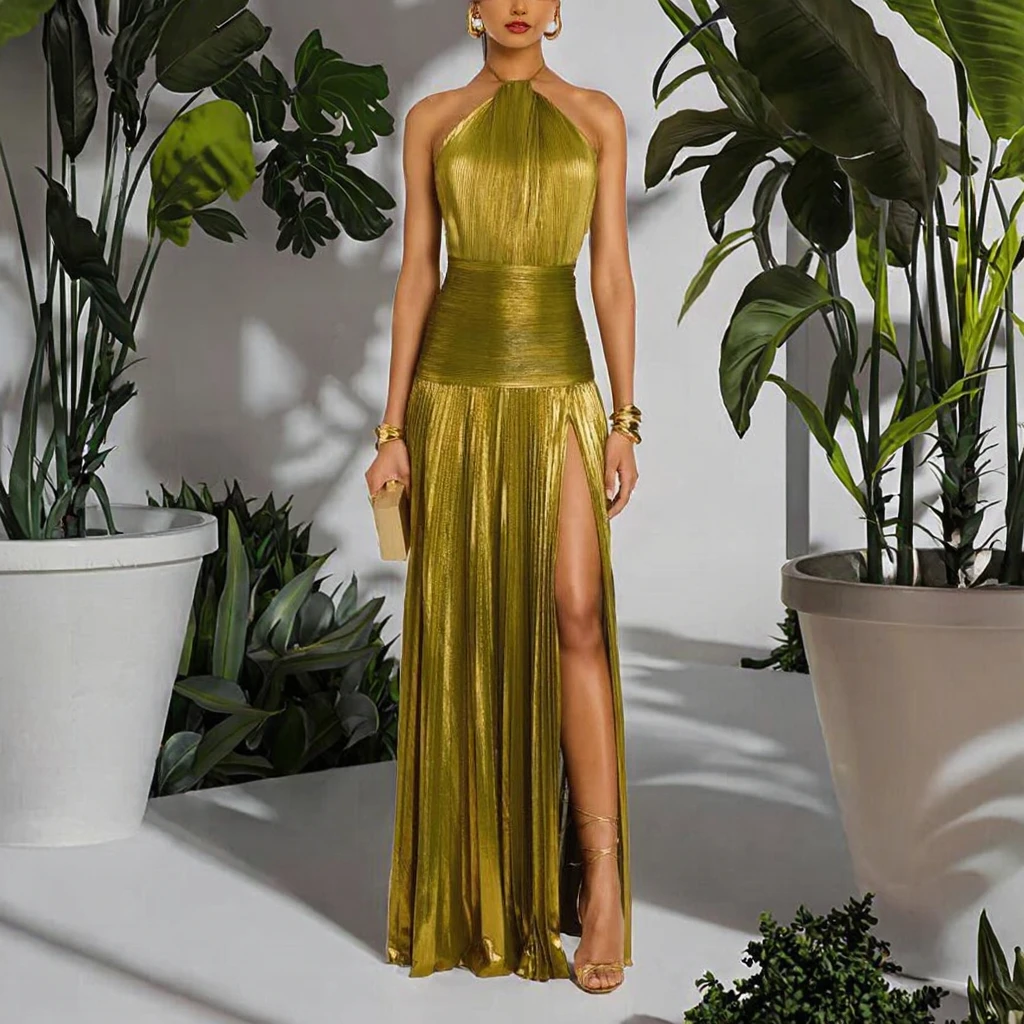 OUDINA Elegant Ladies Dress Trendy Metallic Pleated Slit Lace-up Halter Sleeveless Casual Camisole Logo Front Solid Floor-Length