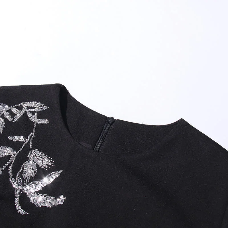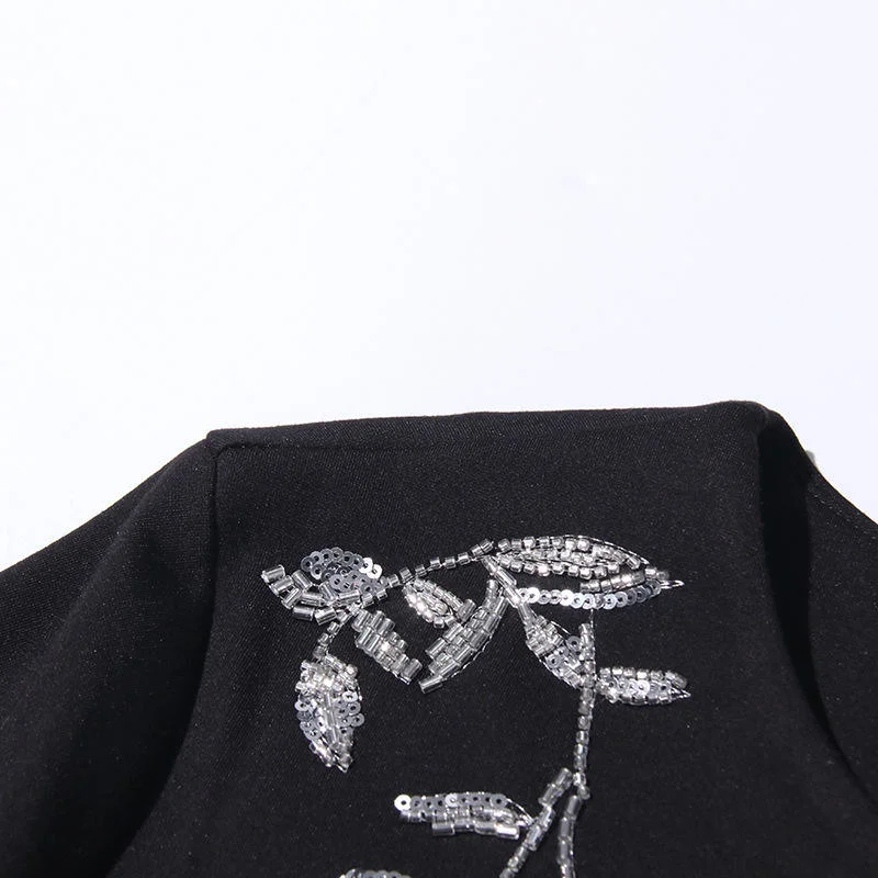ZYHT 21938 Black Velvet Mini Dress Square Neck Long Puff Sleeves with Pearl Trim & Crystal Dess Flared Scalloped Hem Dresses