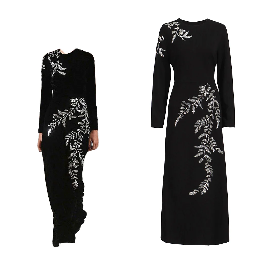 ZYHT 15325 Wholesale Spring Trendy Fashion Long Sleeve Dinner White Lace Black Velvet Elegant Party Dress Women Evening Dresses