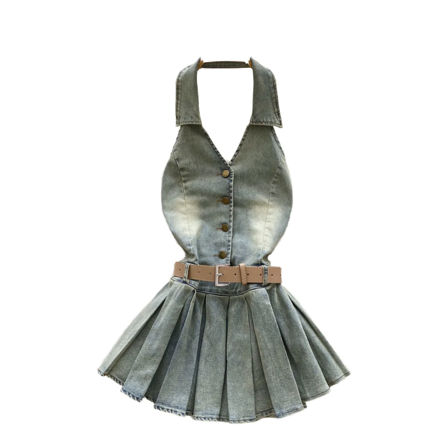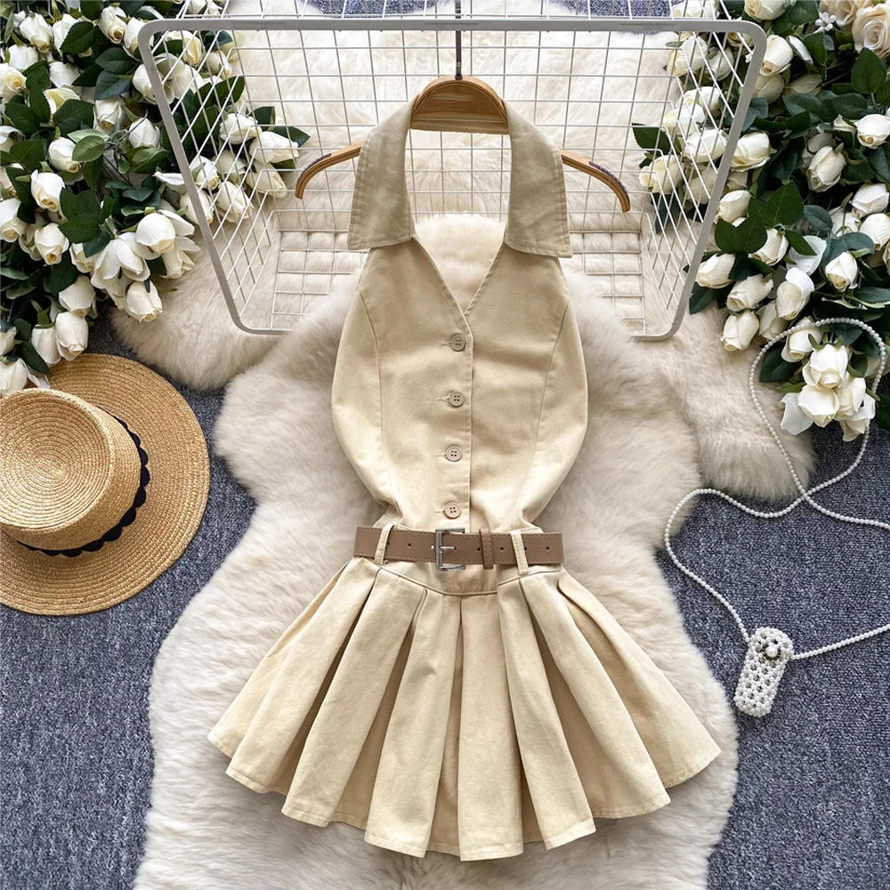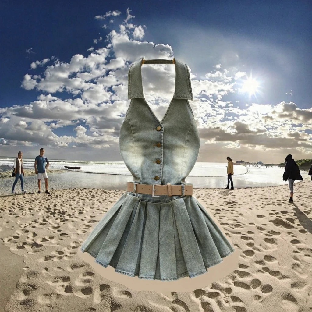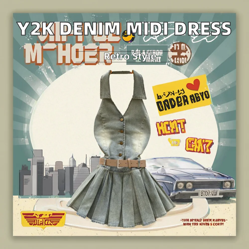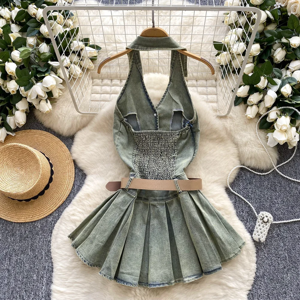 Summer Y2K Women's Casual Empire Backless Denim Dress Halter Pleated Midi Anti-Wrinkle Feature Woven Front Logo Sashes