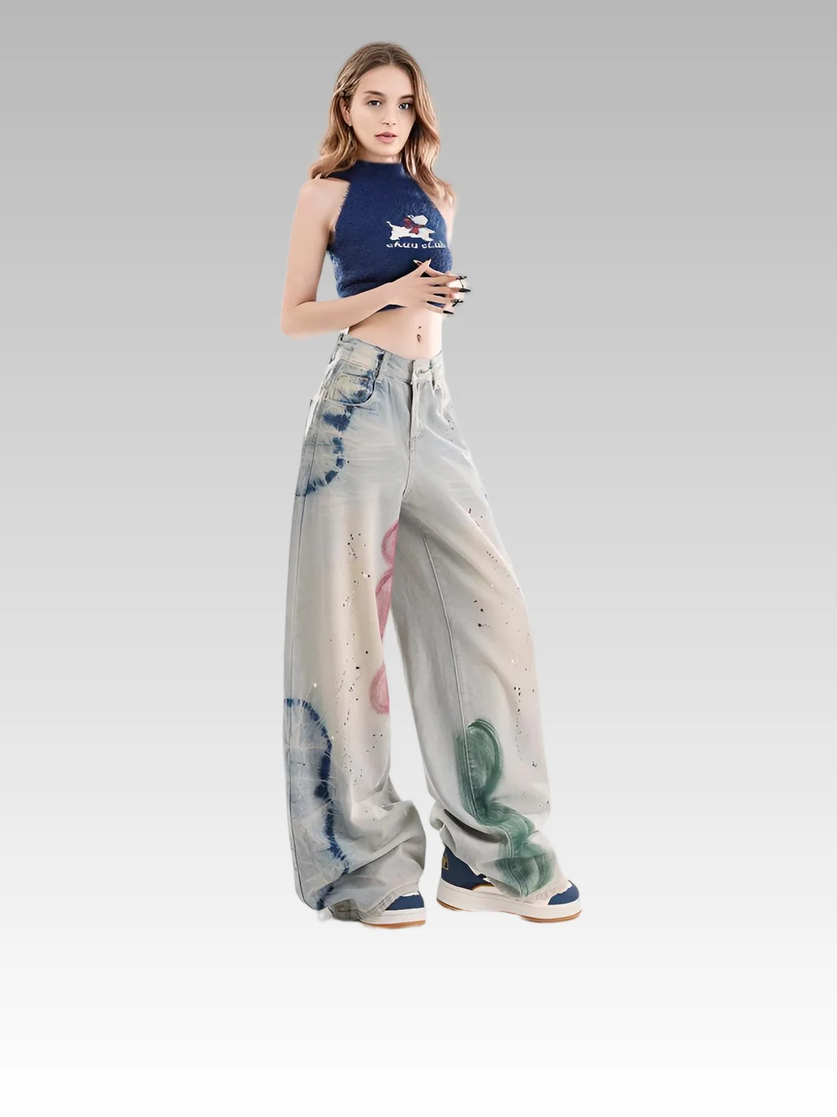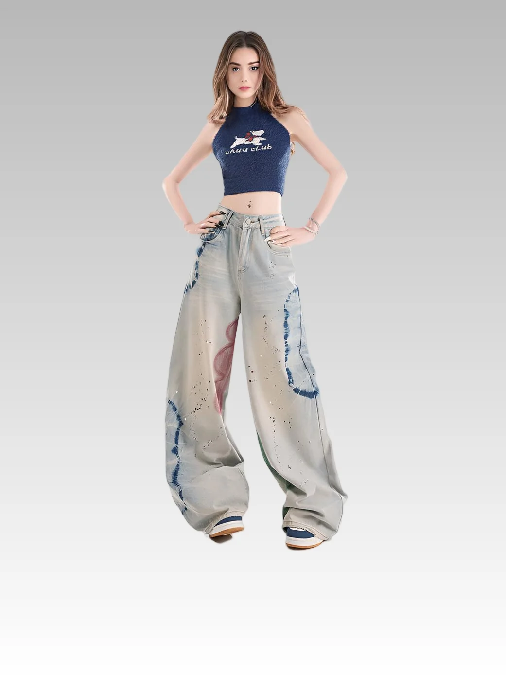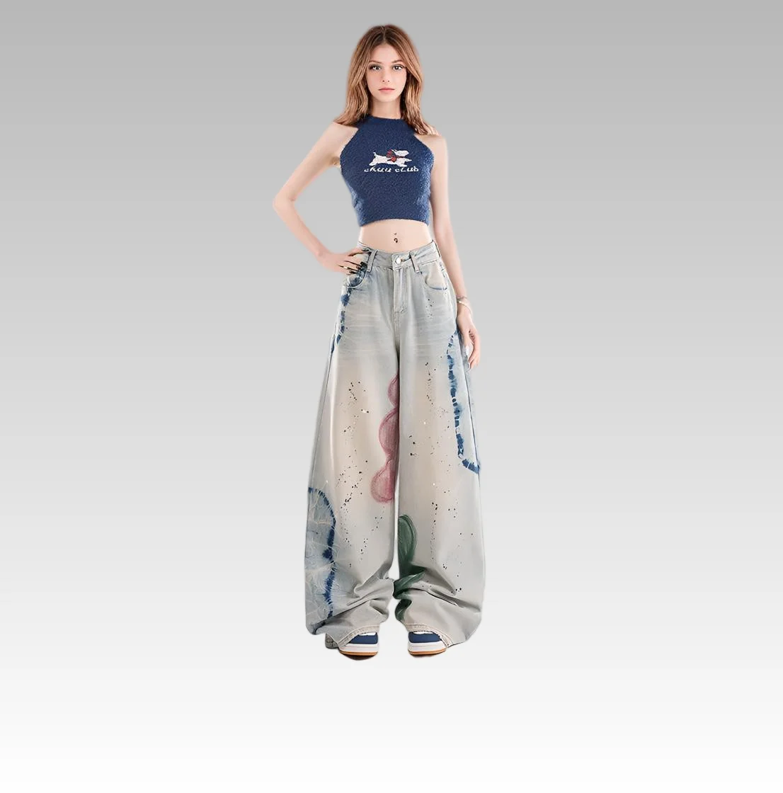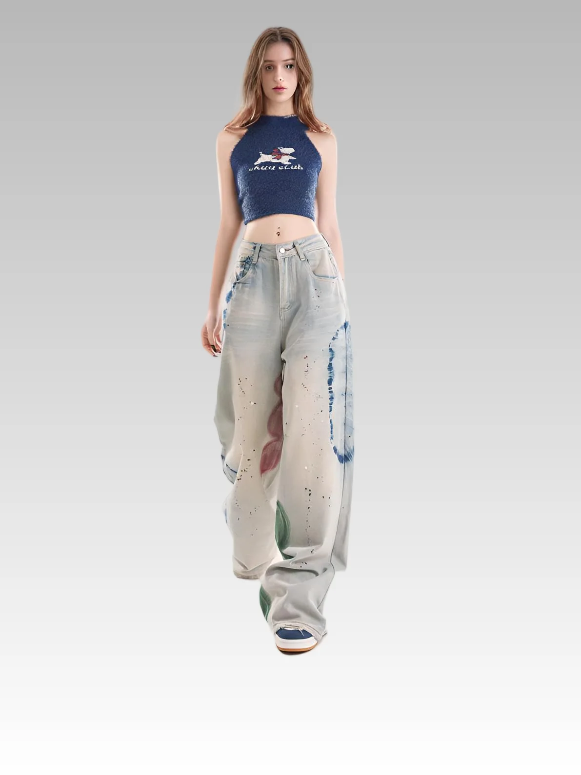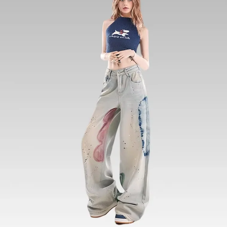 2026 Women's High Waist Vintage Jeans Graffiti Hot Diamond Embellished Loose Straight Floor-Mopping Design Denim Washed Button