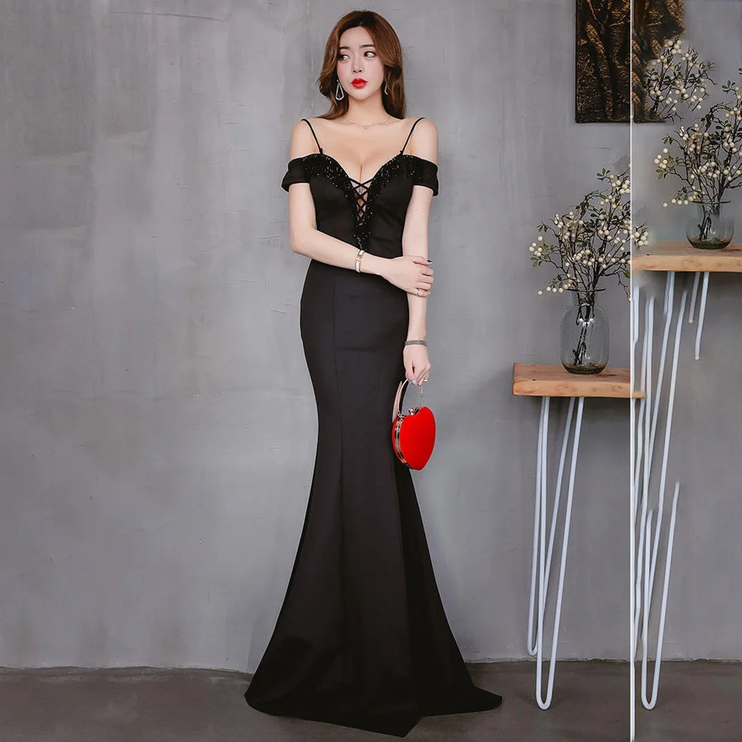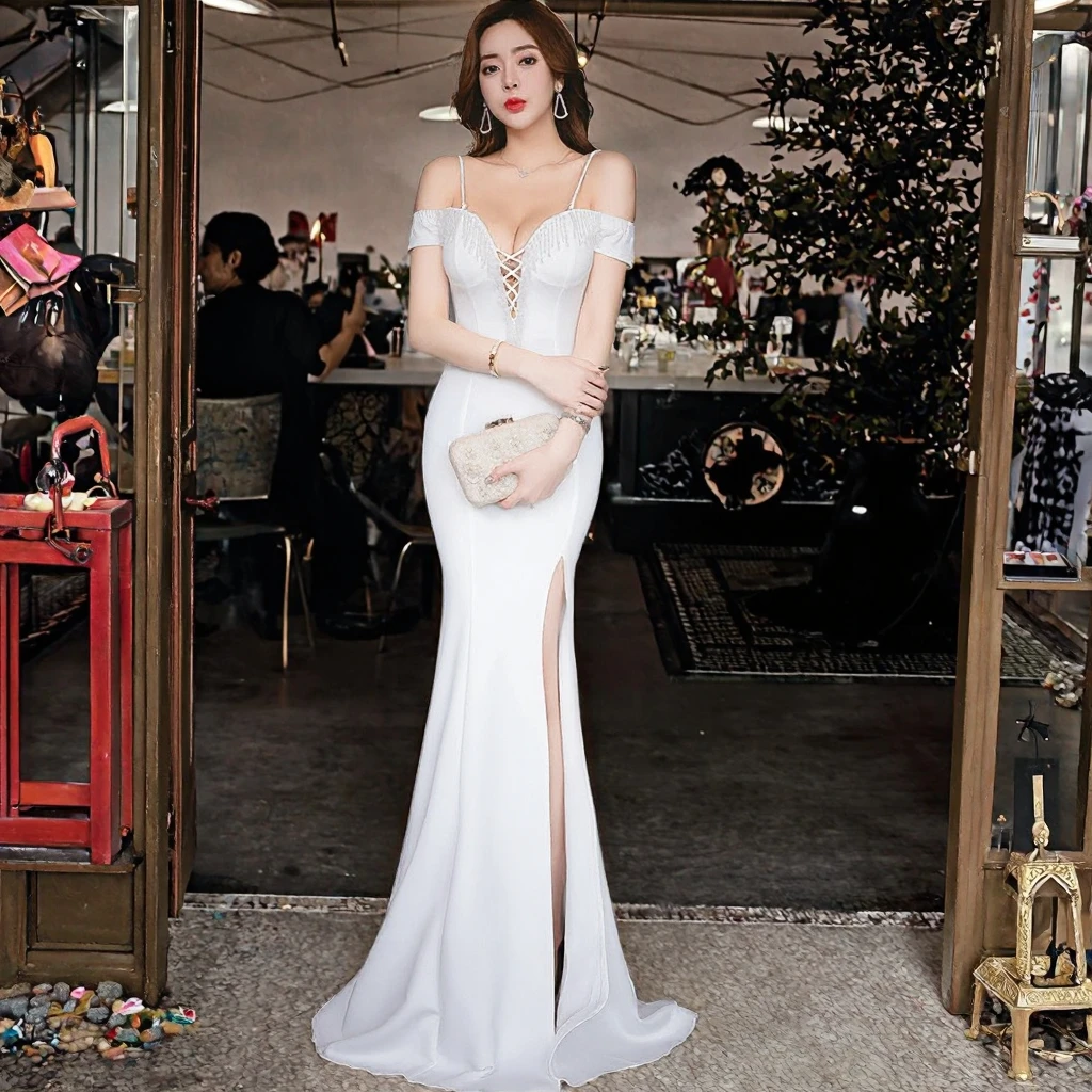 ZYHT 15325 Wholesale Spring Trendy Fashion Long Sleeve Dinner White Lace Black Velvet Elegant Party Dress Women Evening Dresses