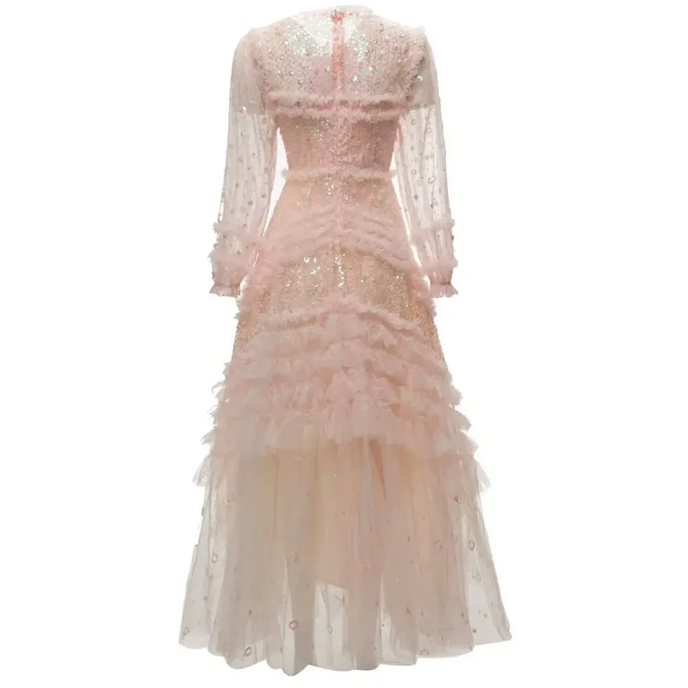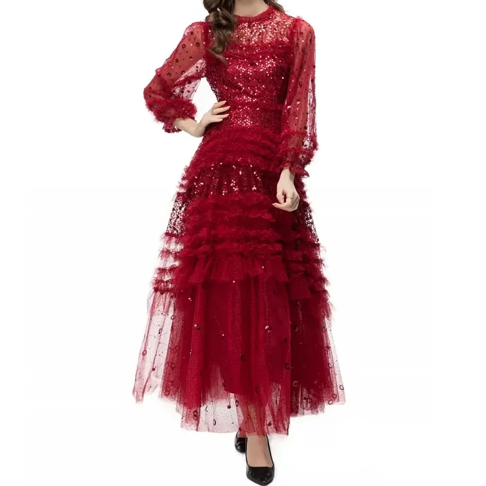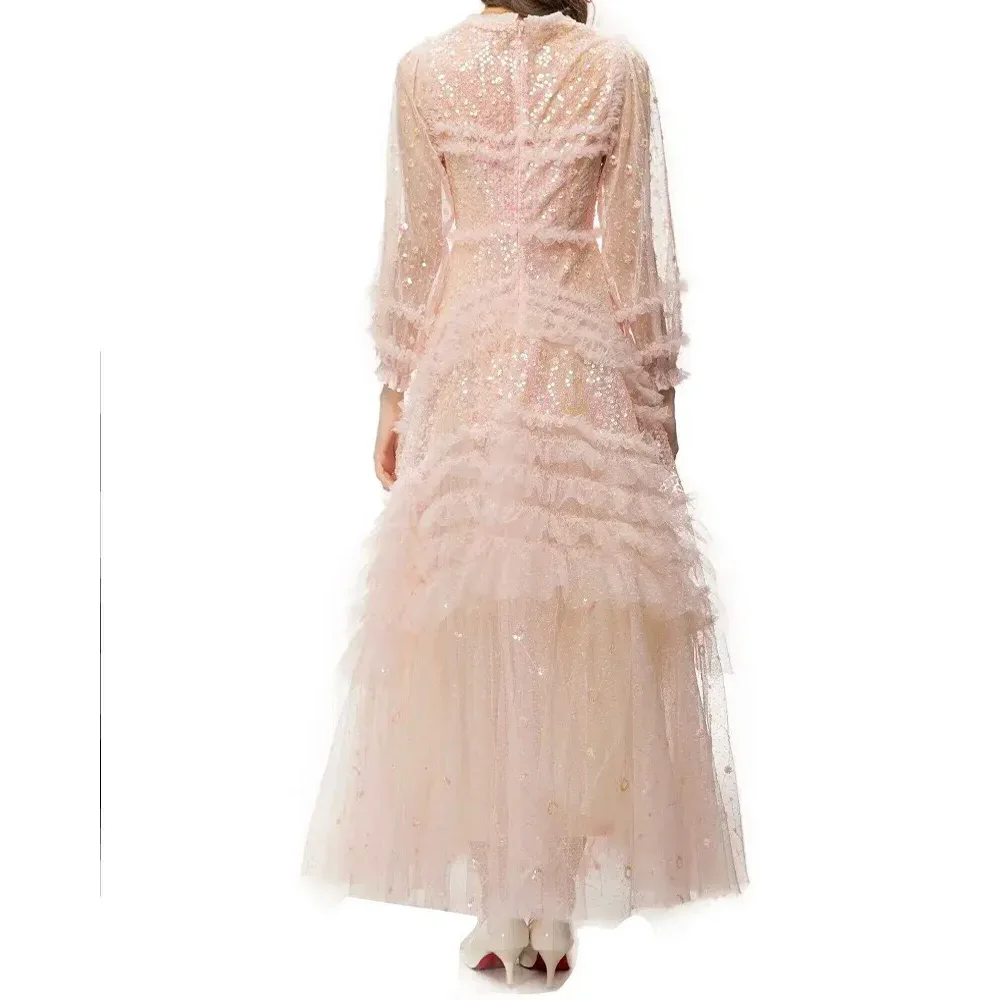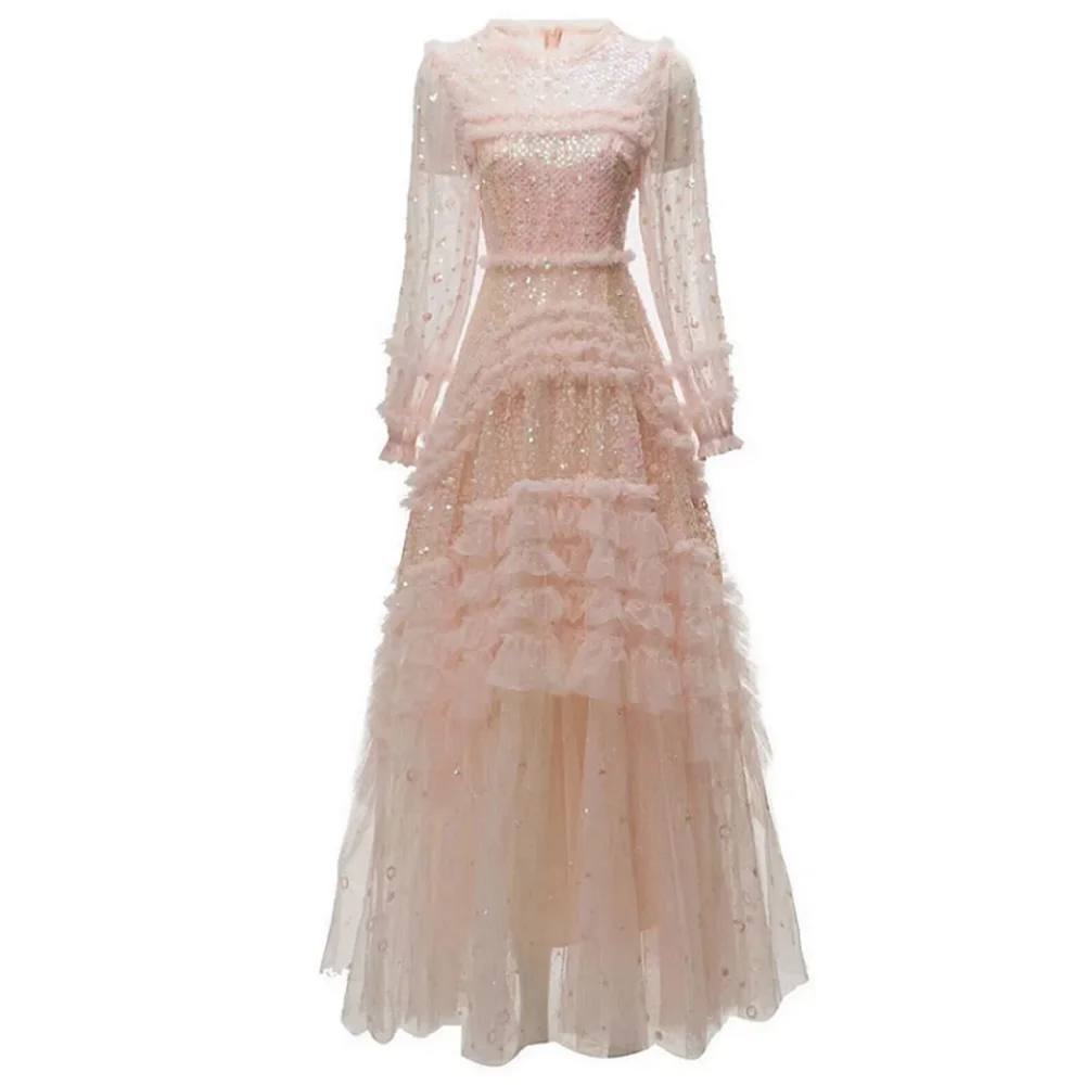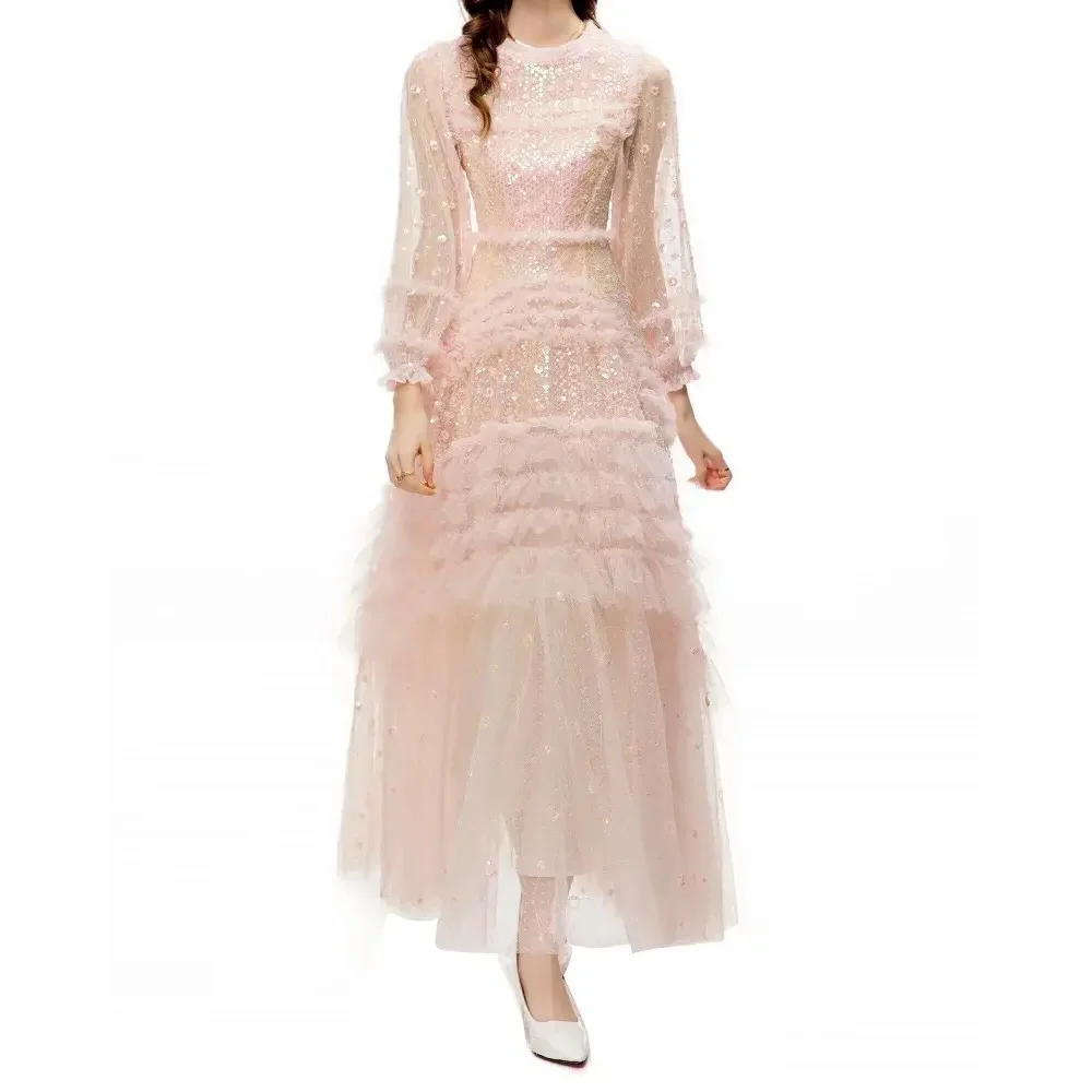 XXXXL Long Party Evening Women Dress Special Occasion Ladies Sequined Lace Flower Patterns Long Sleeve Pink Red Maxi Gown Dress