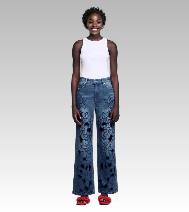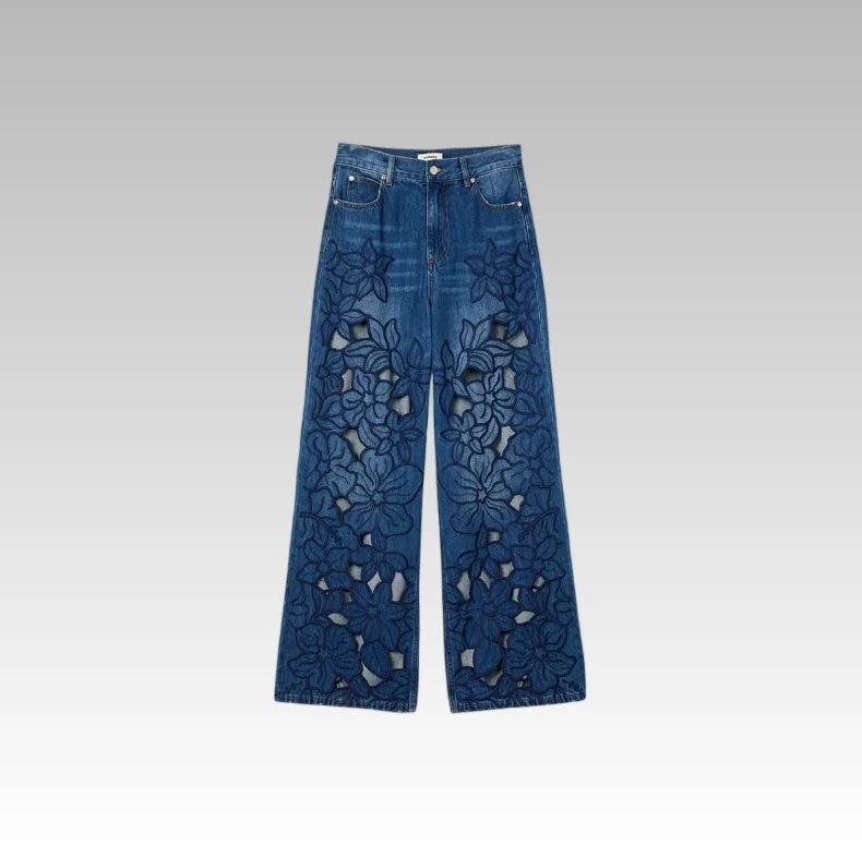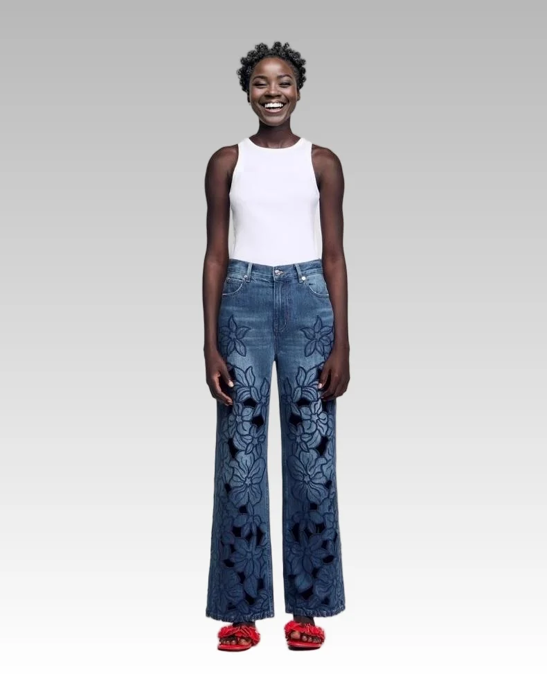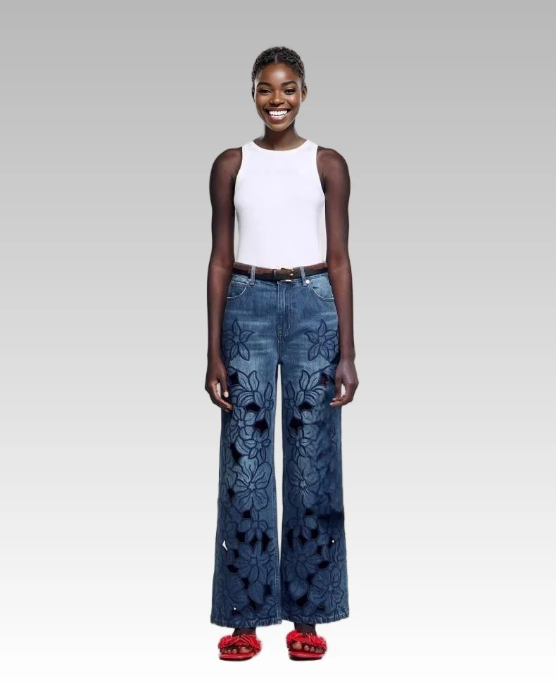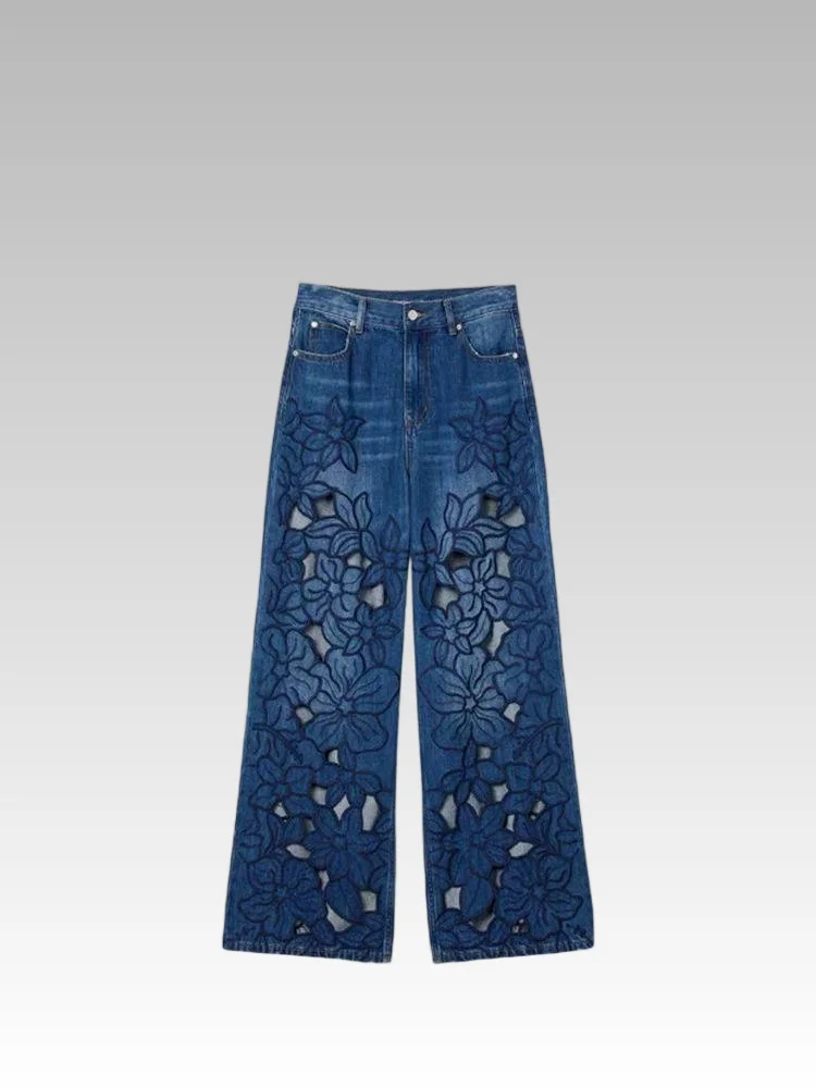 2026 Spring Summer Women's Casual Vintage Style High Waist French Hollow Embroidery Floral Loose Denim Wide Leg Pants