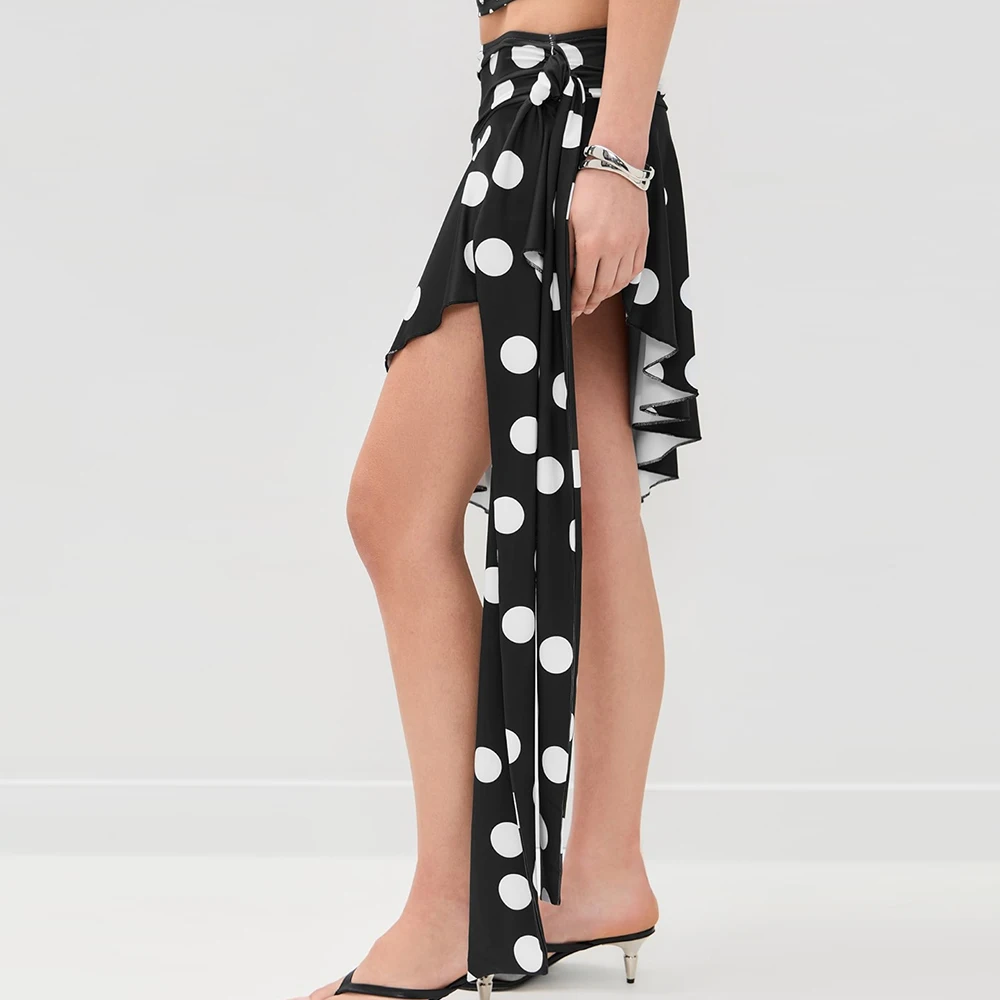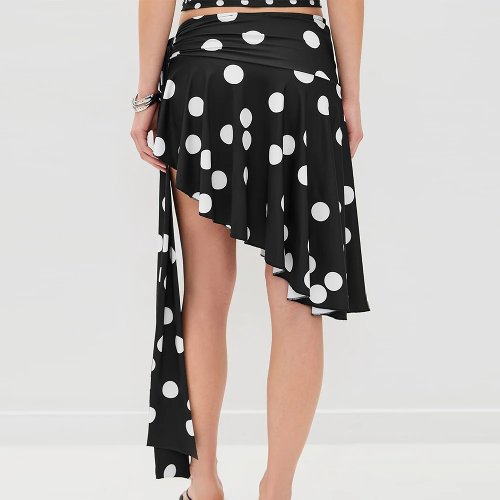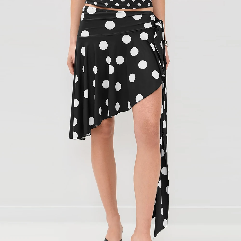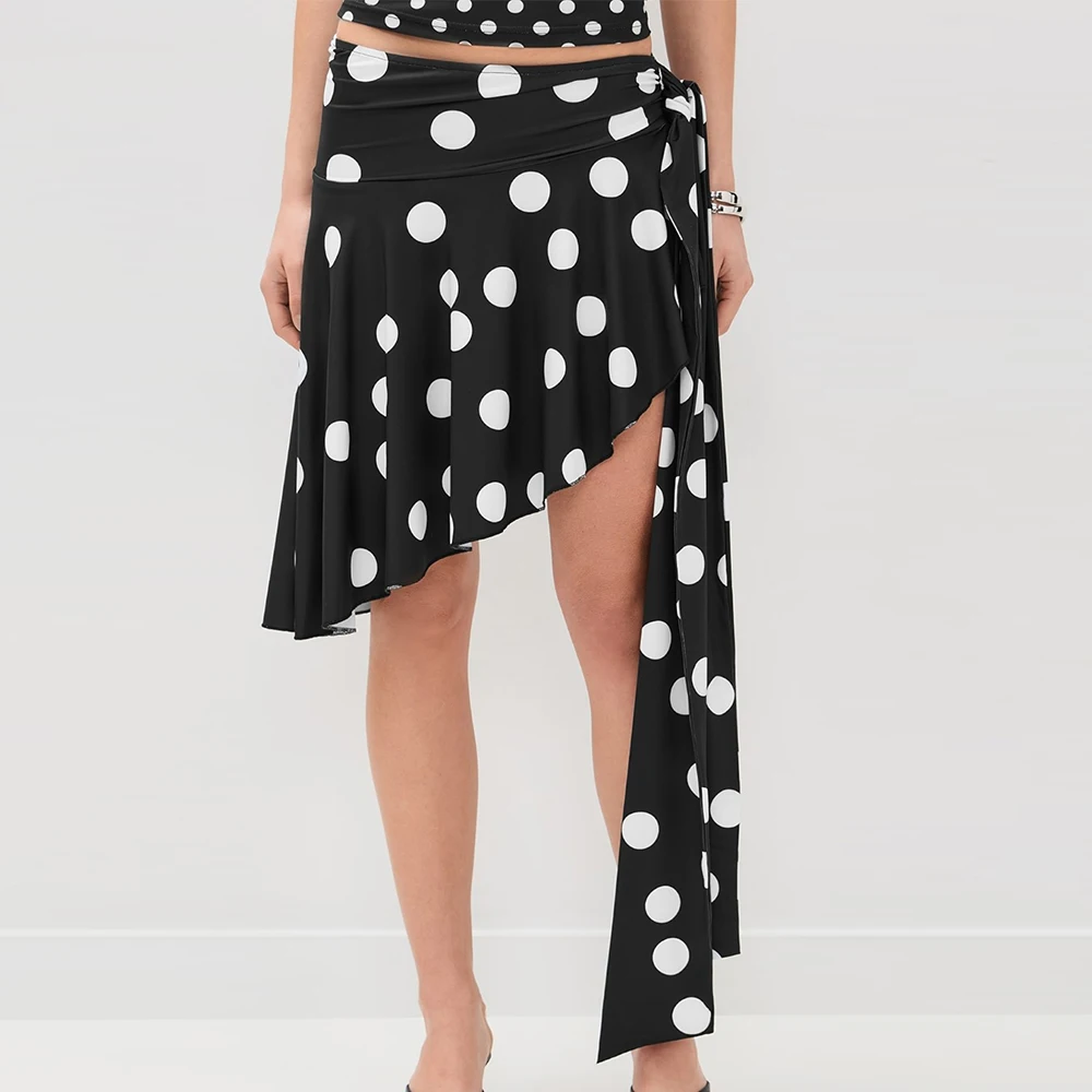 Wisrise Fashion New Custom Wholesale Women's Black & White Polka Dot Print Asymmetric Hem Wrap Mini Skirt