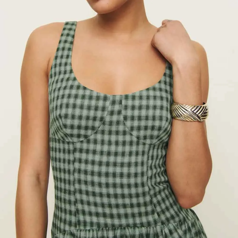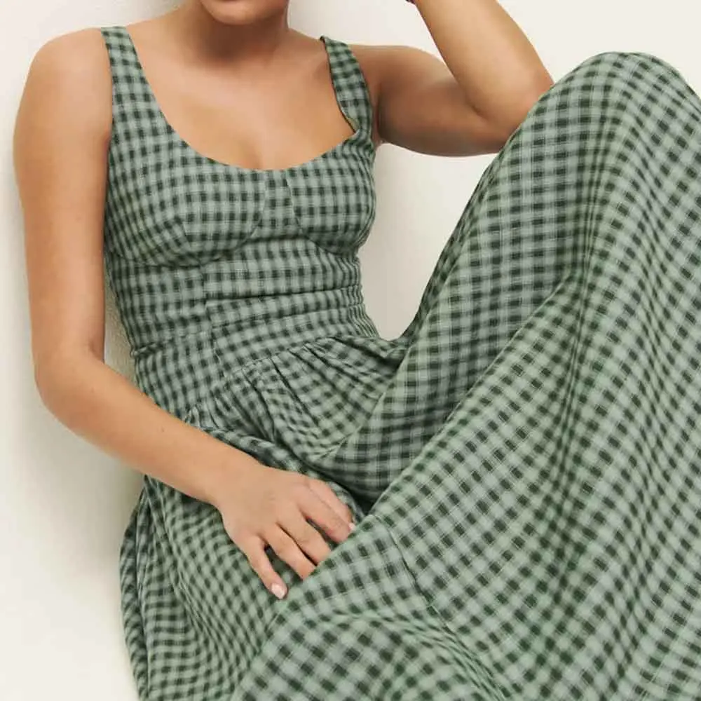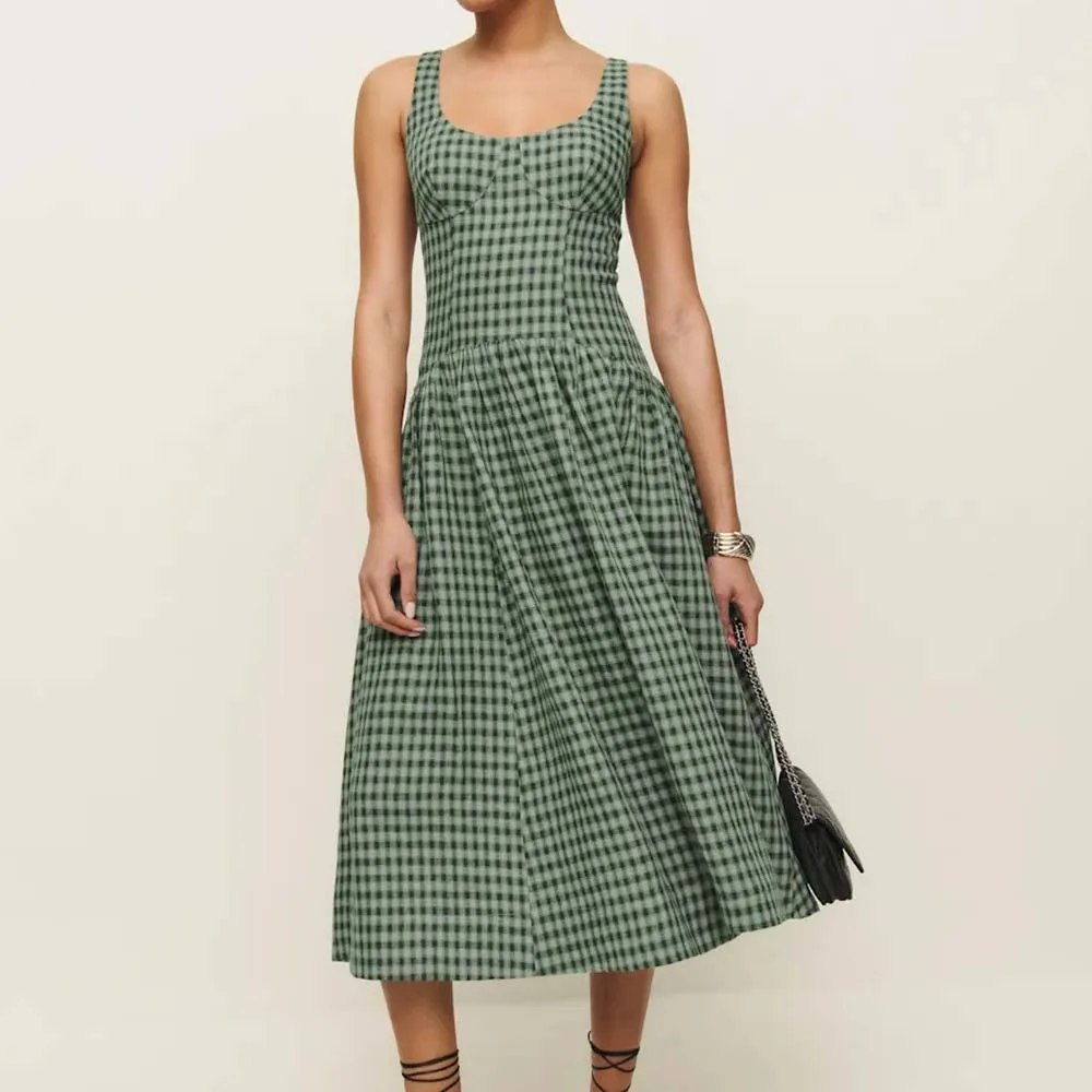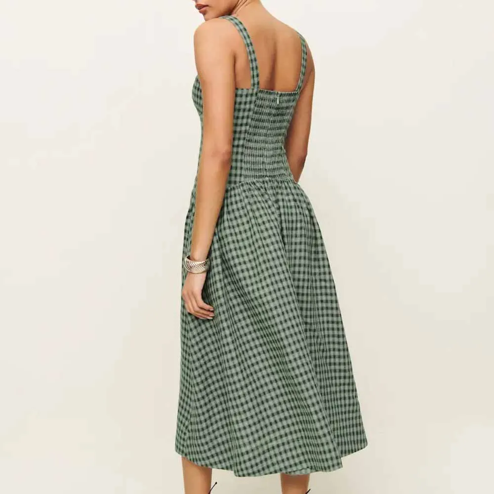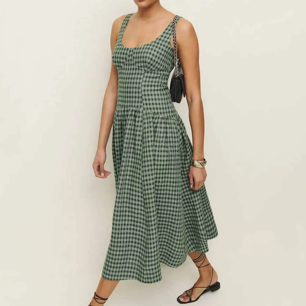 Manufacturer Vintage Women's Elegant U-neck Backless Tight Waist Custom Plaid Sleeveless Midi Dress