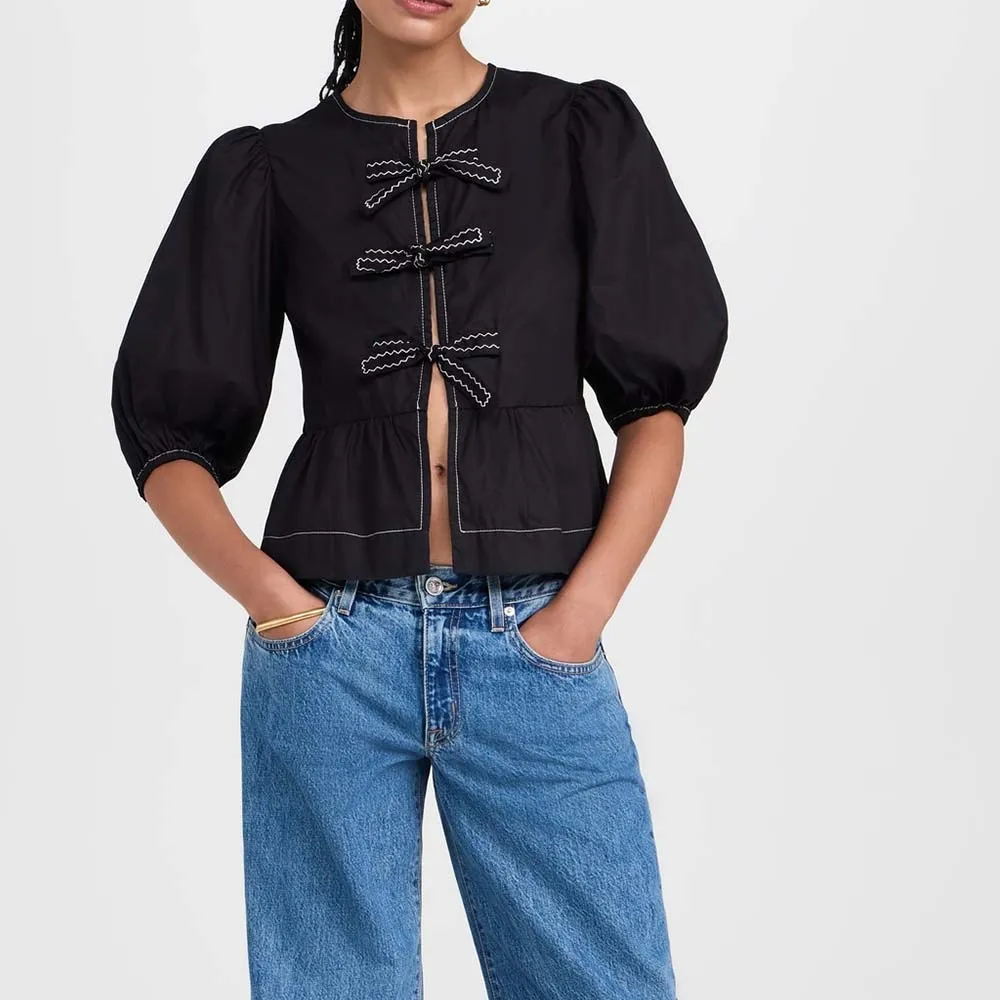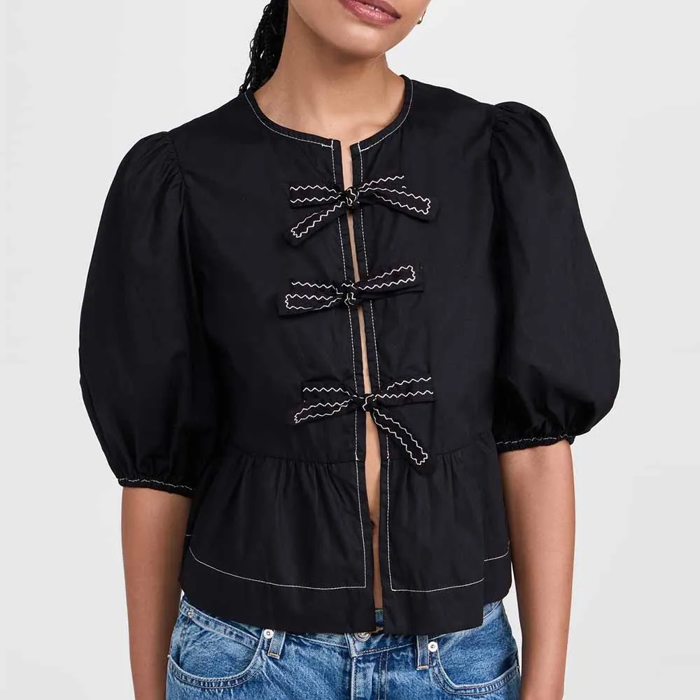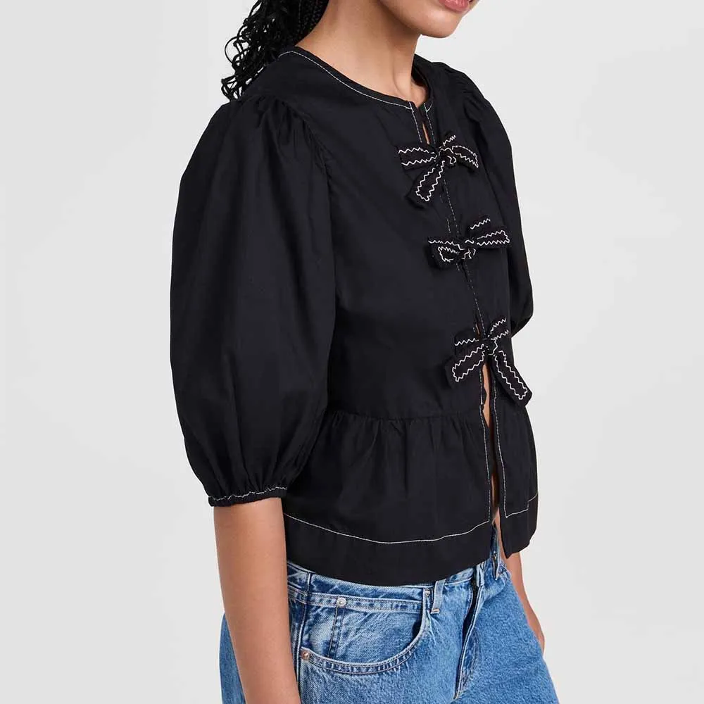 Clothing Manufacturers Custom Spring Summer Autumn Lace-up Round Neck Puff Short Sleeve With Knot Detail Top