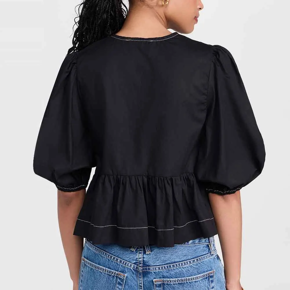 ZYHT 82055 Casual Summer Women's Black Peplum Top Blouse Contrast White Lace Scalloped Hem Puff Sleeves Fabric Floral Pattern