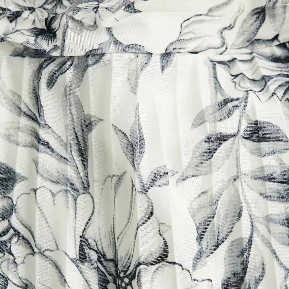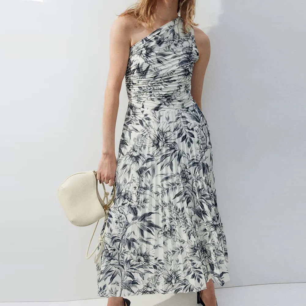 Manufacturer Hot Sale Clothing Customize Design High Quality Floral Yarned Dye Pleated Slanted Shoulder Long Midi Dress