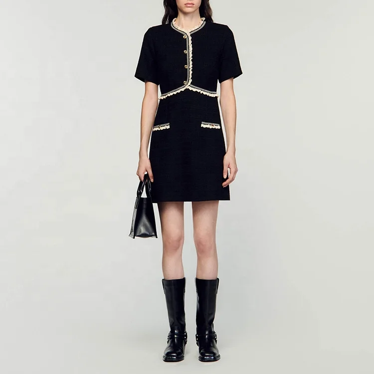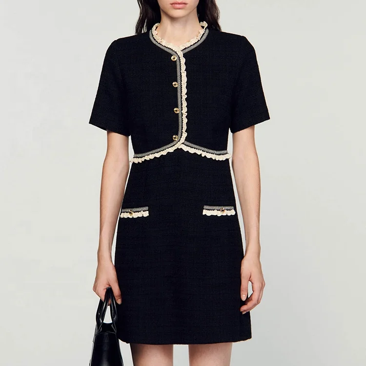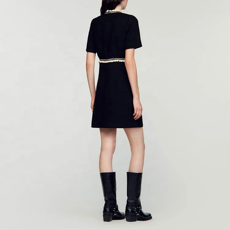 Clothing Manufacturer Custom Spring Summer Black Crew Neck Short Sleeve Elegant Casual Women Tweed Dress