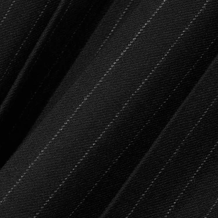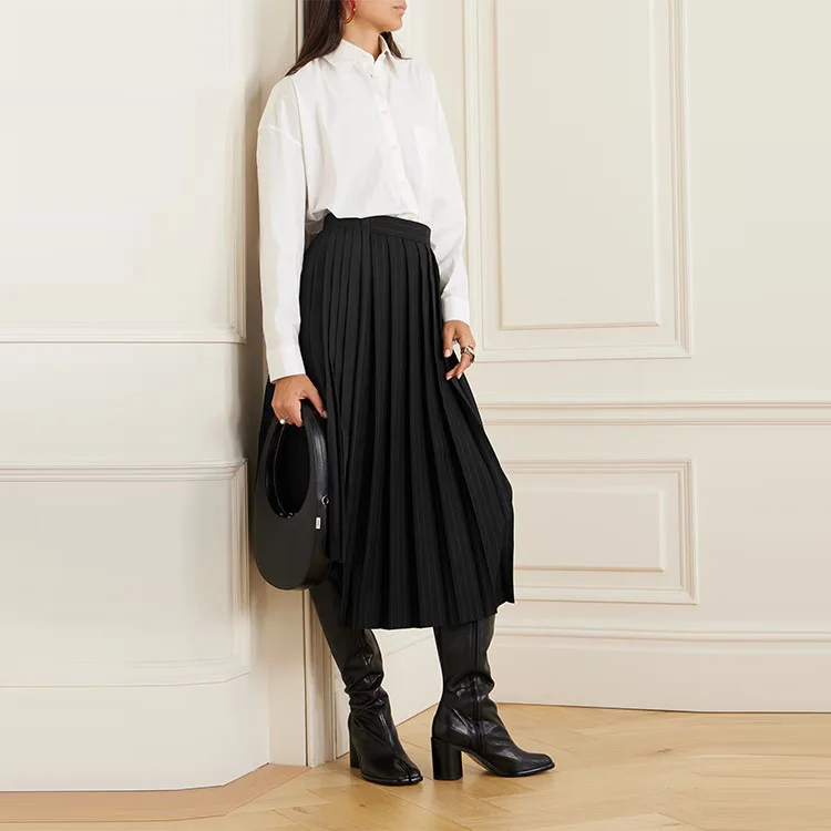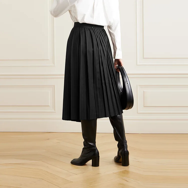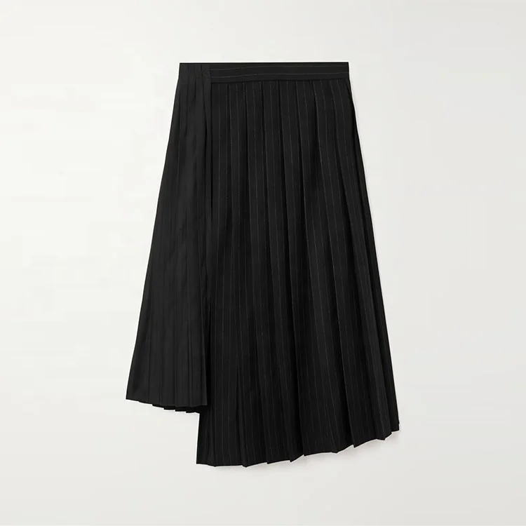 Clothing Manufacturer Custom Spring Autumn Black Pleated Pinstriped Asymmetric Wool Poplin Women Midi Skirt