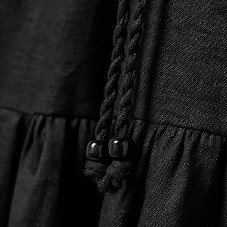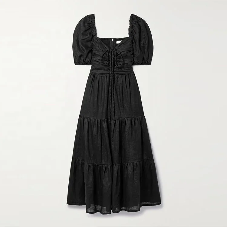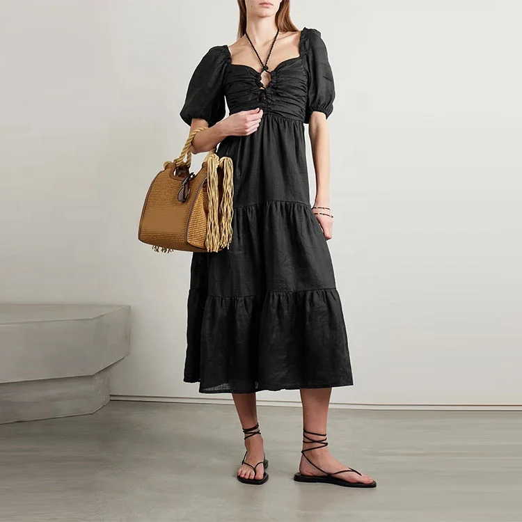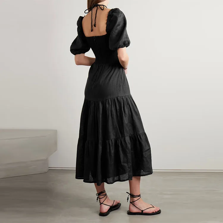 Clothing Manufacturer Custom Spring Summer Black square Neck Short Sleeve Women Elegant Casual Midi Linen Dress