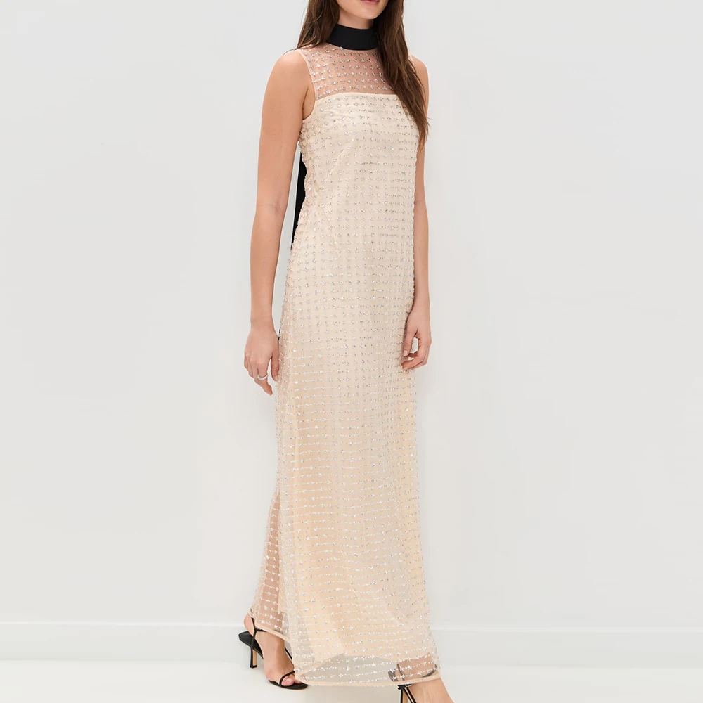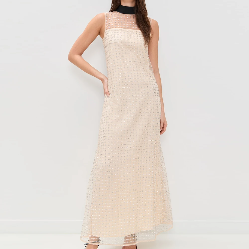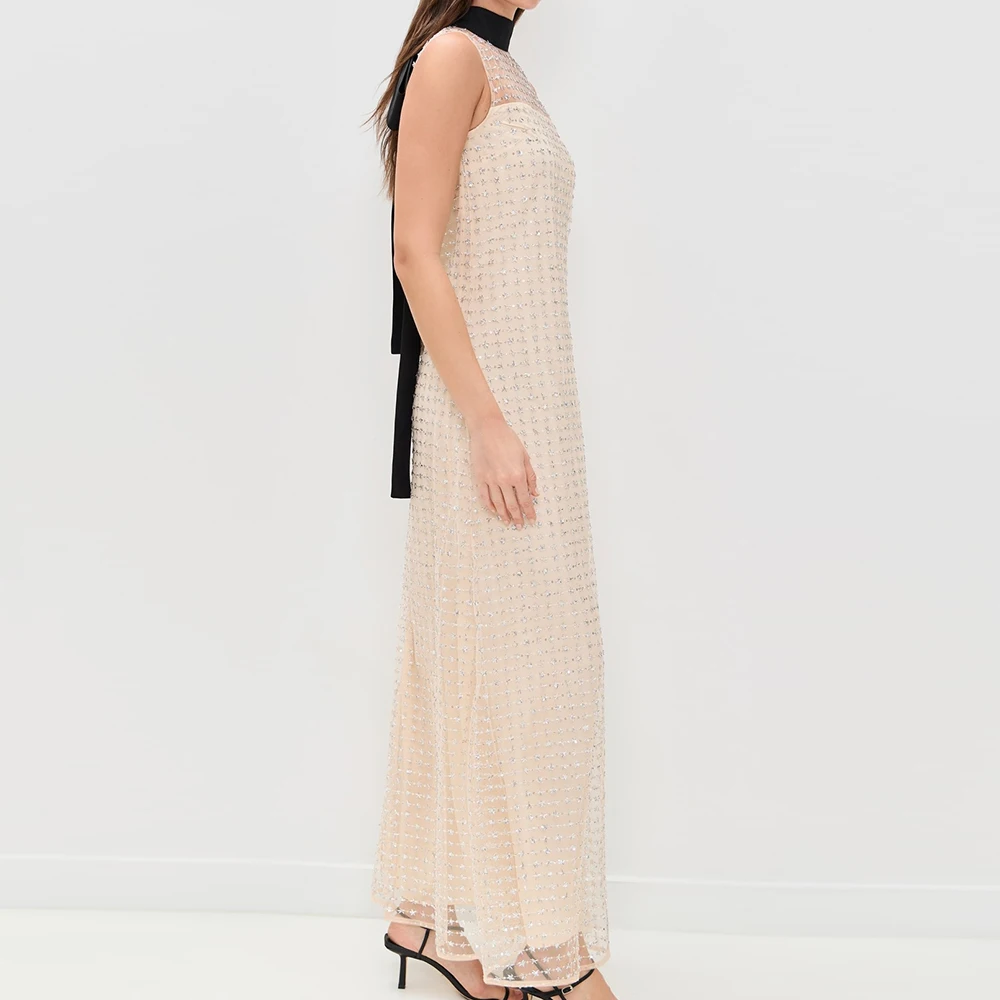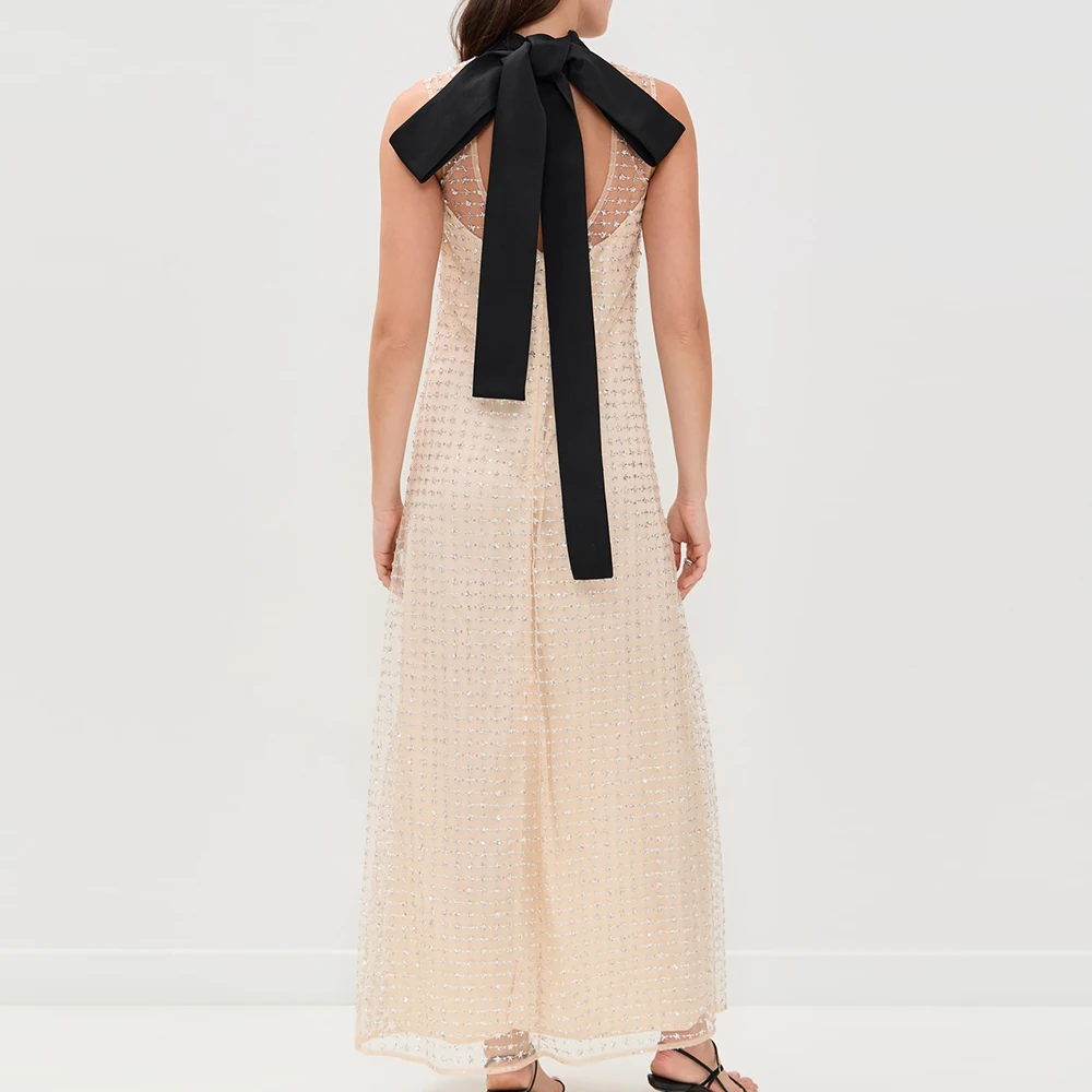 Wisrise Fashion Manufacturer Custom Women's Beige Embellished Grid Mesh Bow Back Sleeveless Elegant Party Maxi Dress