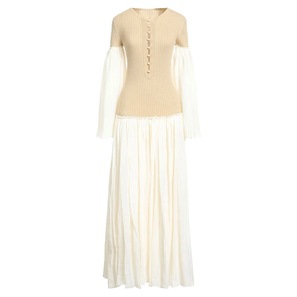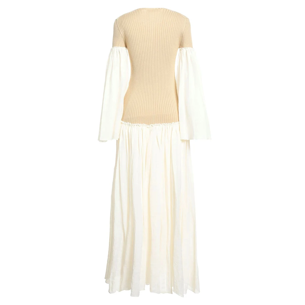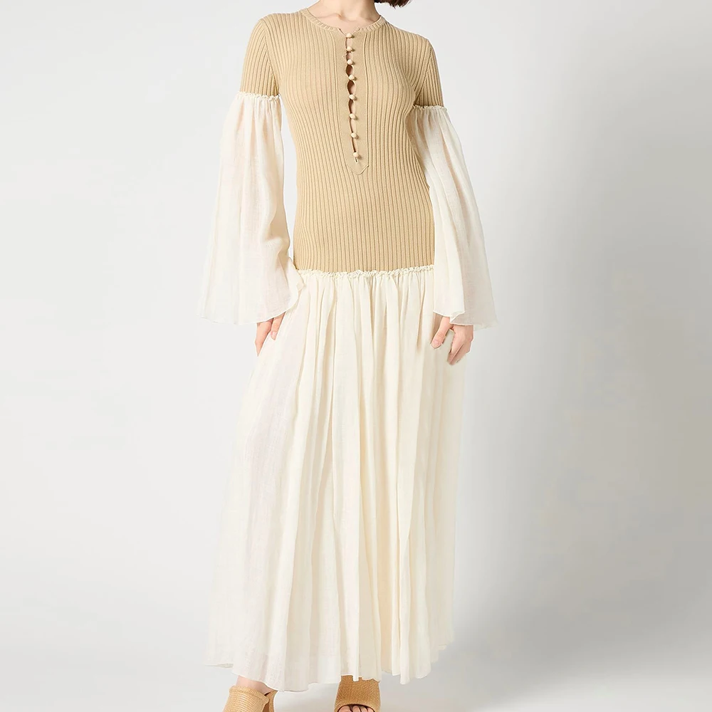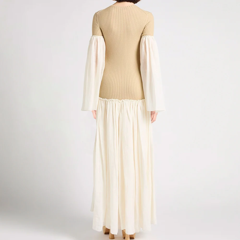 Wisrise Fashion Customize Design Lightweight Knit Ribbed Top Patchwork Woven Sleeve Two Tone Ruffle Maxi Dress