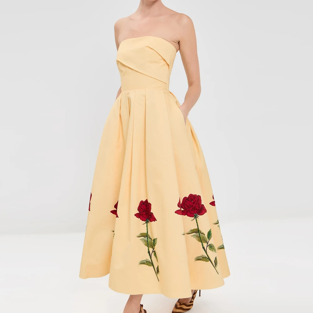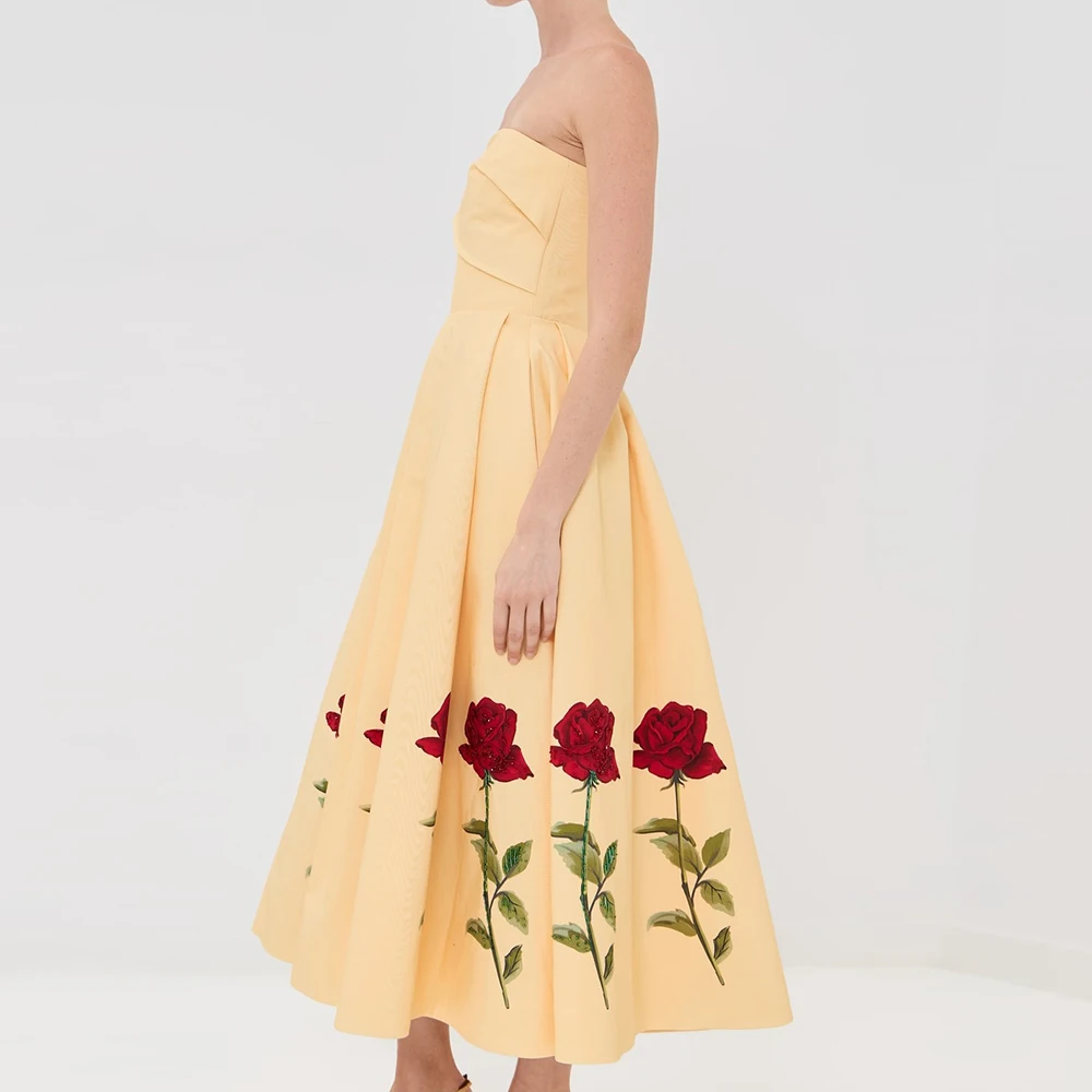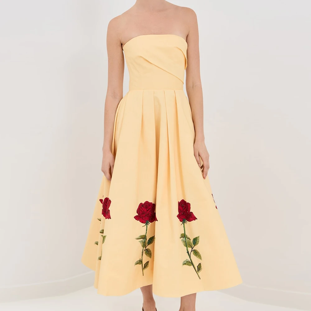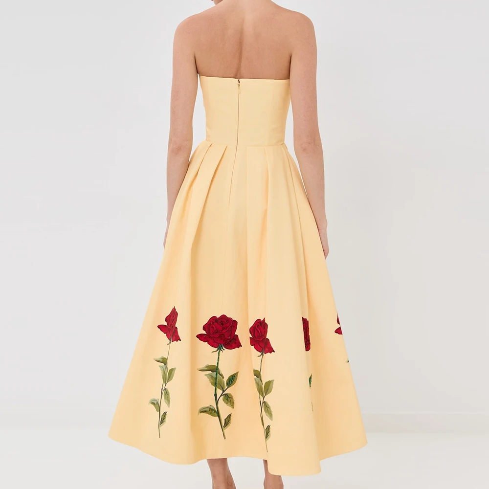 Wisrise Fashion Customize Design Women's Yellow Floral Pattern Strapless Sleeveless Party Midi Dress
