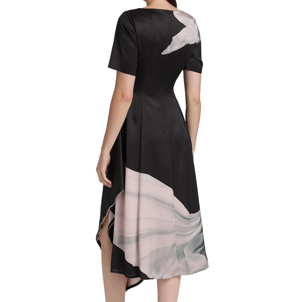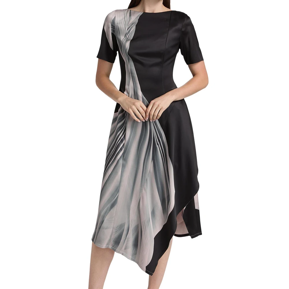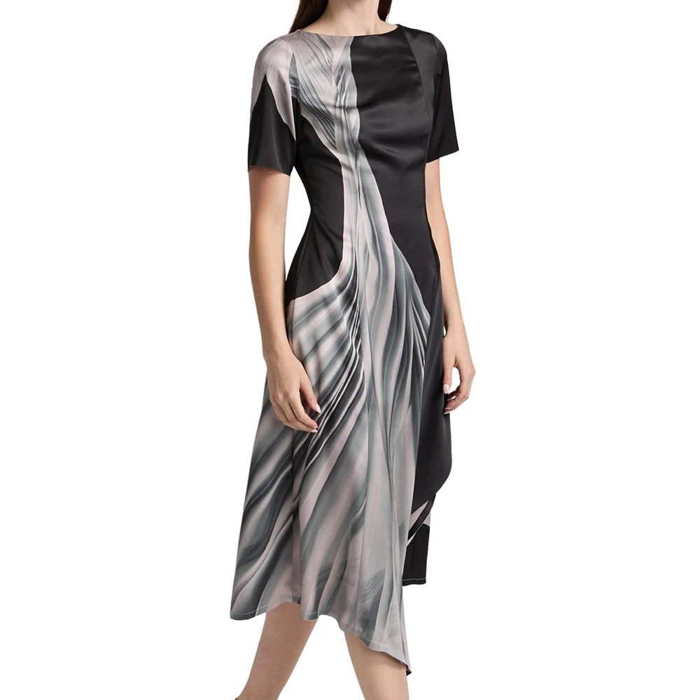Wisrise Fashion Custom High Quality Women's Black & Gray Abstract Print Short Sleeve Midi Dress Formal Gathering