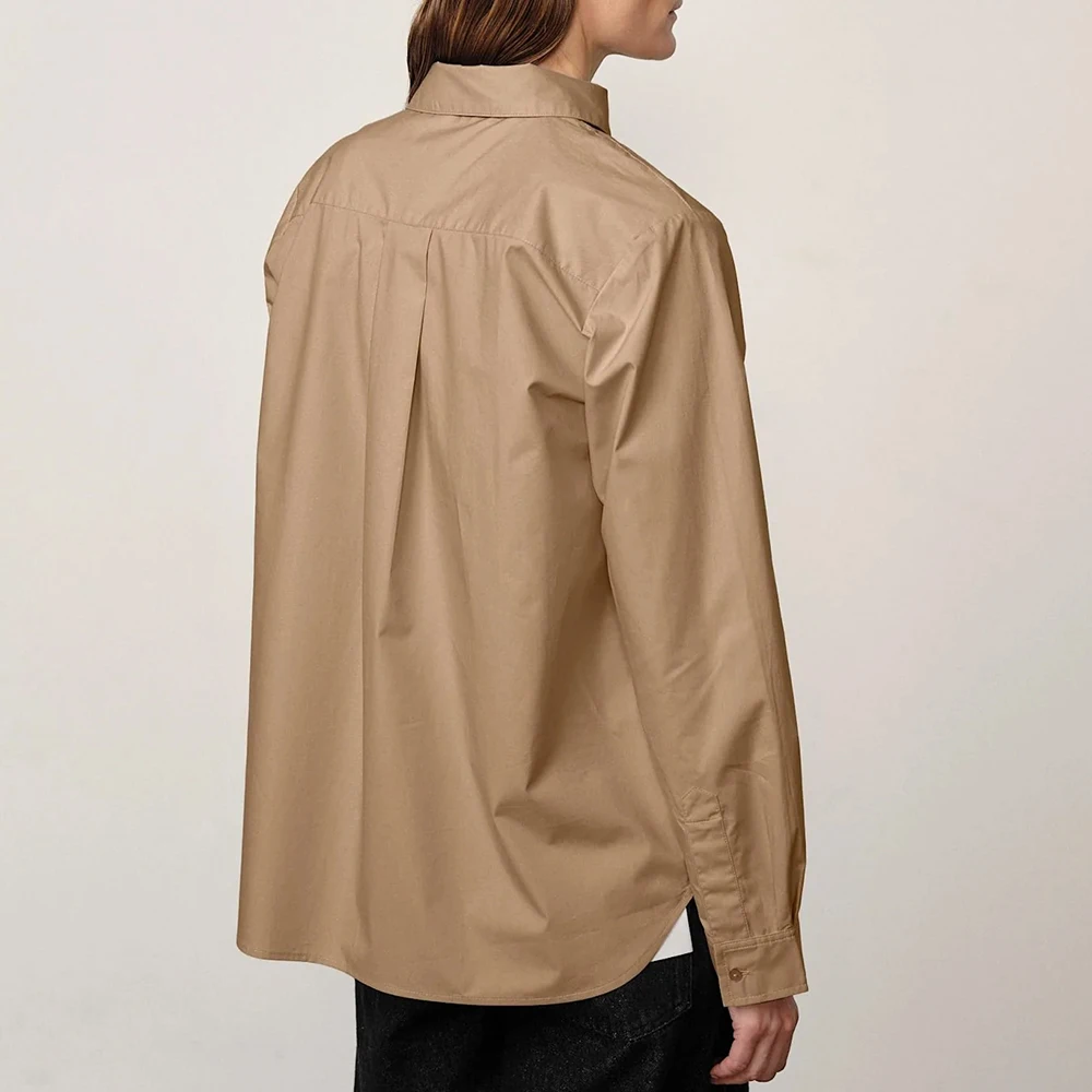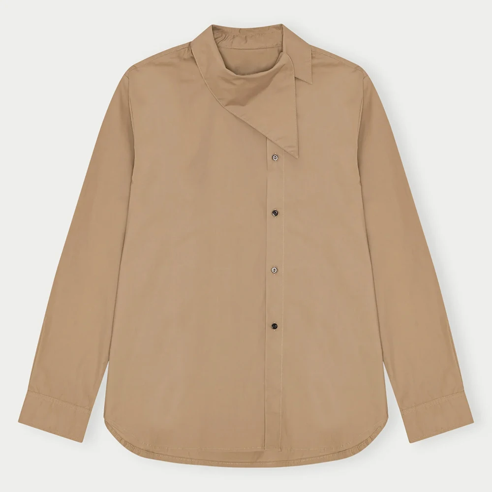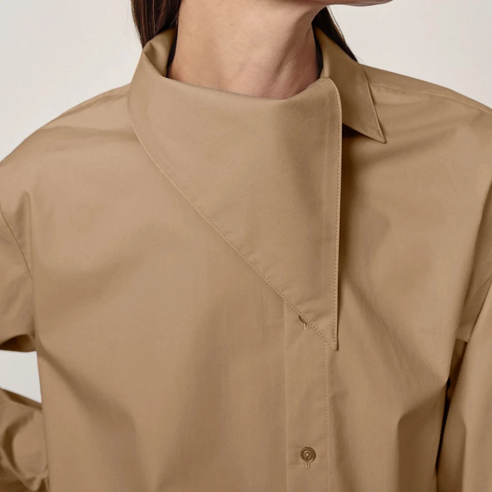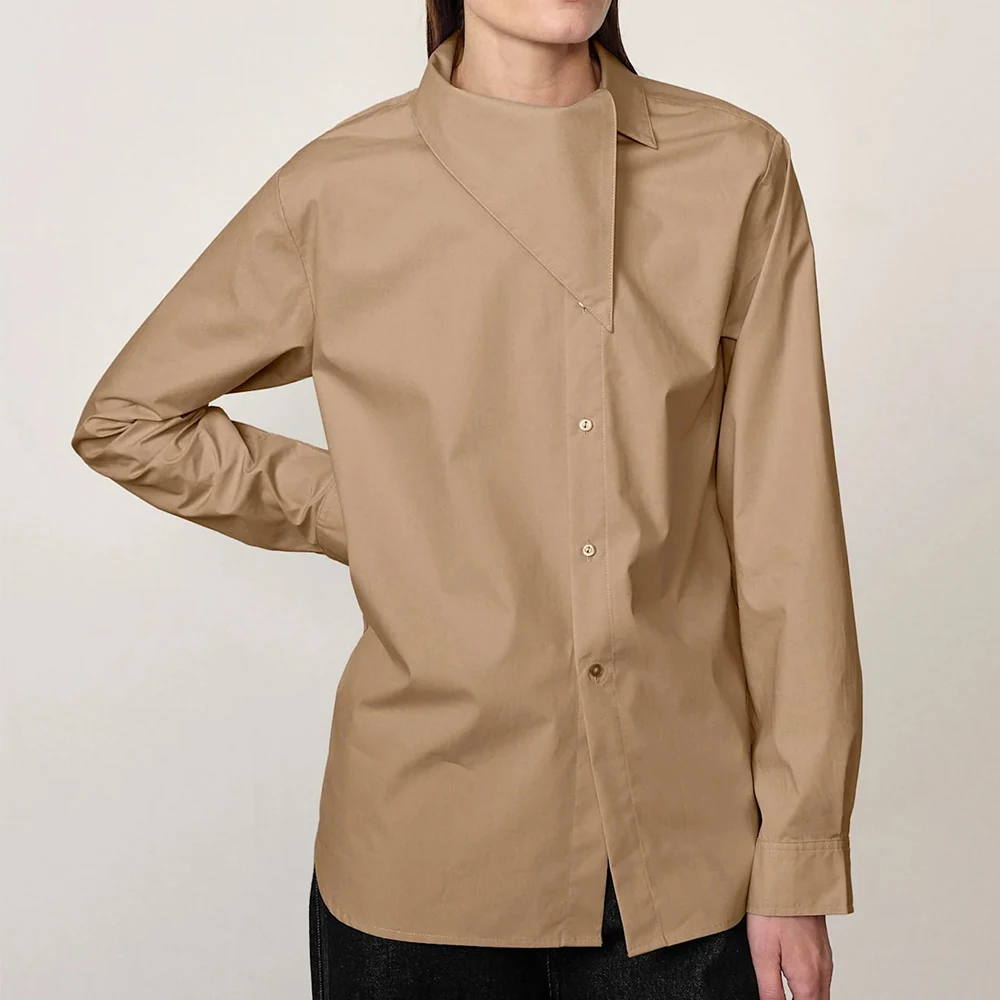 Wisrise Fashion OEM Custom Minimalist Chic Streetwear Women's Tan Asymmetric Collar Long Sleeve Shirt