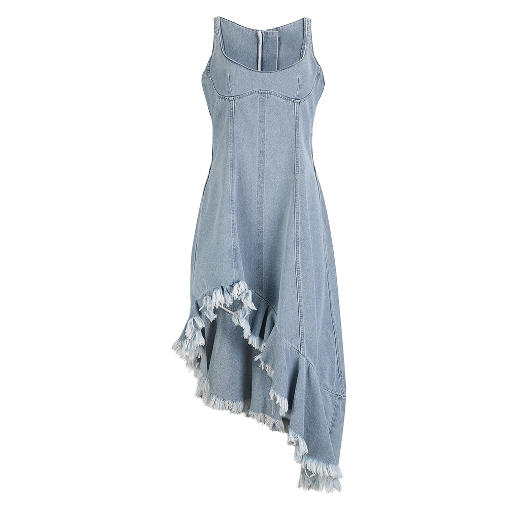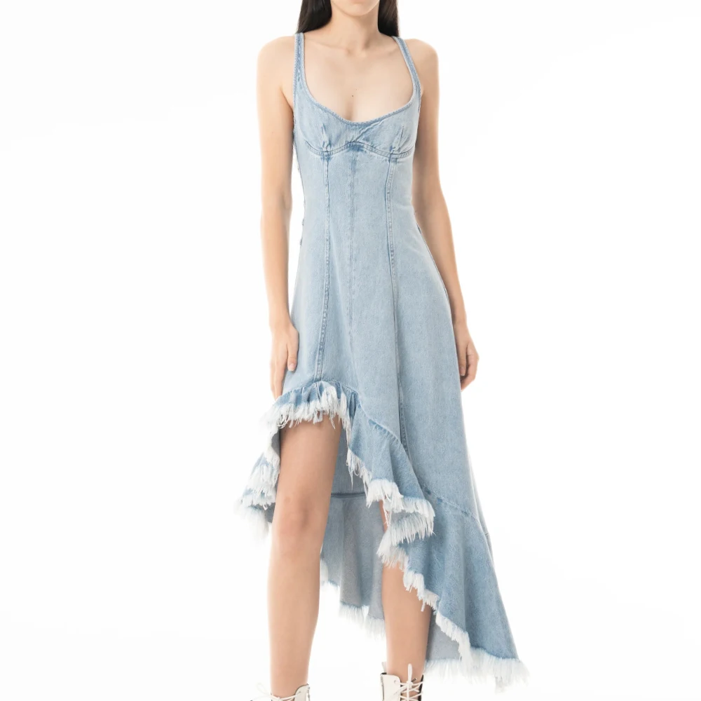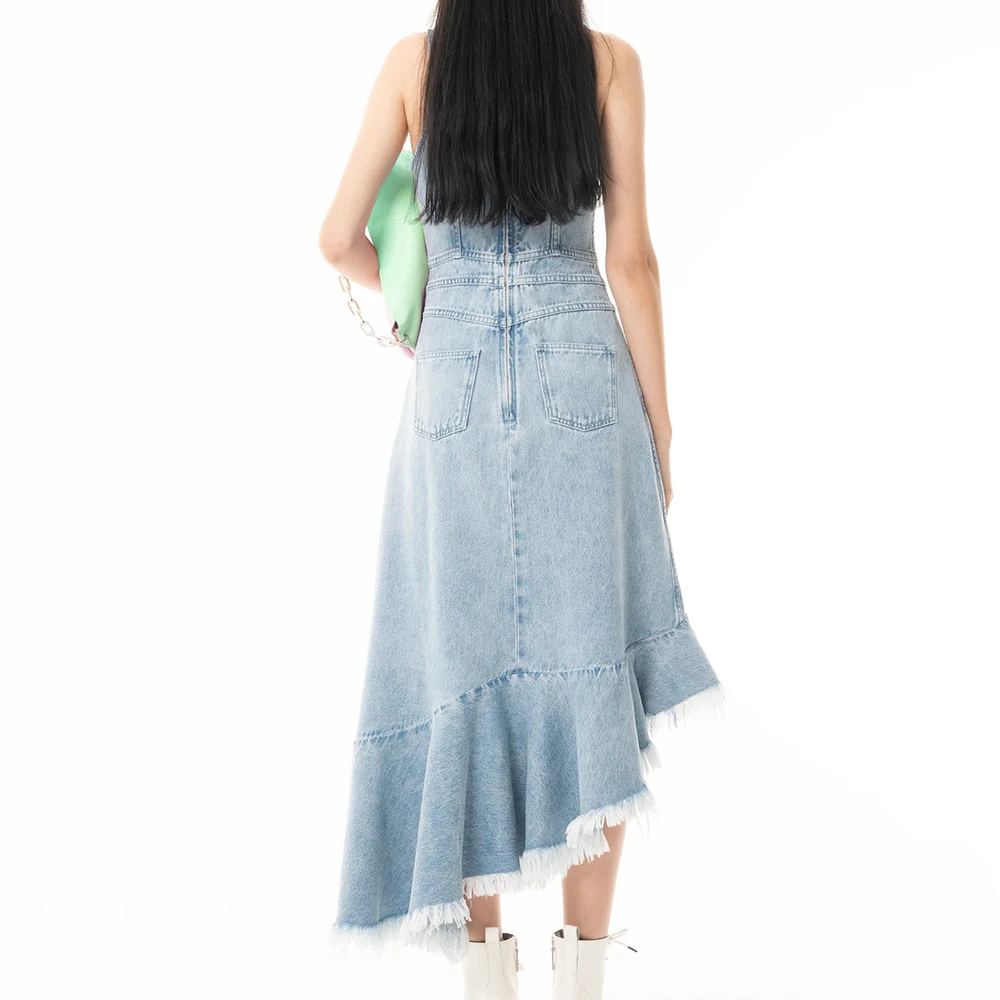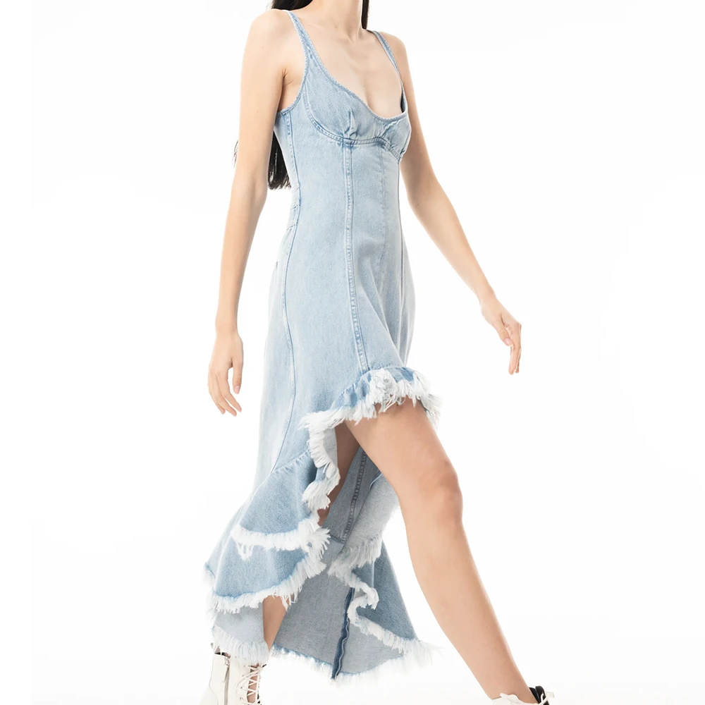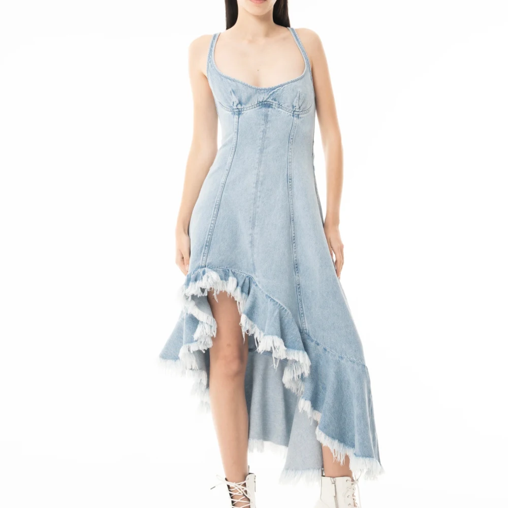 Wisrise Fashion Custom Streetwear Women's Light Wash Denim Asymmetric Slit Ruffled Fringe Hem Midi Dress