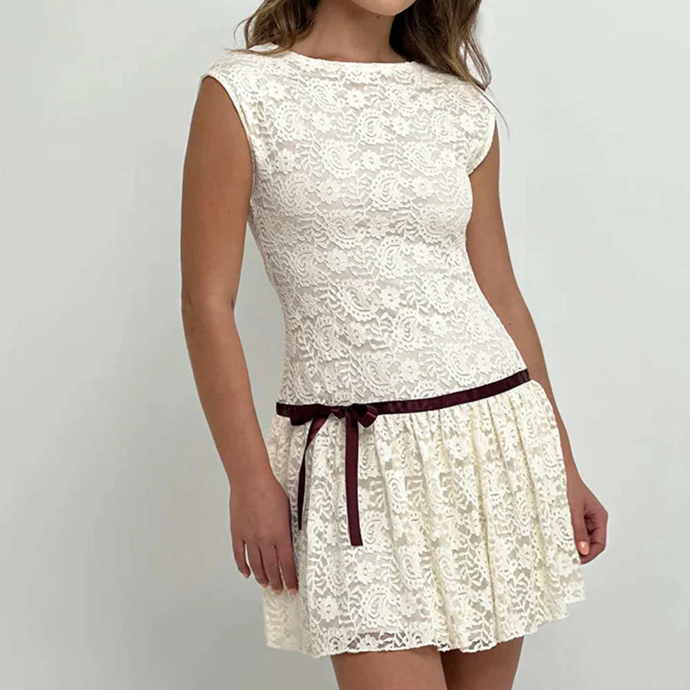 Wisrise Fashion Custom Wholesale Romantic Chic Style Lace Ivory Sleeveless Pleated Hem Mini Dress