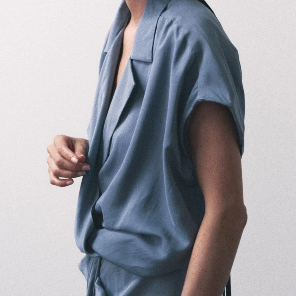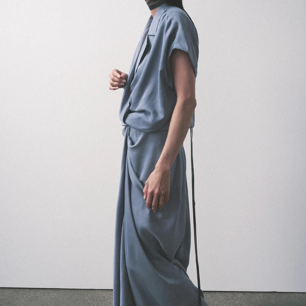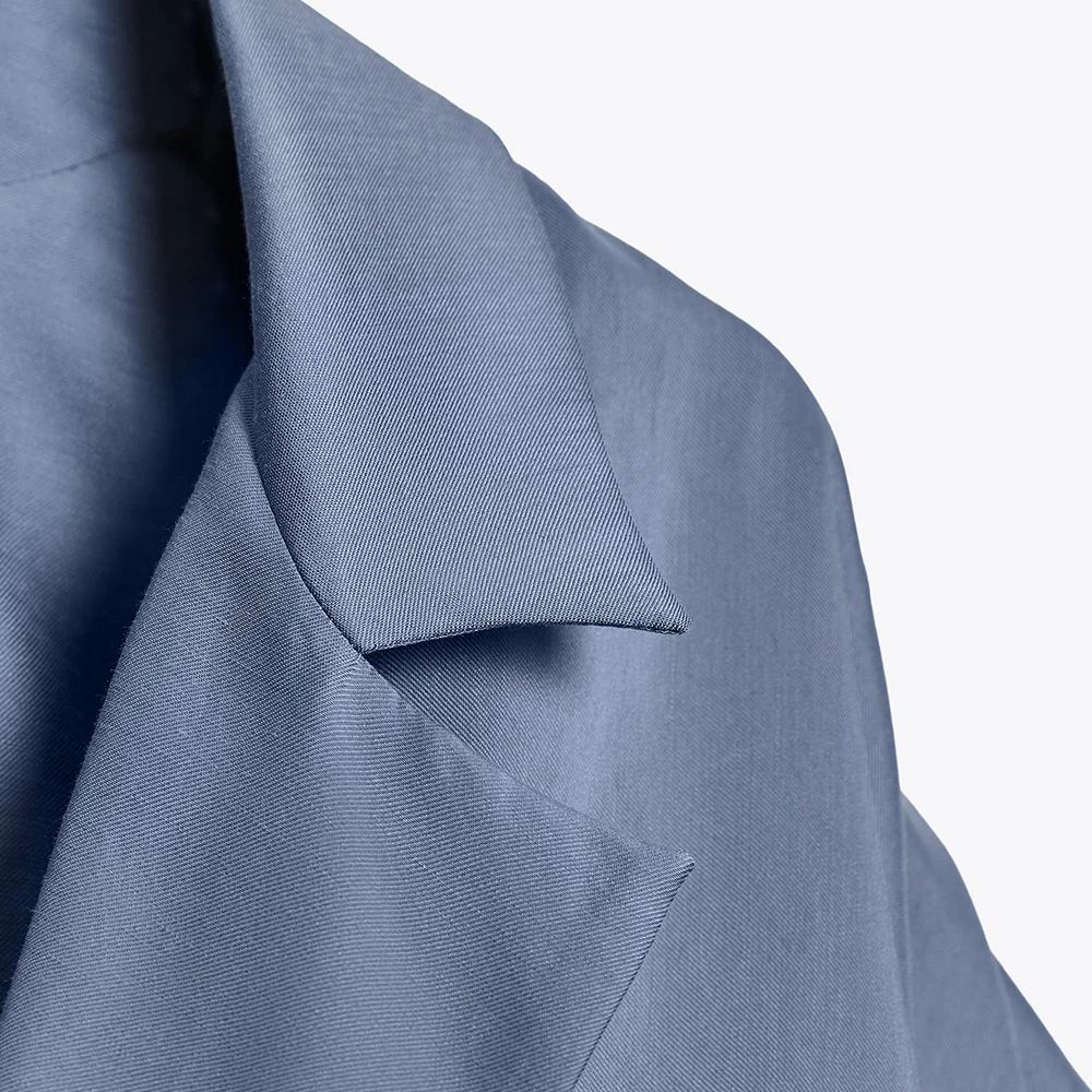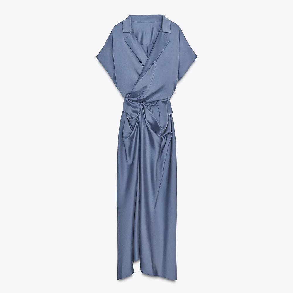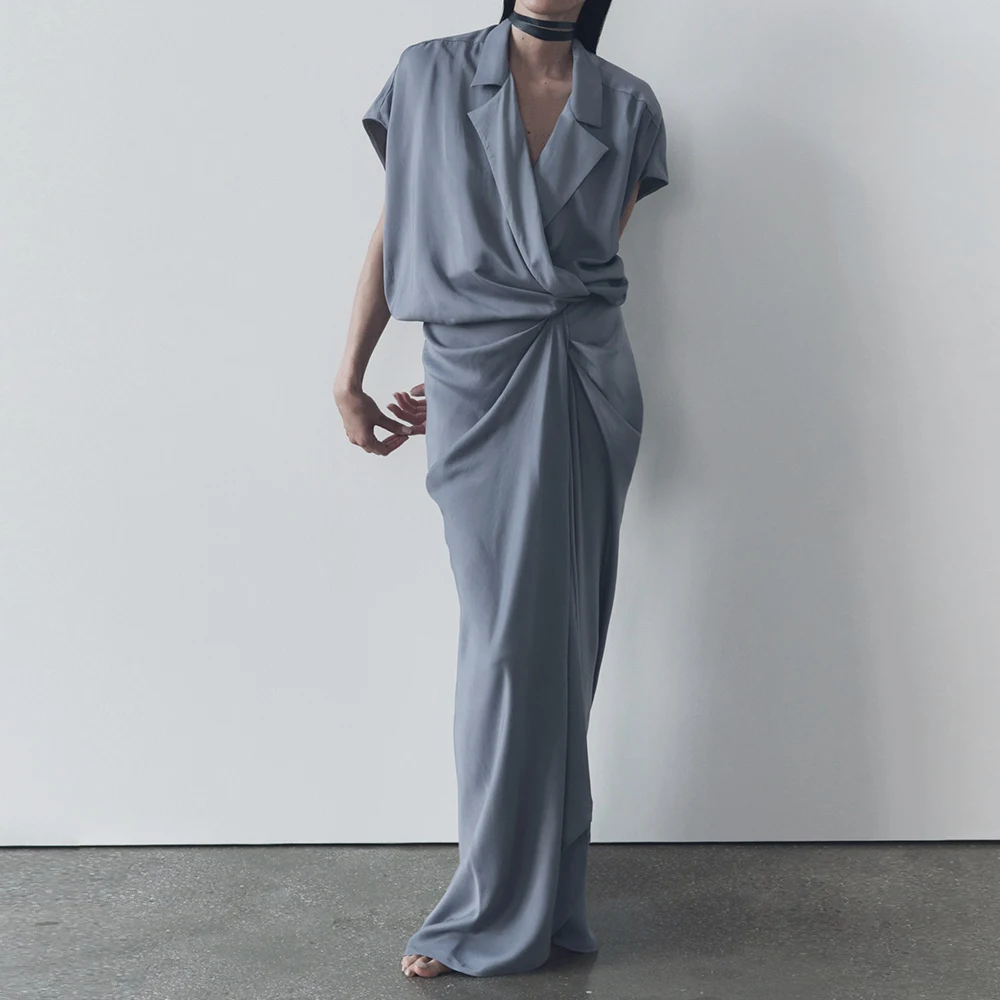 Wisrise Fashion Customize Design High Quality Women's Slate Blue Satin Lapel Asymmetric Hem Wrap Maxi Dress