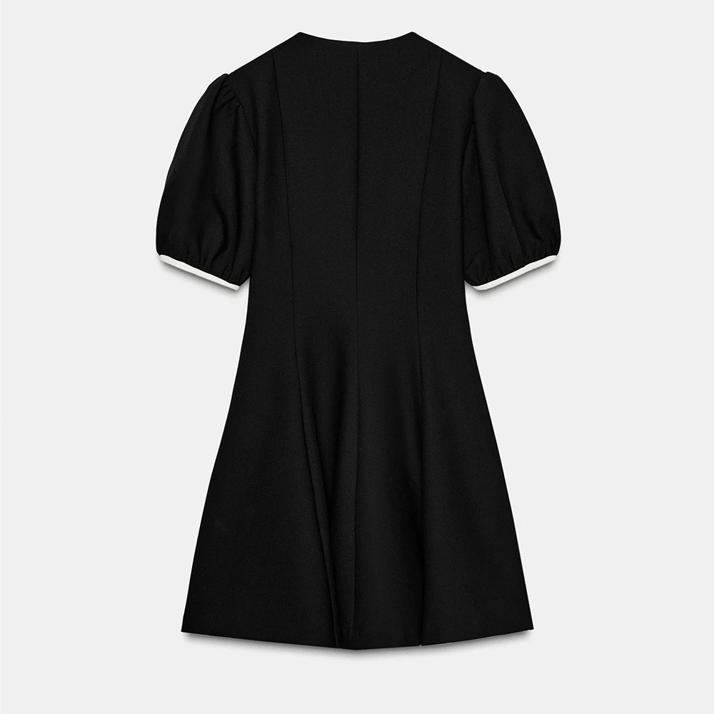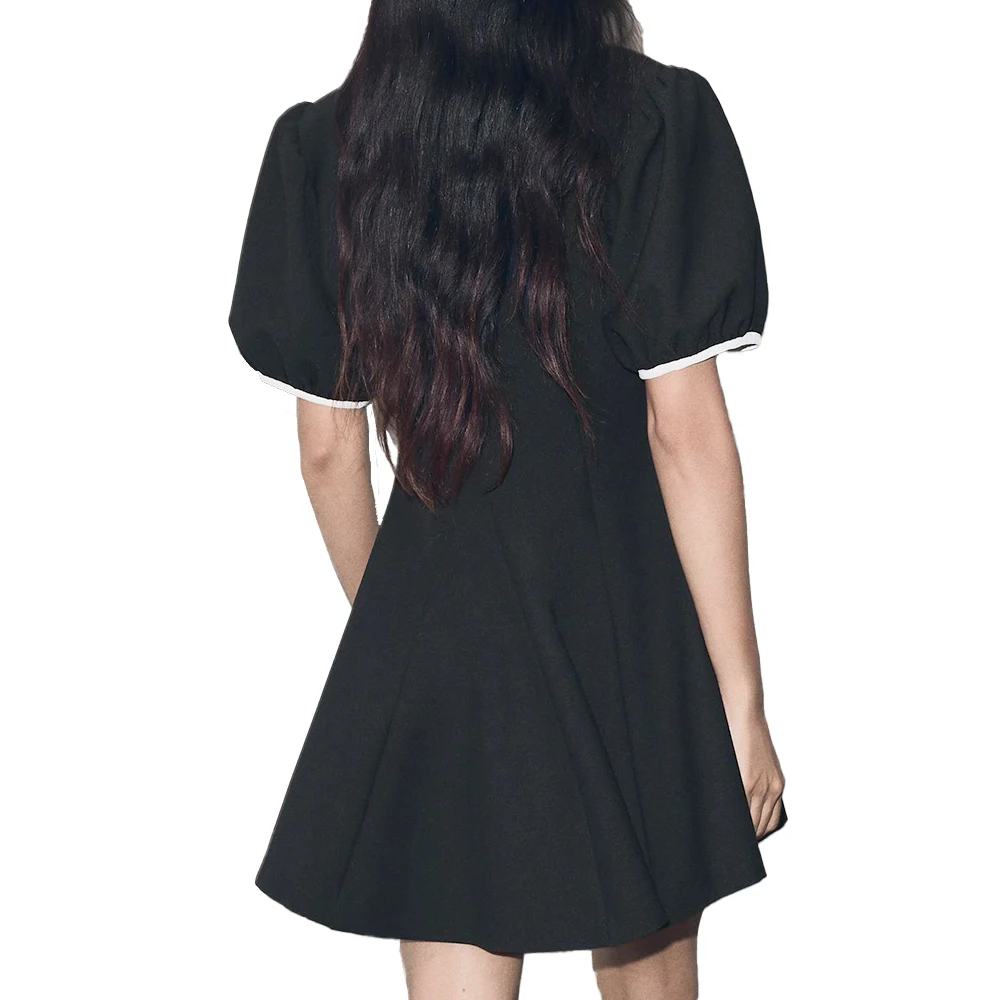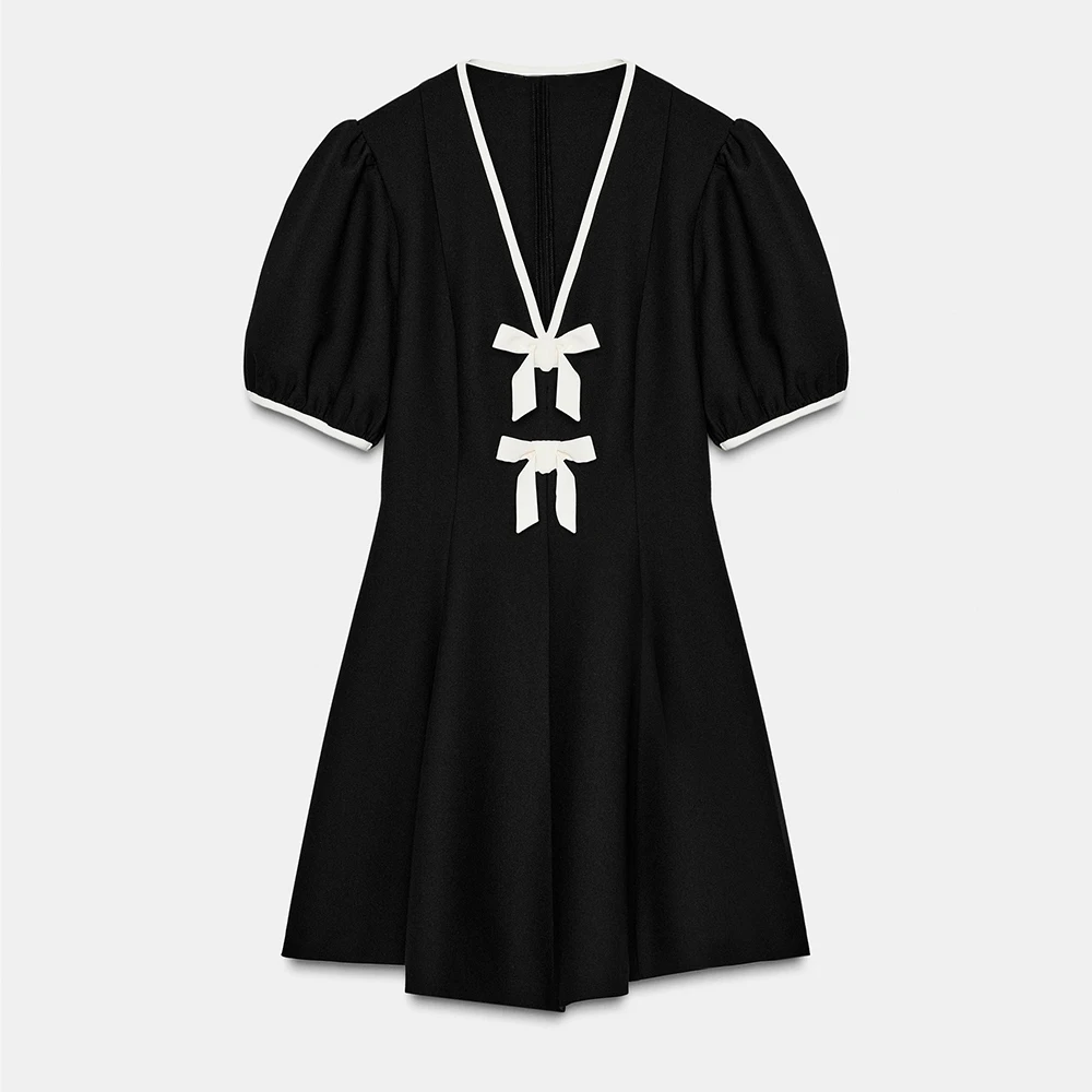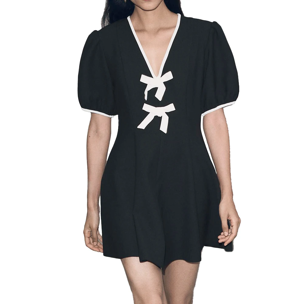 Wisrise Fashion Factory New Design White Contrast Puff Sleeve Deep V Bow Mini Dress Vintage Girly Style for Party