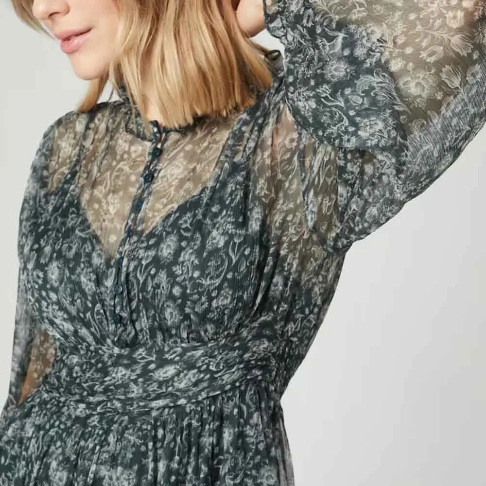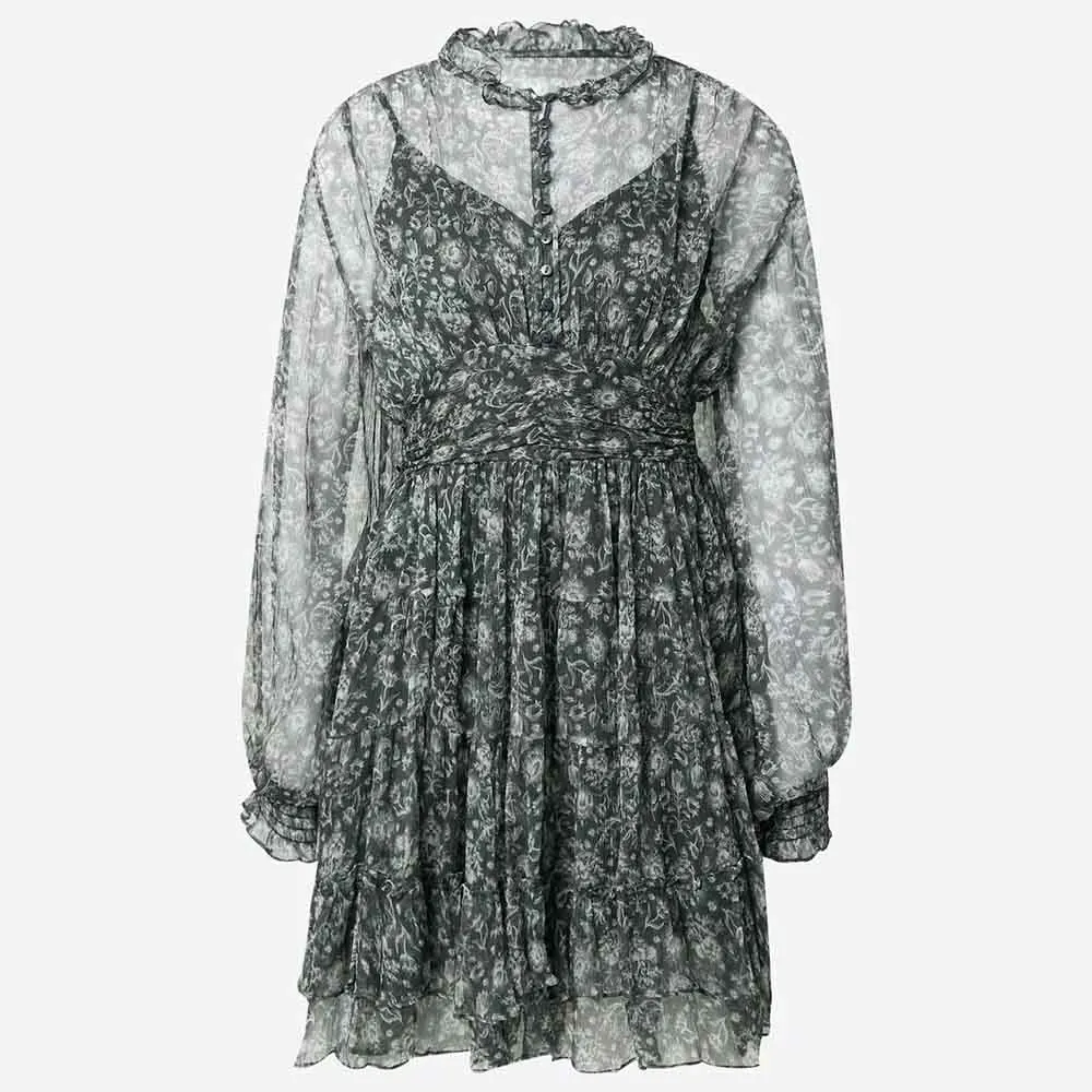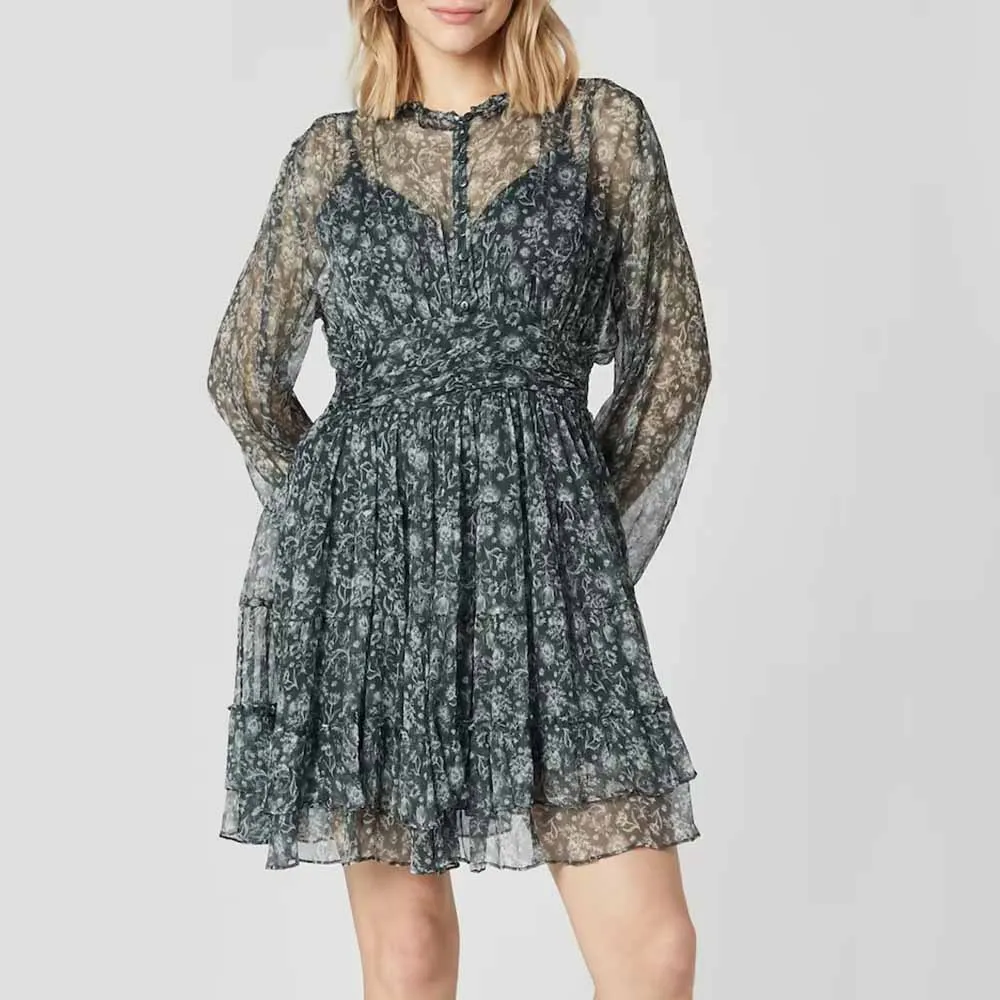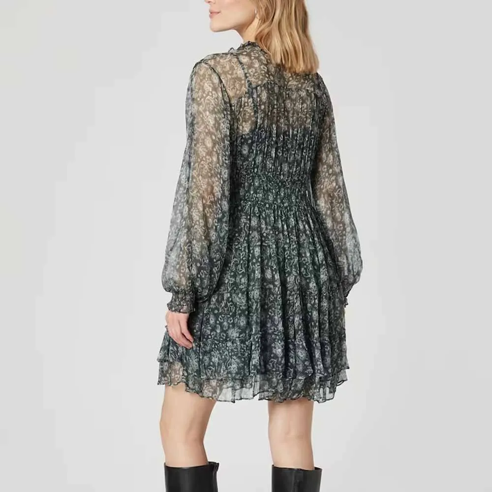 Clothing Manufacturers Custom Spring Summer Autumn Floral Elements Stand Collar Frilled Design Chiffon Women Mini Dress
