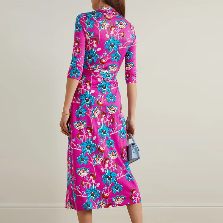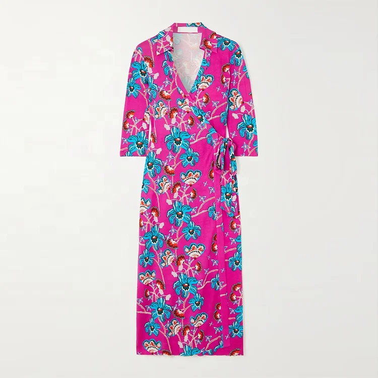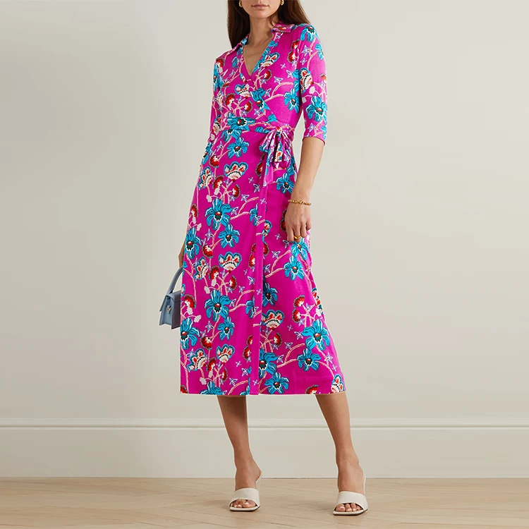 Clothing Manufacturer Custom Spring Autumn Polo Collar Long Sleeve Print Silk Wrap Women Elegant Casual Dress