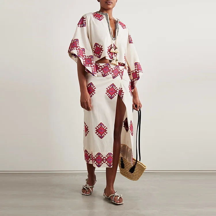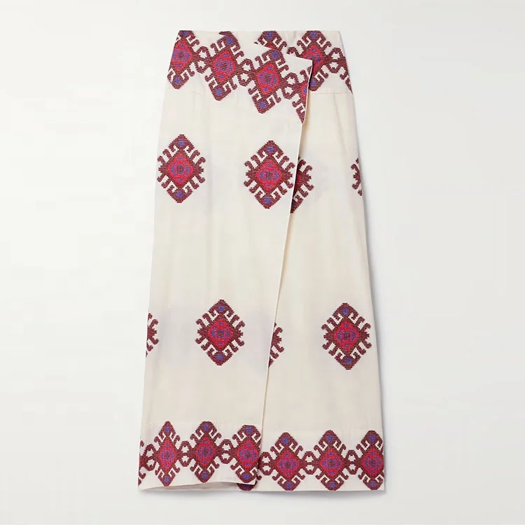 Clothing Manufacturer Custom Spring Sleeve Natural Waist Cotton Embroidered Women Elegant Casual Midi Wrap Skirt