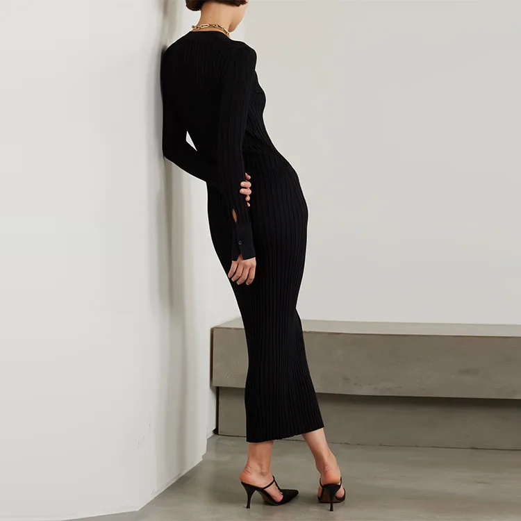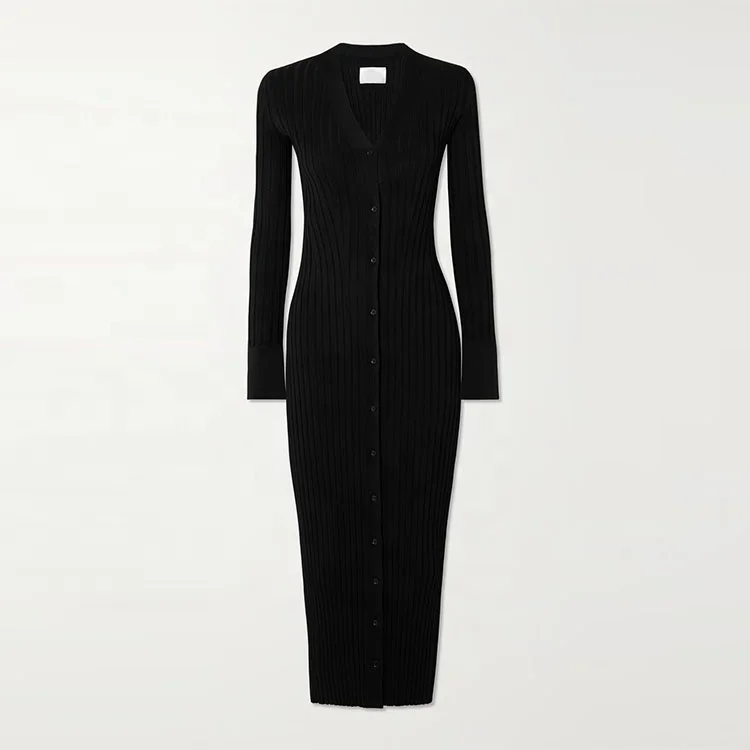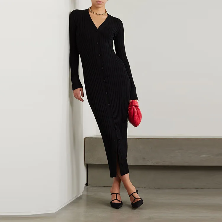Knitwear Manufacturer Custom Spring Autumn Black V Neck Long Sleeve Ribbed Knit Elegant Casual Women Sweater Midi Dress