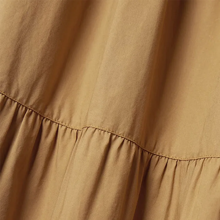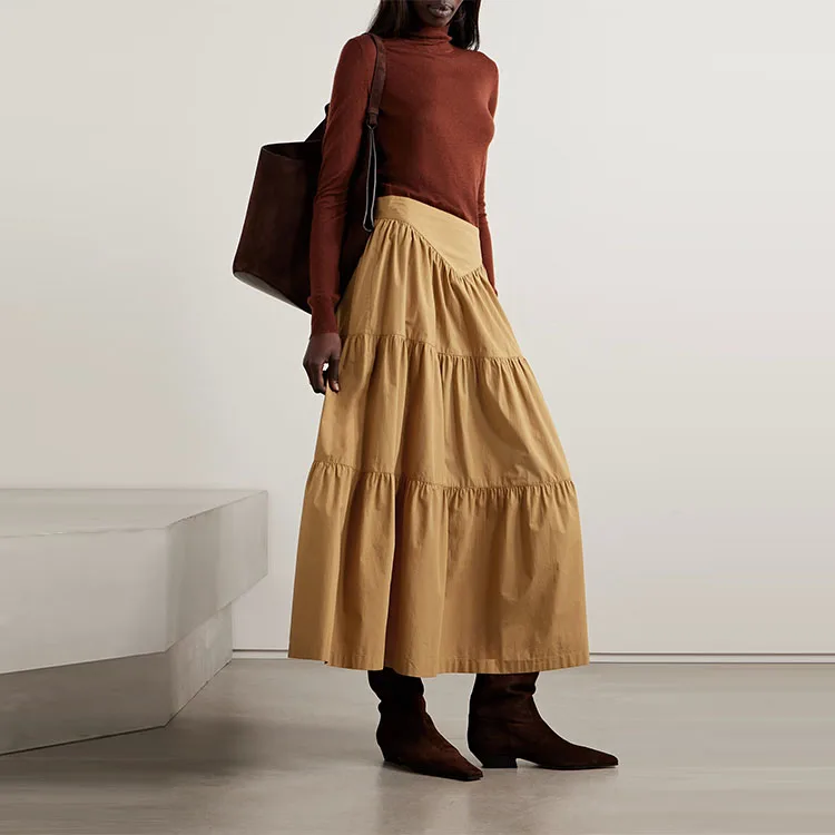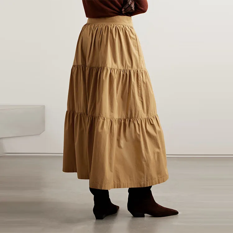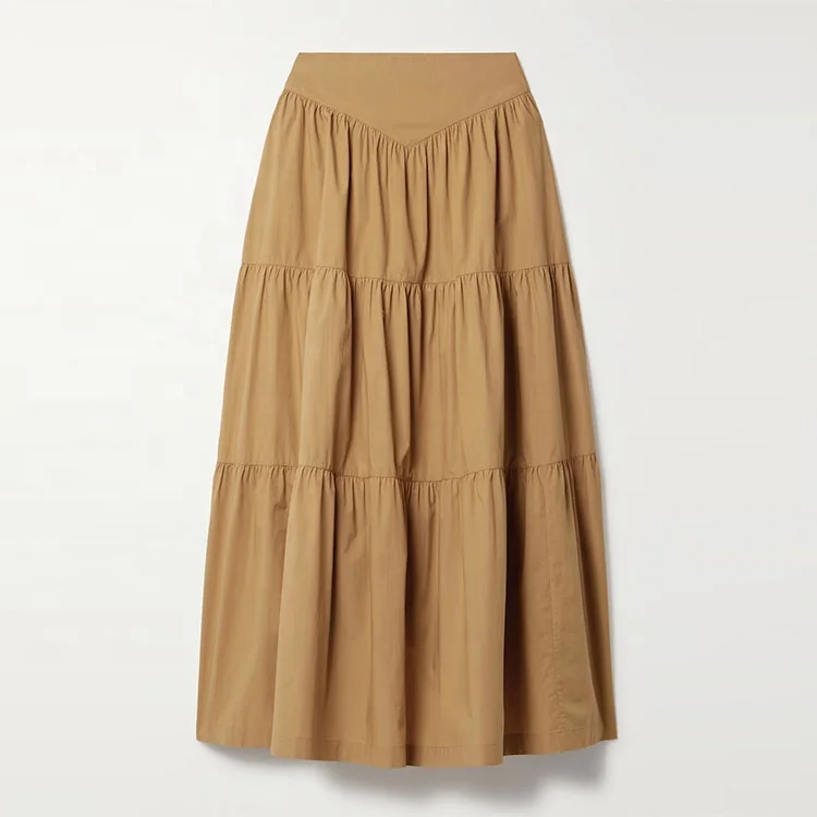 Clothing Manufacturer Custom Spring Autumn Brown High Waist Layered Elegant Casual Cotton Women Midi Skirt