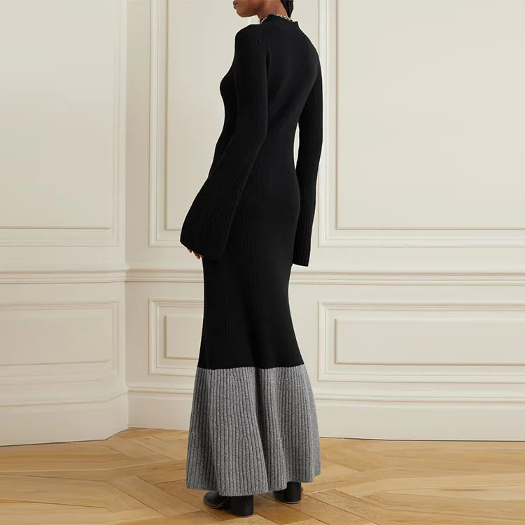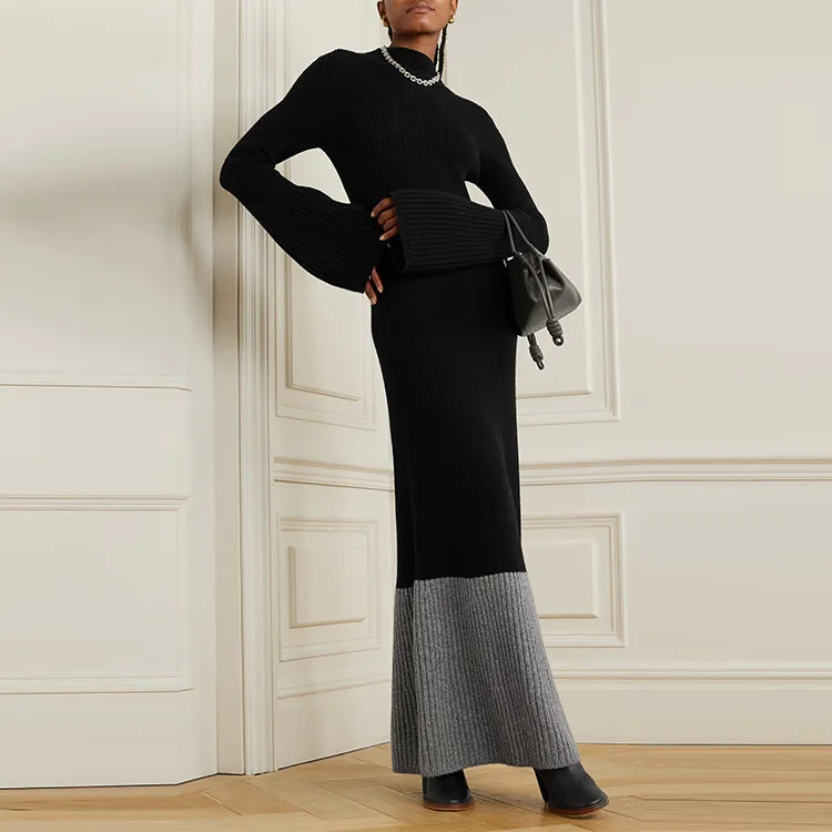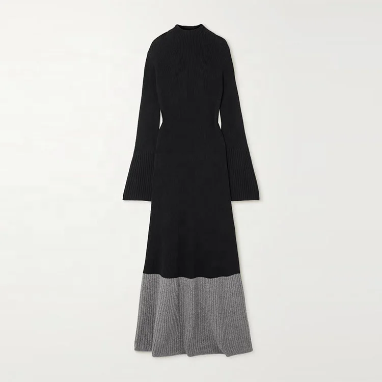 Clothing Manufacturer Custom Black Crew Neck Long Sleeve Ribbed Knit Wool Cashmere Women Sweater Dress
