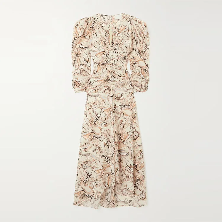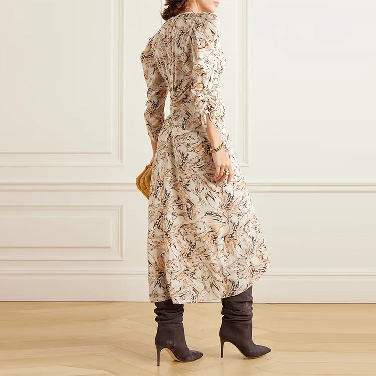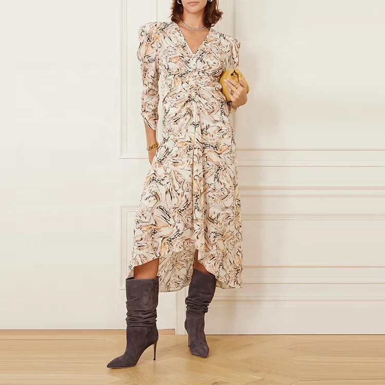 Clothing Manufacturer Spring Autumn Custom Beige v Neck Long Sleeve Print Elegant Casual Women Midi Dress