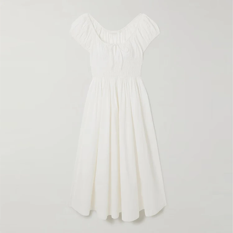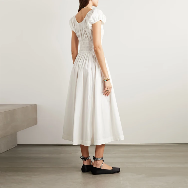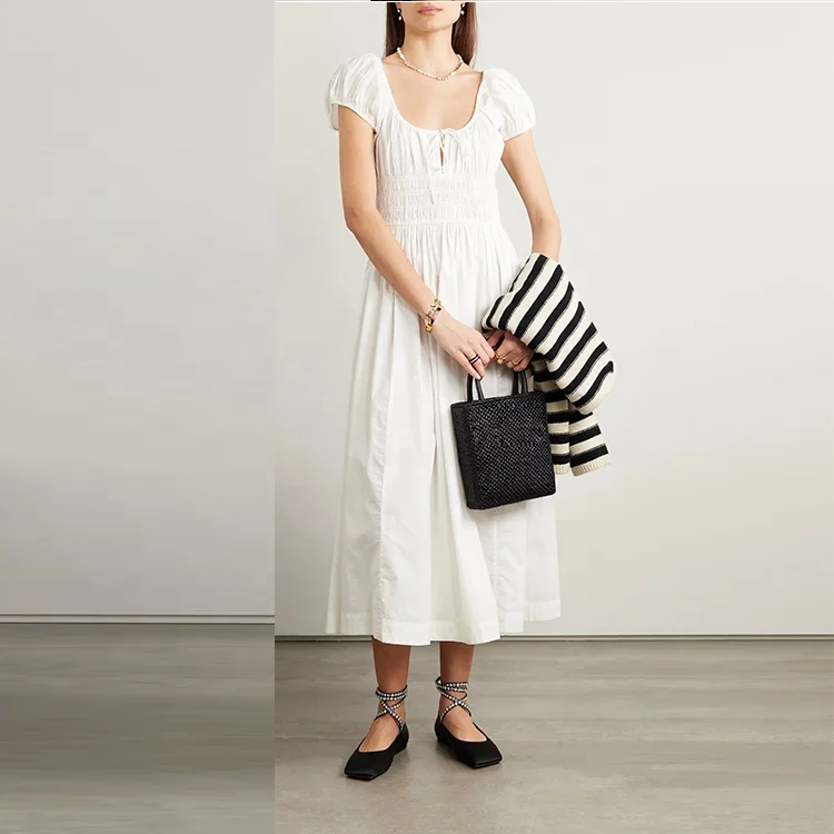 Clothing Manufacturer Custom Spring Summer Square Neck Short Sleeve Elegant Casual Women White Cotton Midi Dress