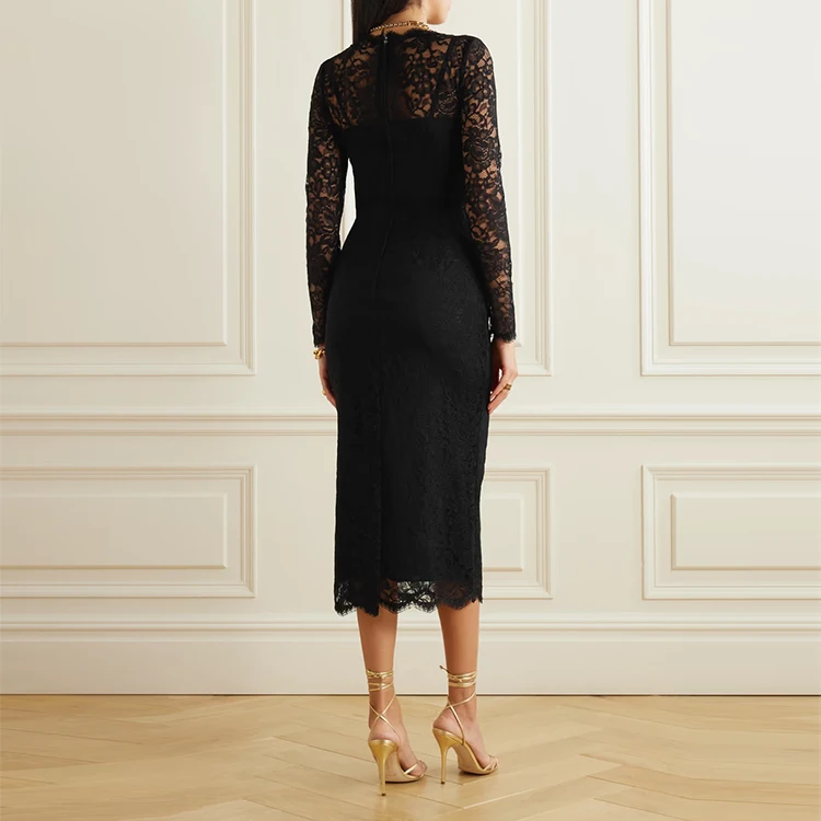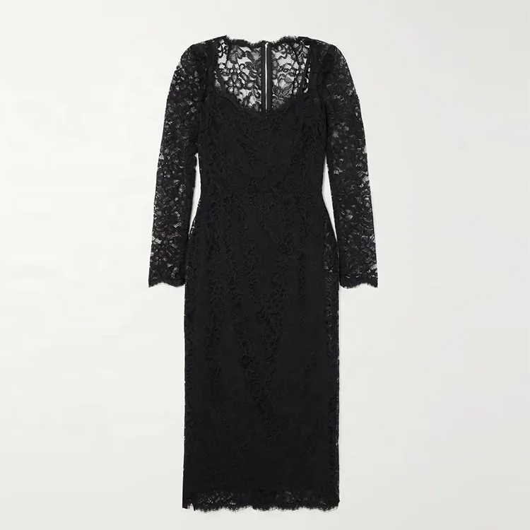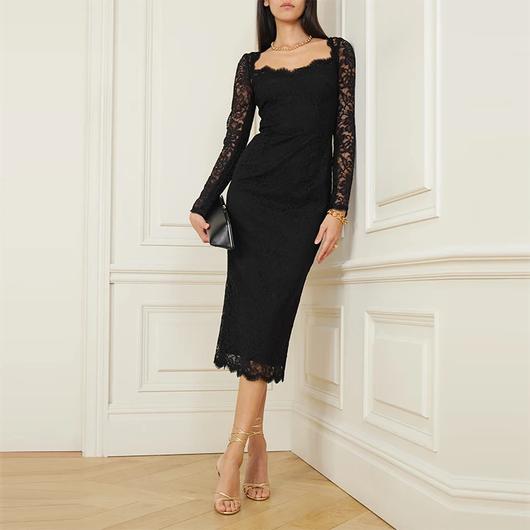 Clothing Manufacturer Custom Spring Summer Black square Neck Long Sleeve Elegant Casual Women Corded Lace Midi Dress