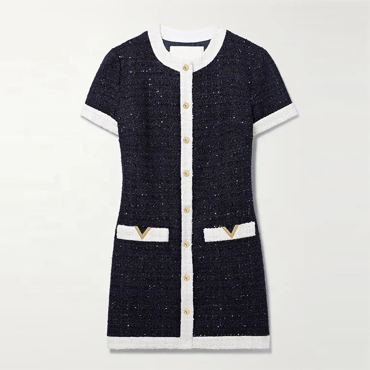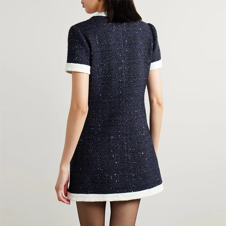 Clothing Manufacturer Custom Spring Summer Black Crew Neck Short Sleeve Elegant Casual Women Tweed Beaded Dress