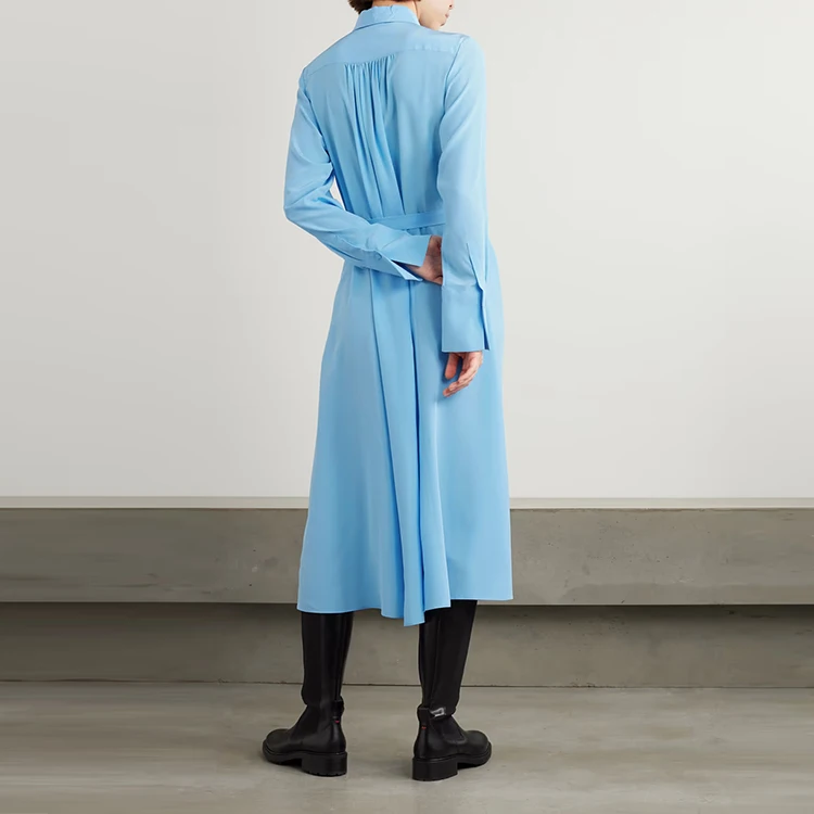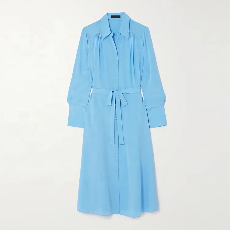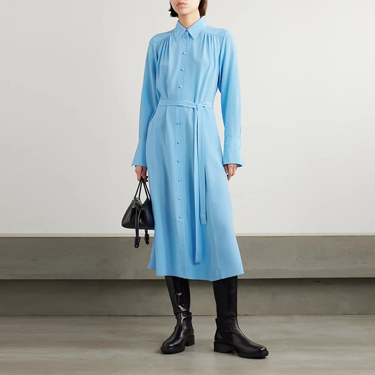 Clothing Manufacturer Custom Spring Autumn Polo Collar Long Sleeve Tie Elegant Casual Women Midi Shirt Dress