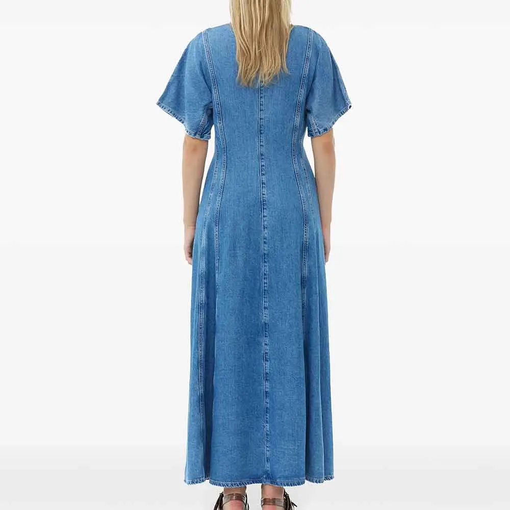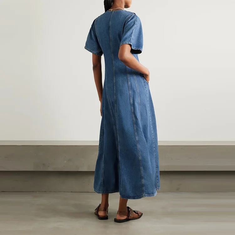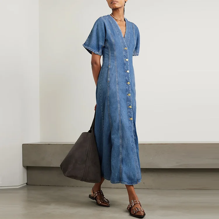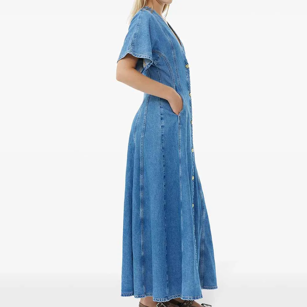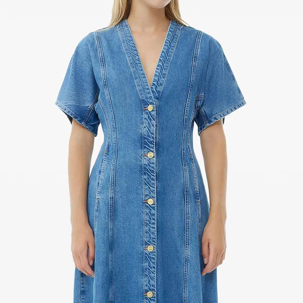 Clothing Manufacturer Custom Spring Summer Light Blue v Neck Short Sleeve Elegant Casual Cotton Jean Dresses Denim Women