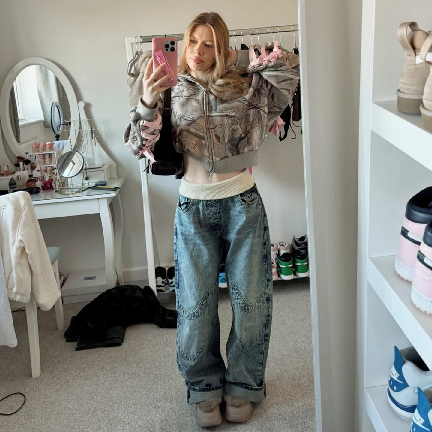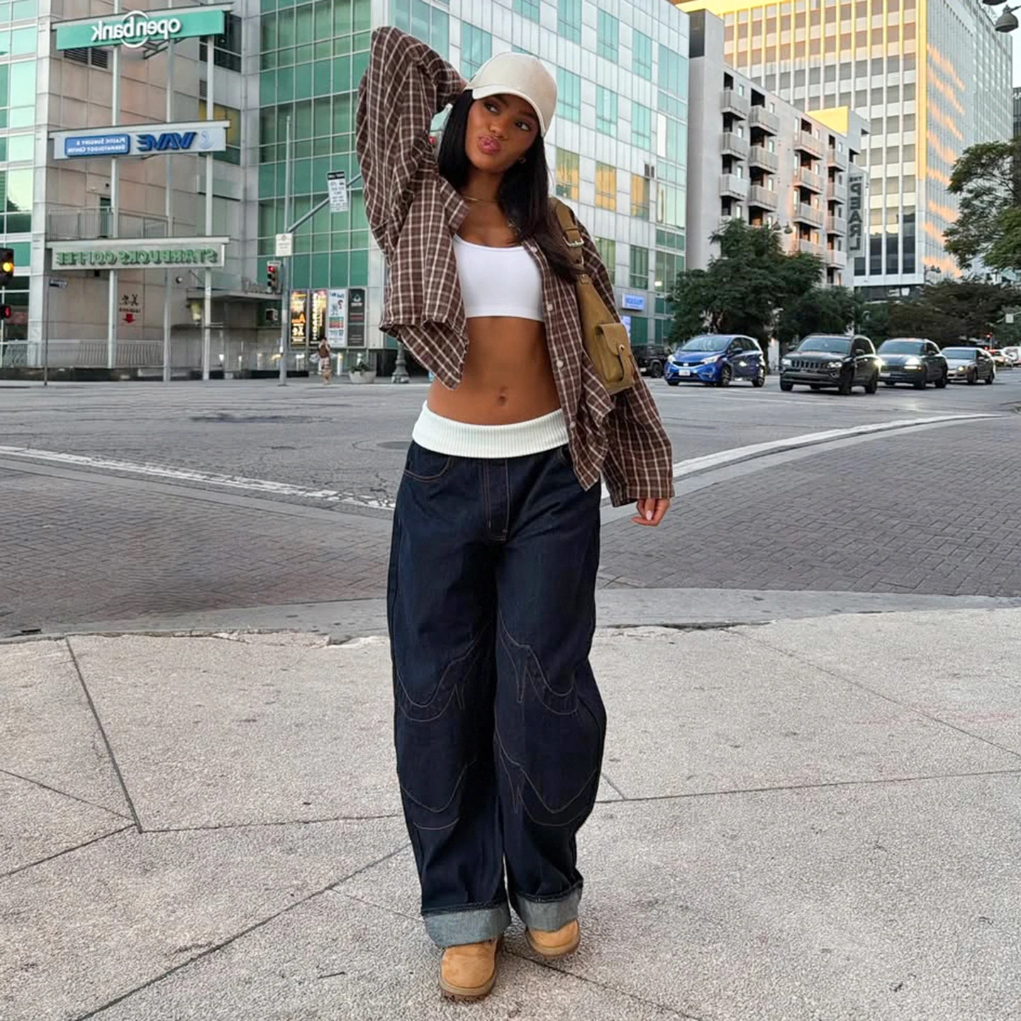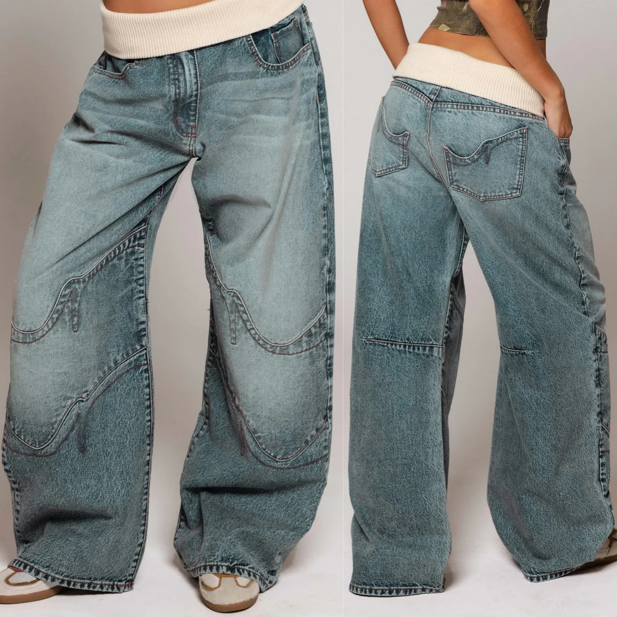 Ribbed patchwork denim elastic waistband personalized stitching loose wide-leg pants high street Hip Hop Jeans