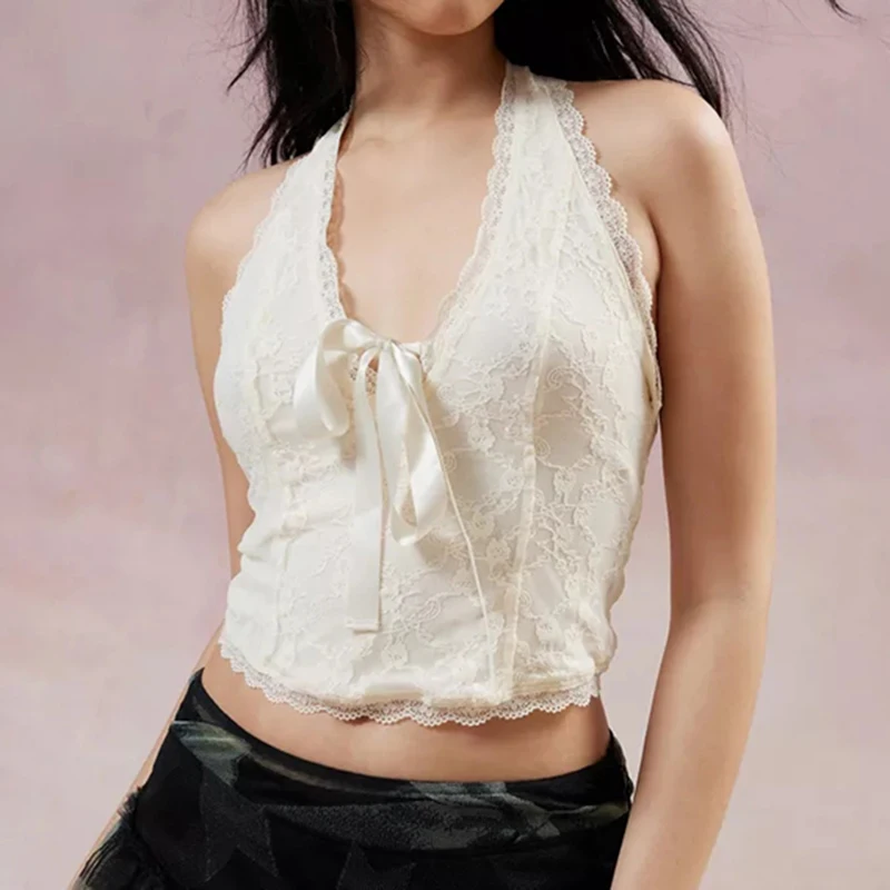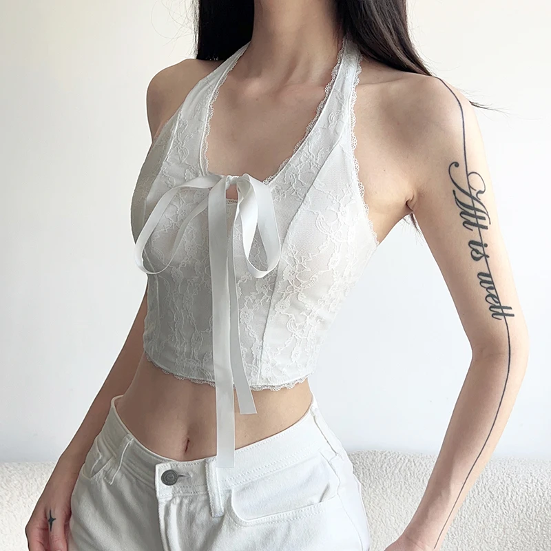 Lace halter neck, backless, chest ribbon crop vest white simple sexy sweet base layer vest