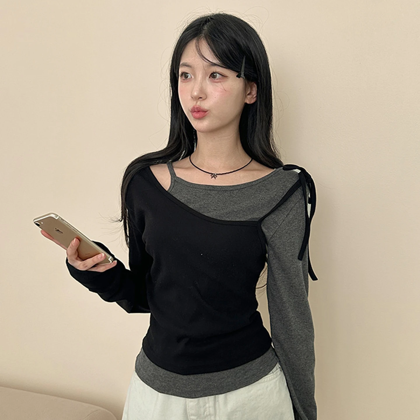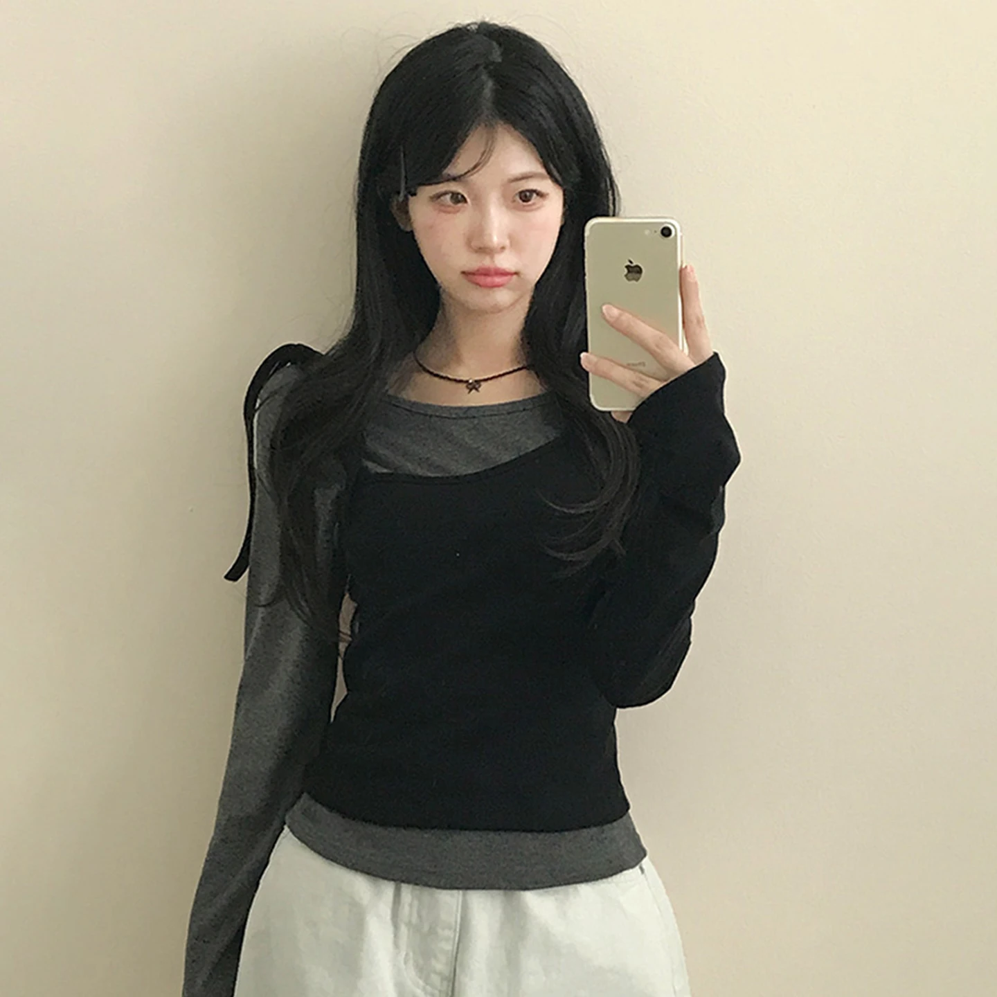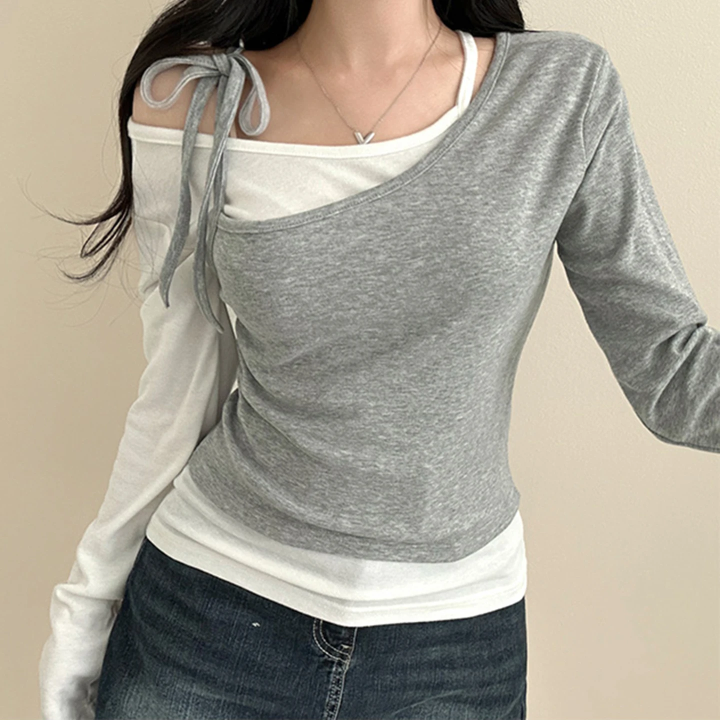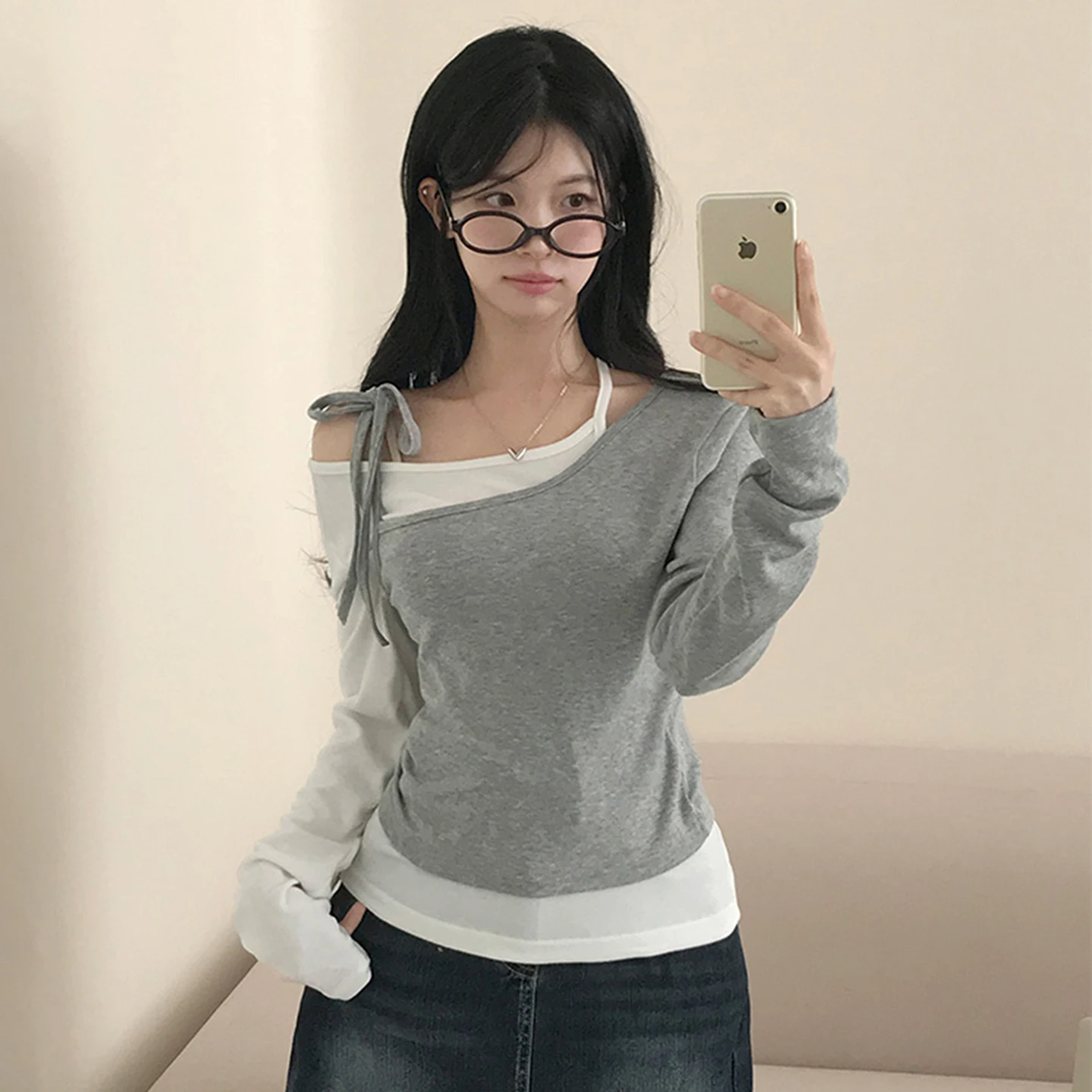 Women Contrast Color Layered Knit Cropped Long Sleeve T Shirt Round Neck Slim Fit Y2K Casual Street Fashion Top