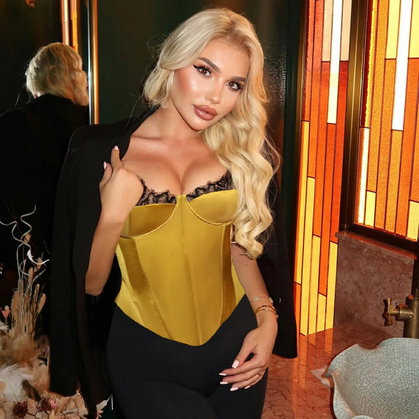 Lace-trimmed breast pads bustier asymmetrical waist shaping slim fit adjustable shoulder strap inner sexy satin crop vest