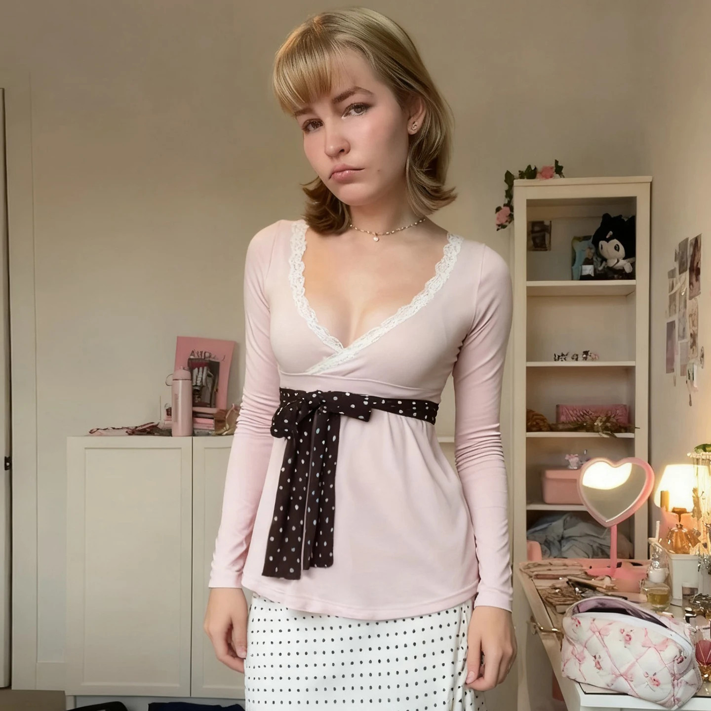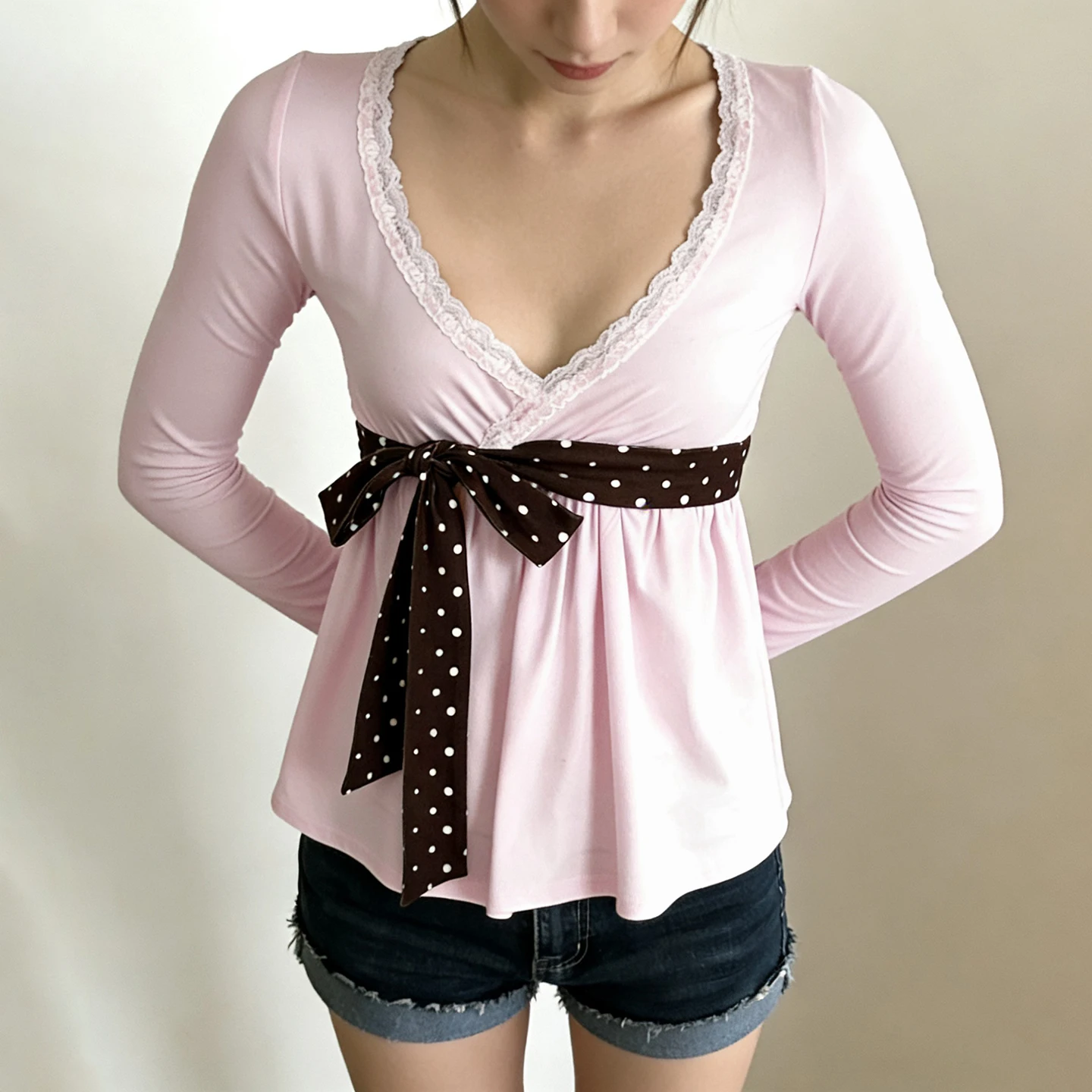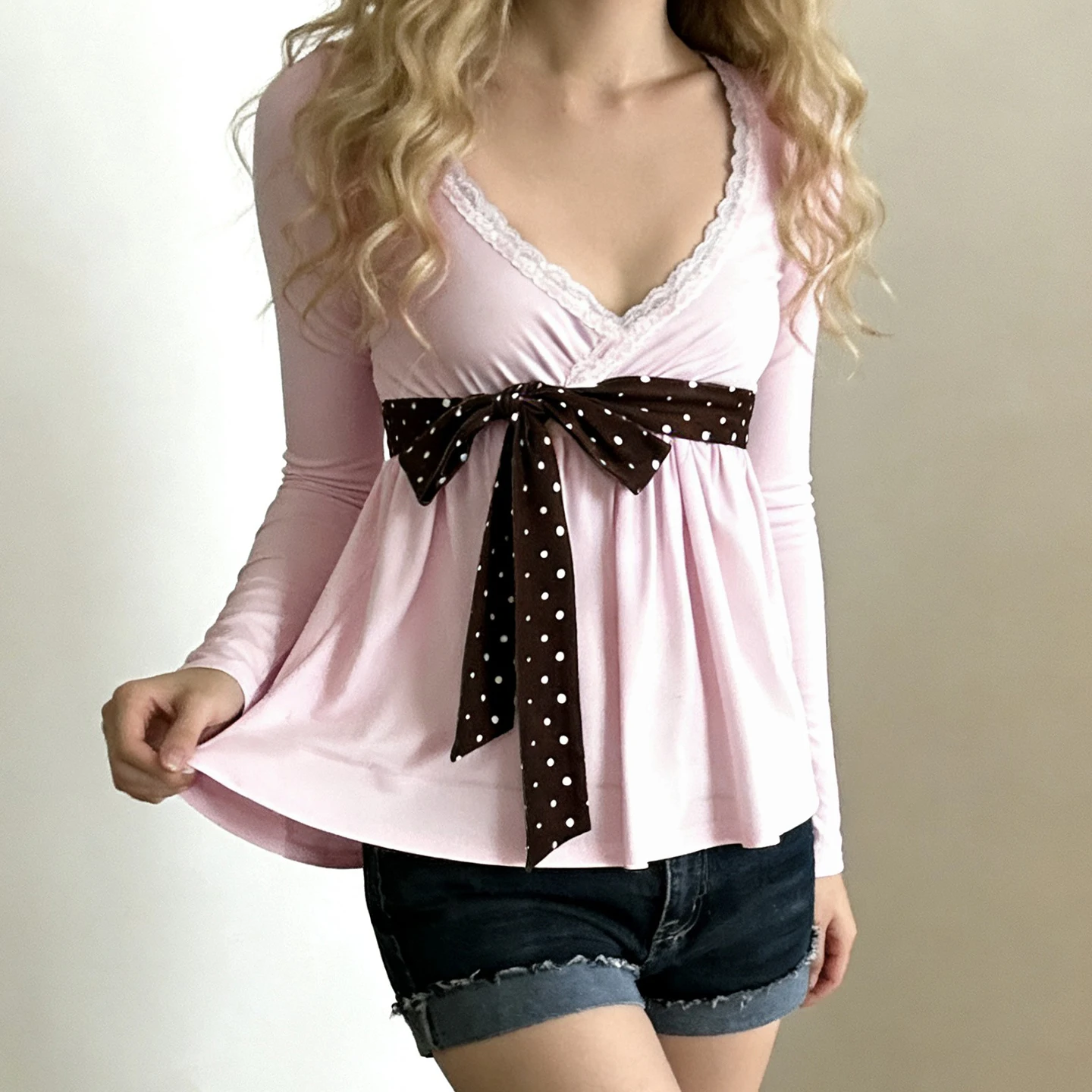 Lace Trim Polka Dot Tie-Up V-Neck A-Line T-Shirt Top Sweet Casual Y2K Street Style Versatile Wear