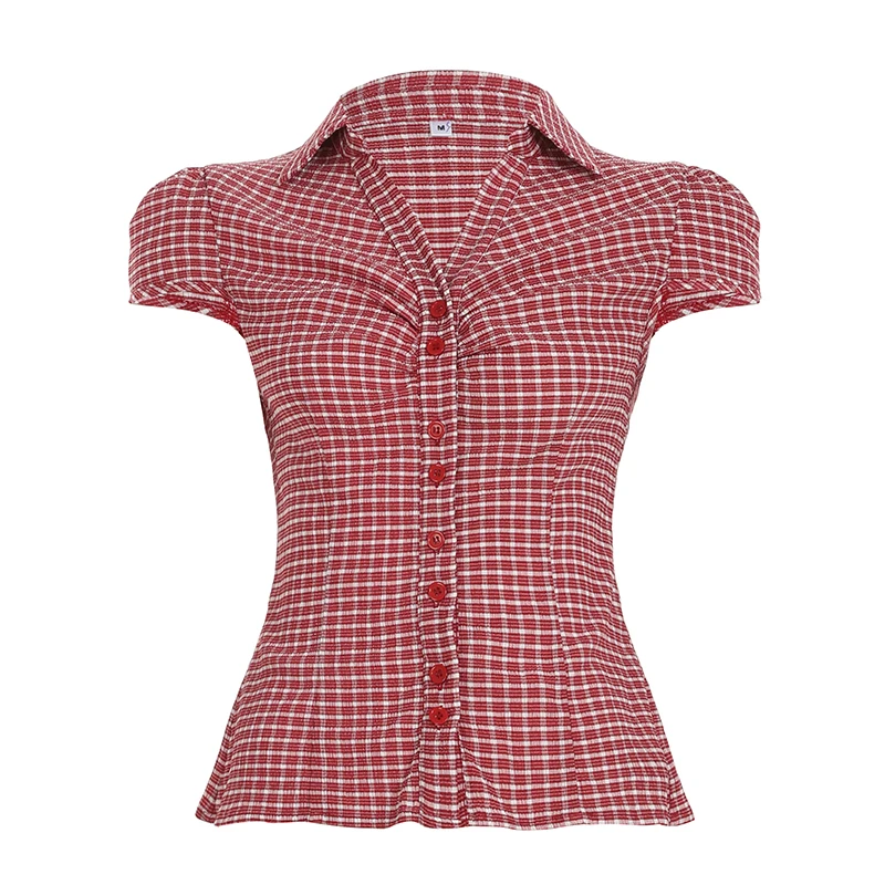 red plaid lapel V-neck single-breasted waist shaping short-sleeved shirt Casual Street Style Summer Shirts