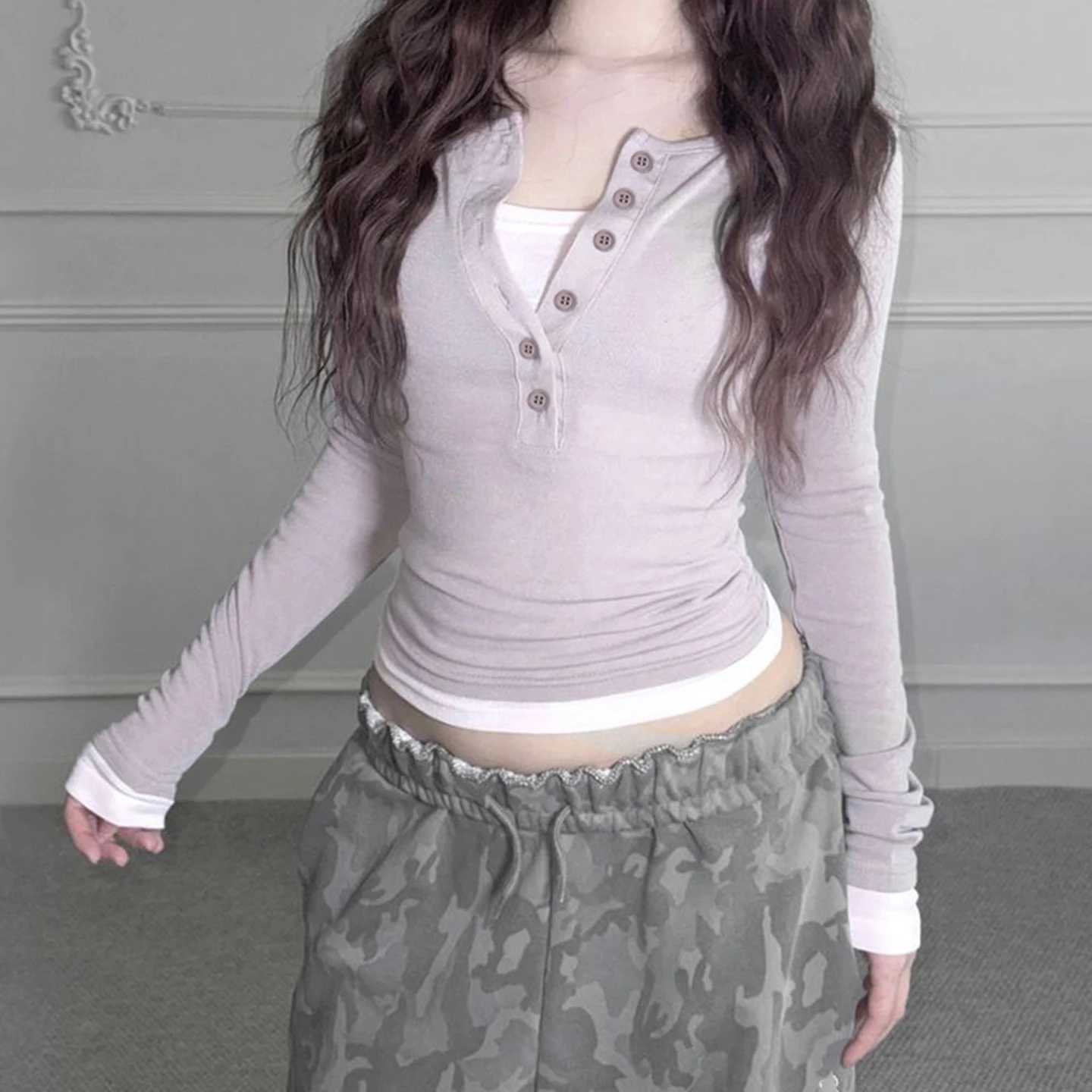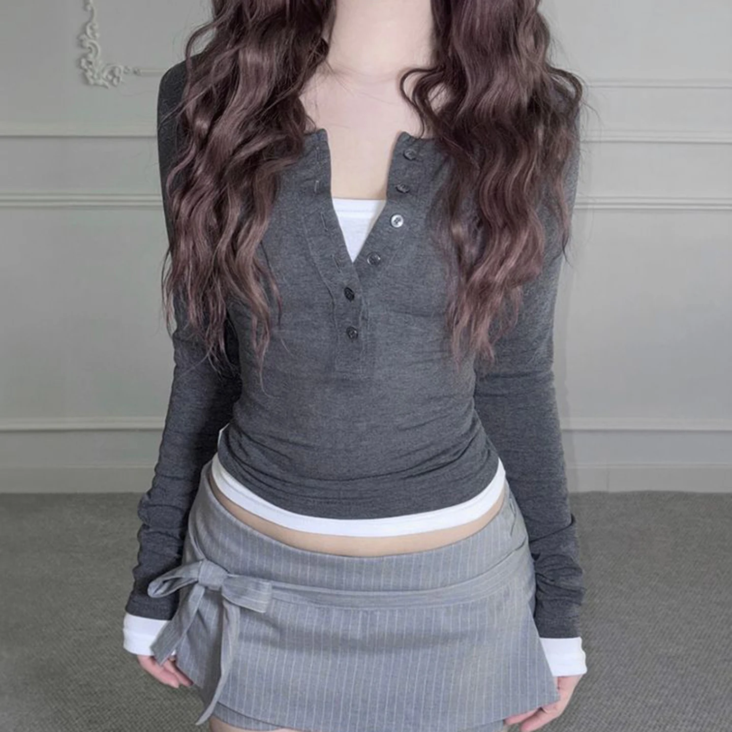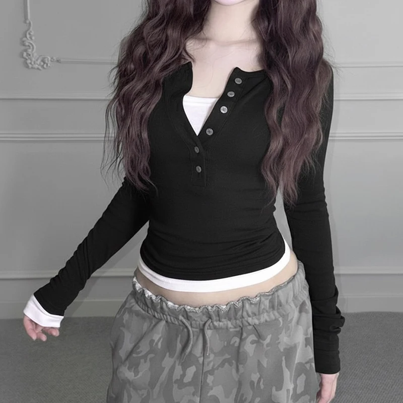 Contrast Color Layered Style Knit T Shirt Women V Neck Long Sleeve Top Autumn Winter Casual Fashion Blouse