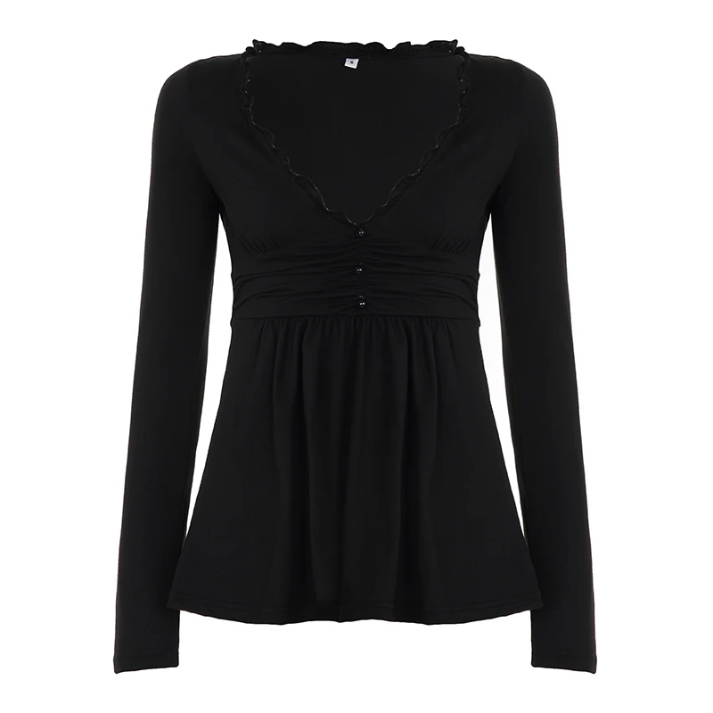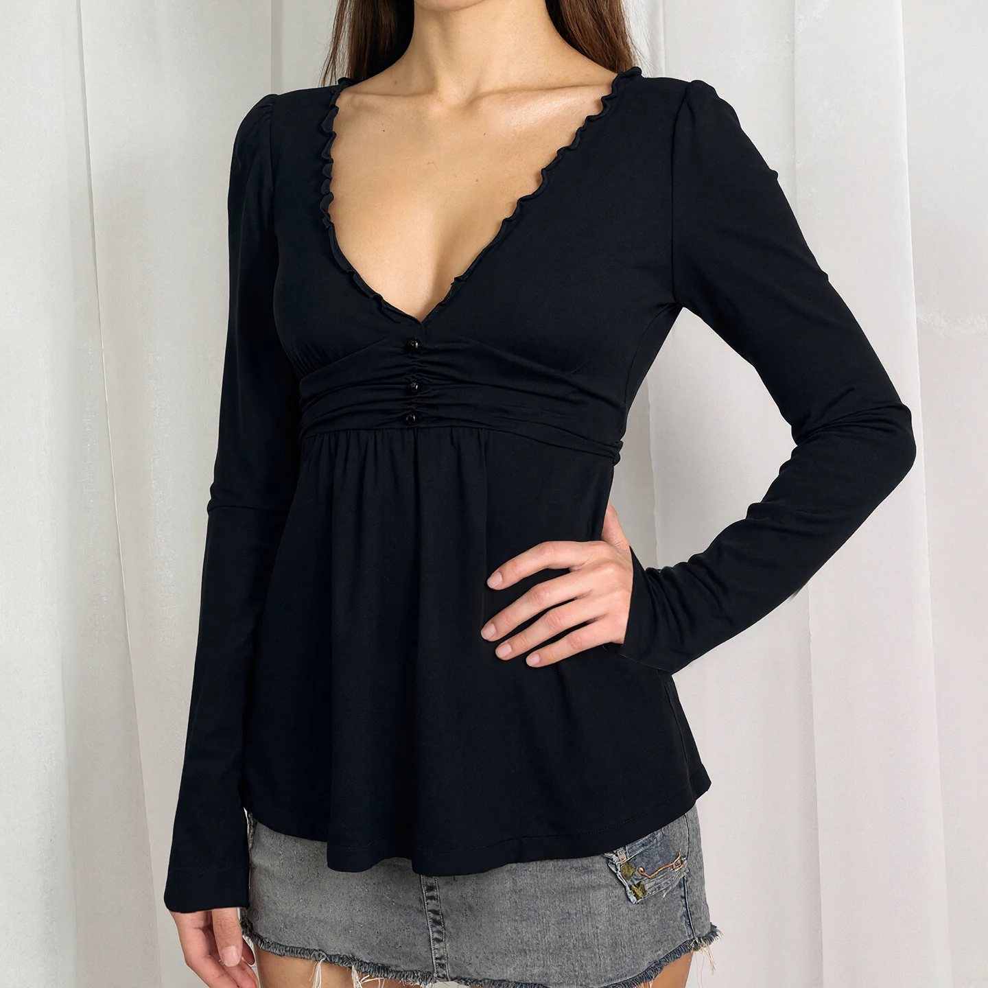 Ruffled V-Neck Long Sleeve Knit Top Women Slim Fit Waist Pleated T-Shirt Elegant Casual Chic Daily Fashion Wear