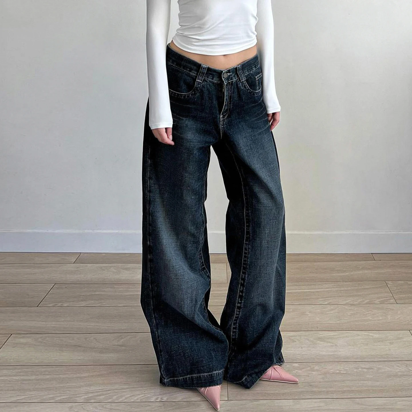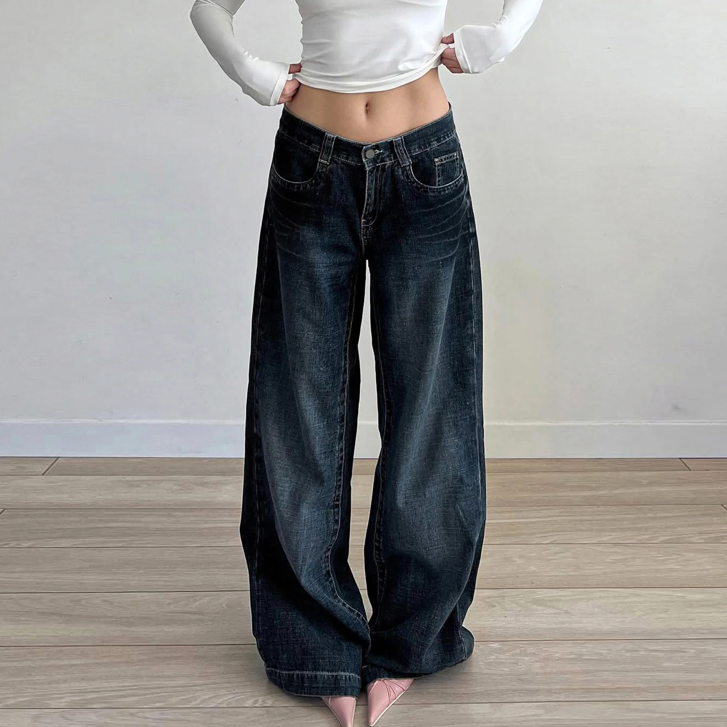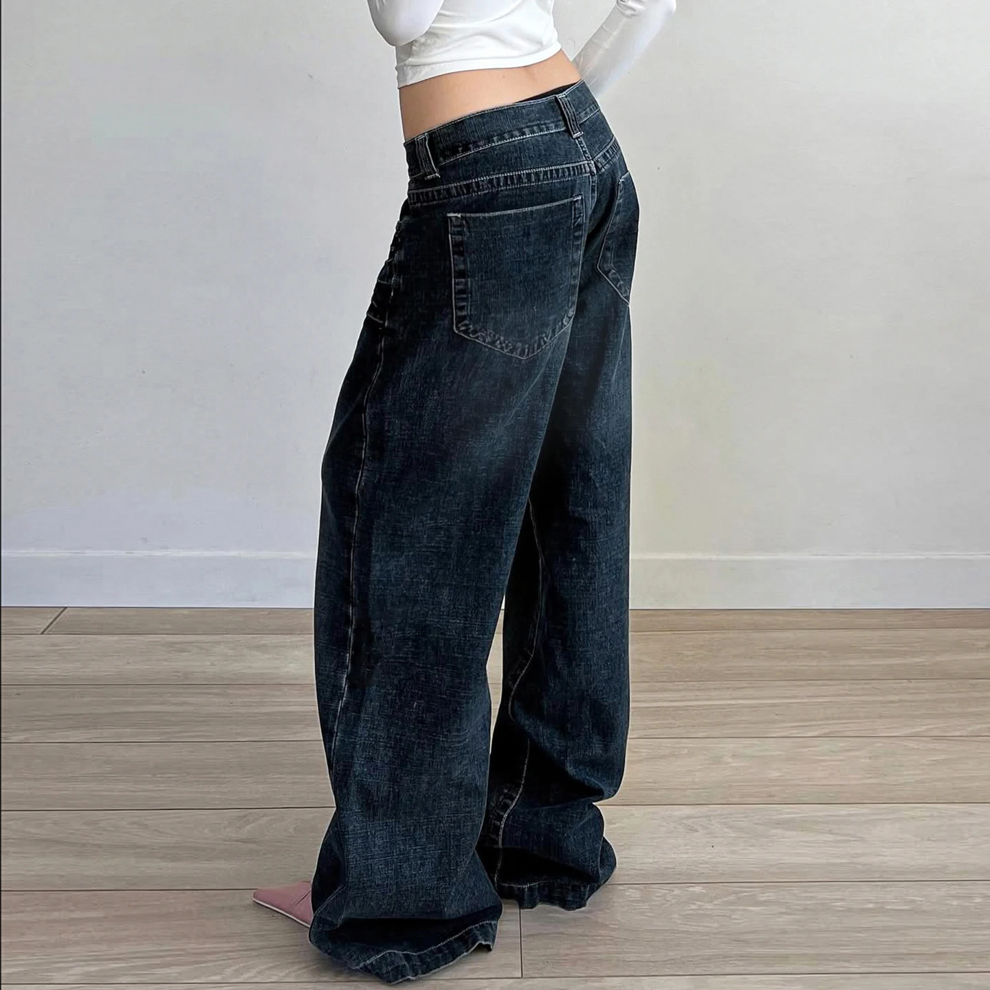 Women Dark Blue Wash Wide Leg Jeans with pockets Low Waist Straight Loose Fit Casual Floor-Length Trousers Retro Streetwear