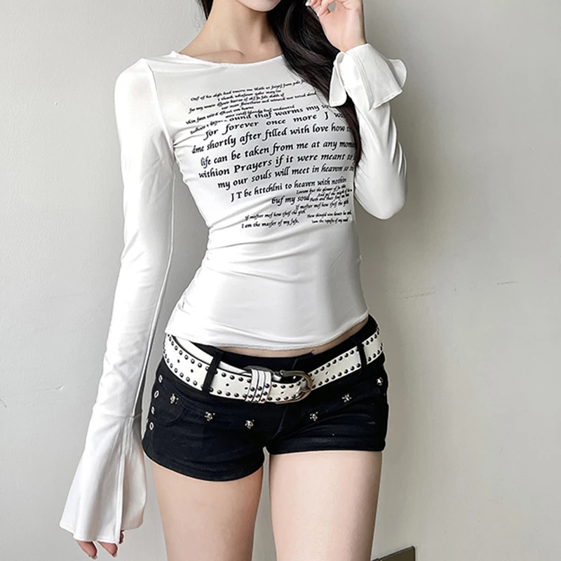 Letter Print Long Sleeve Round Neck T Shirt with Split Flared Sleeves, Casual Versatile Women's Top